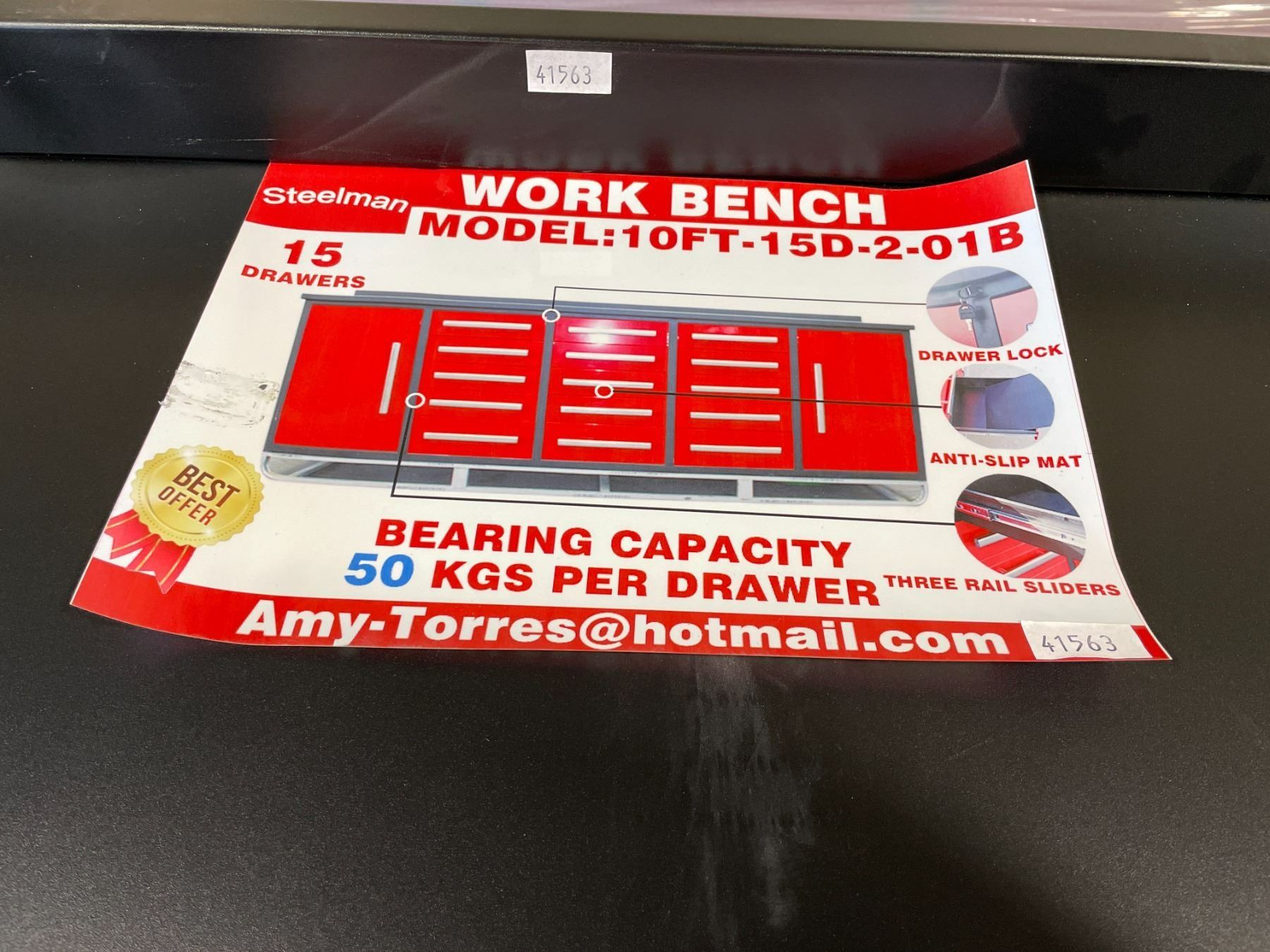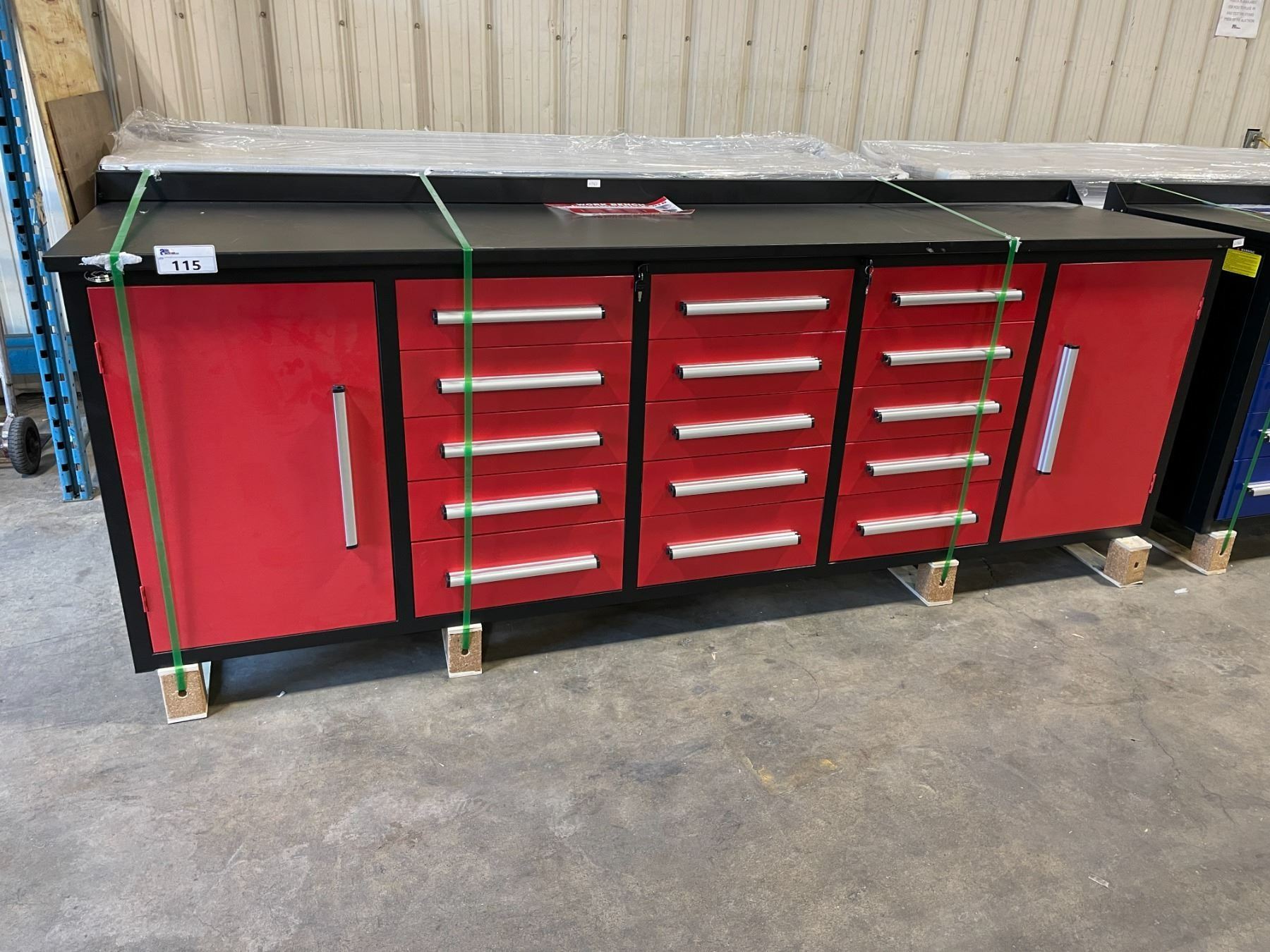 RED STEELMAN 15 DRAWER 2 DOOR WORK BENCH H36" X W113" X D29" WITH ANTI-SLIP LINING LOCKING DRAWERS AND KEY, AND THREE RAIL SLIDERS WITH 50KG CAPACITY PER DRAWER