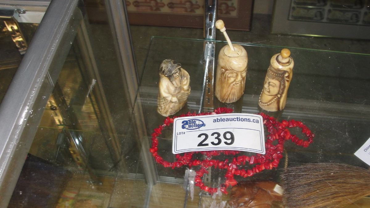 RED STONE NECKLACE AND 3 ORIENTAL CARVINGS, 2 ARE SNUFF BOTTLES