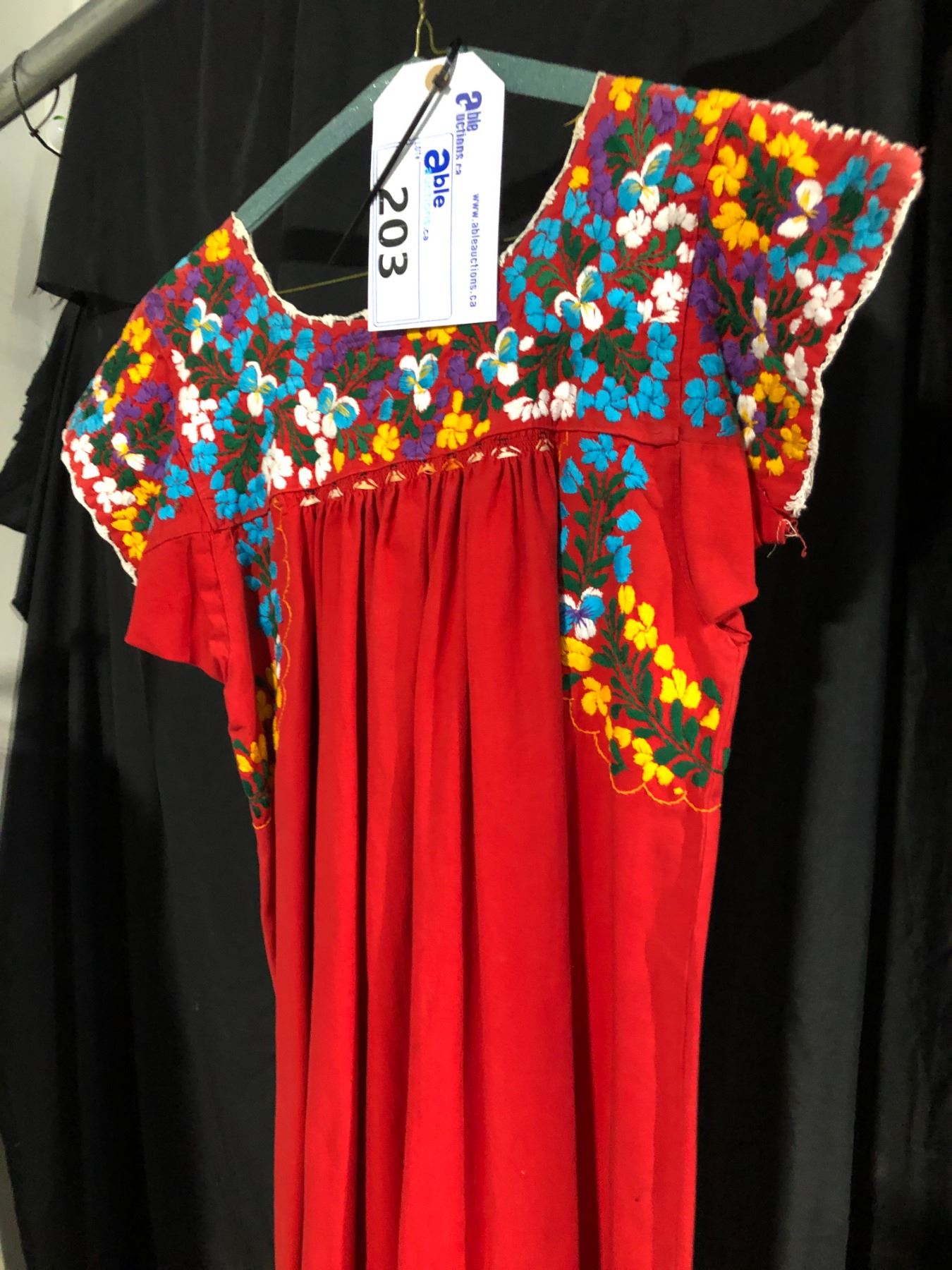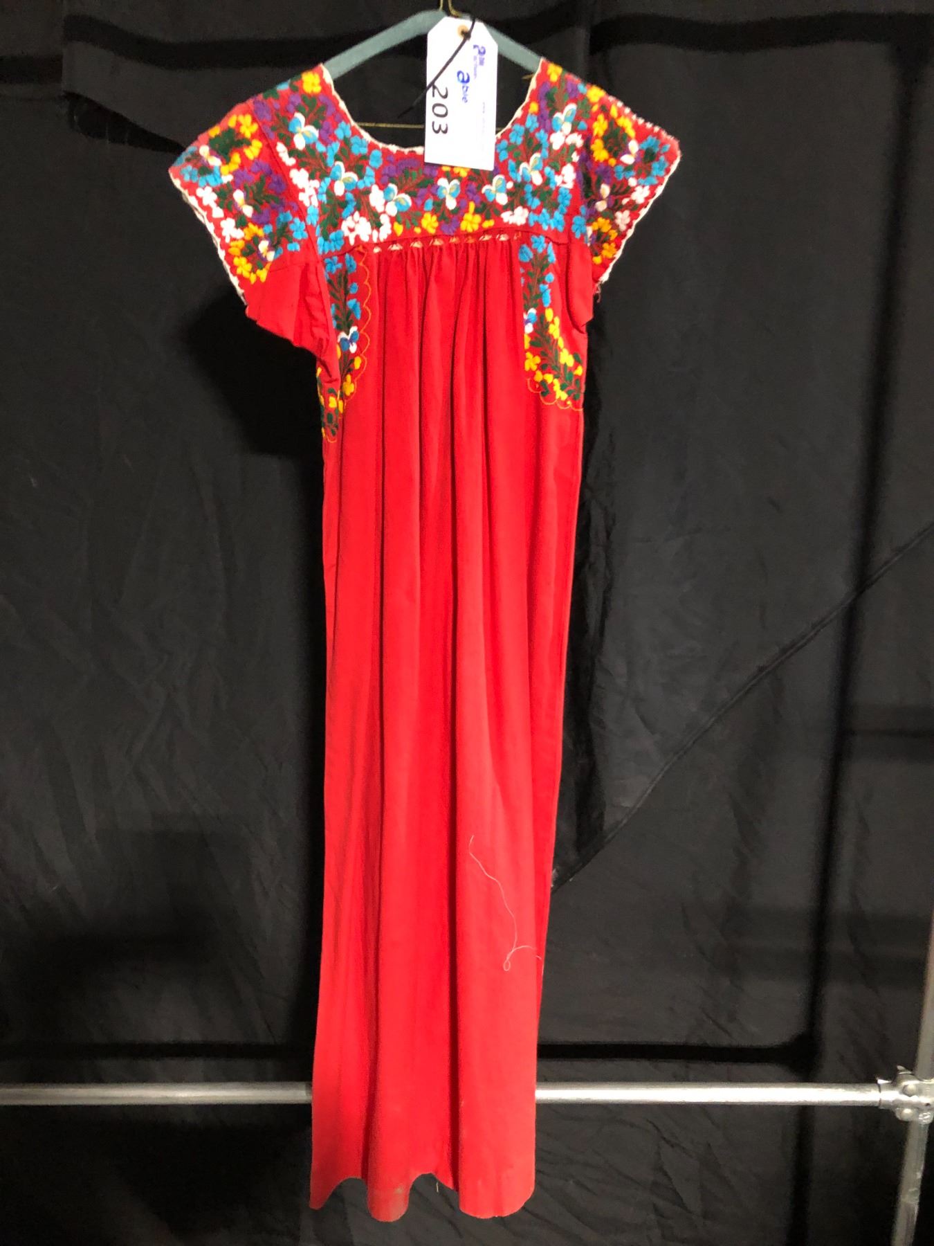 RED VINTAGE DRESS WITH FLORAL NECKLINE, DAILY RENTAL $65.00