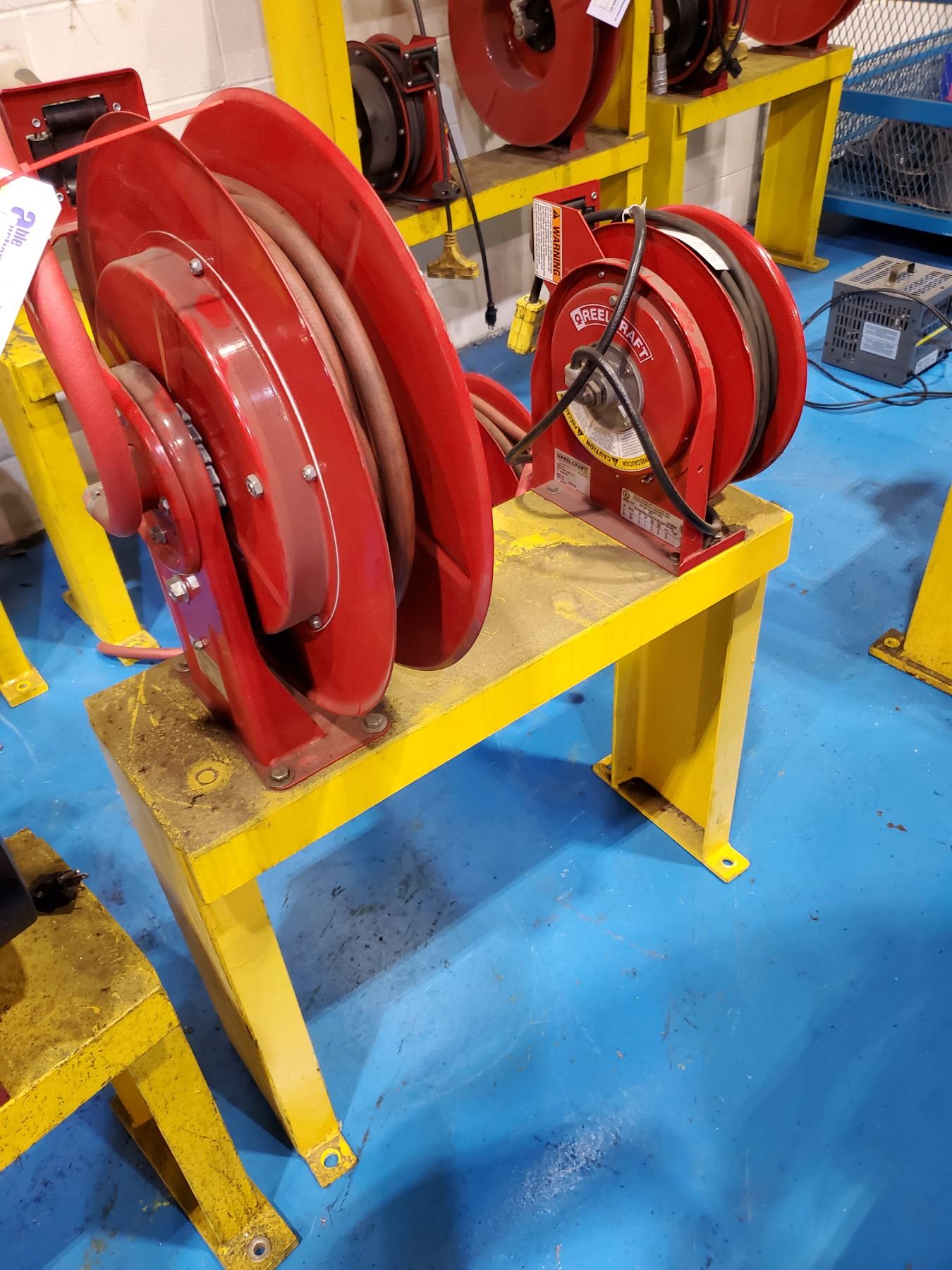 REELCRAFT MODEL 7830 OLP RETRACTABLE AIRLINE AND EXTENSION CORD REELS MOUNTED ON METAL STAND