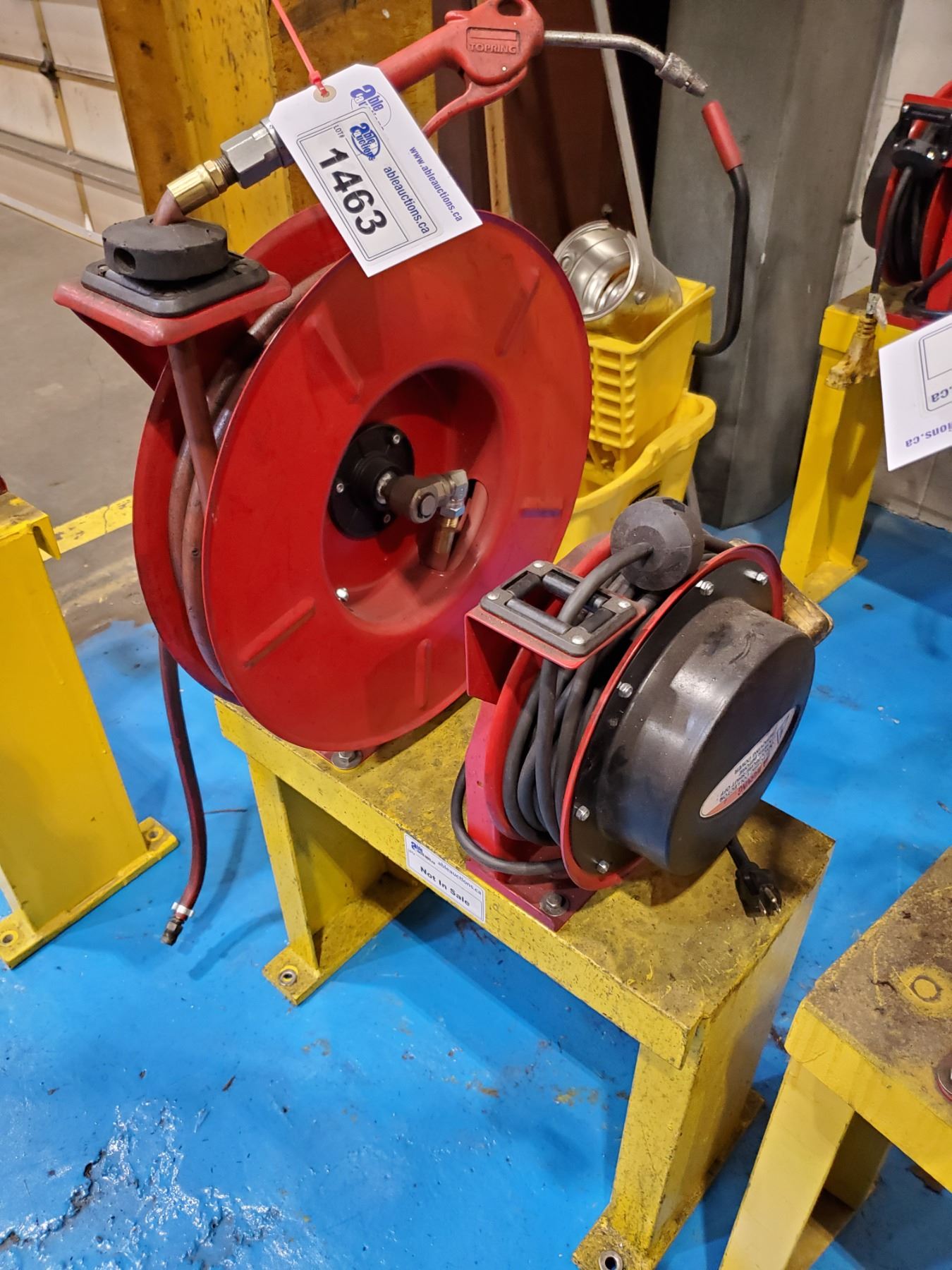 REELCRAFT MODEL 7850 OLP RETRACTABLE AIRLINE AND EXTENSION CORD REELS MOUNTED ON METAL STAND