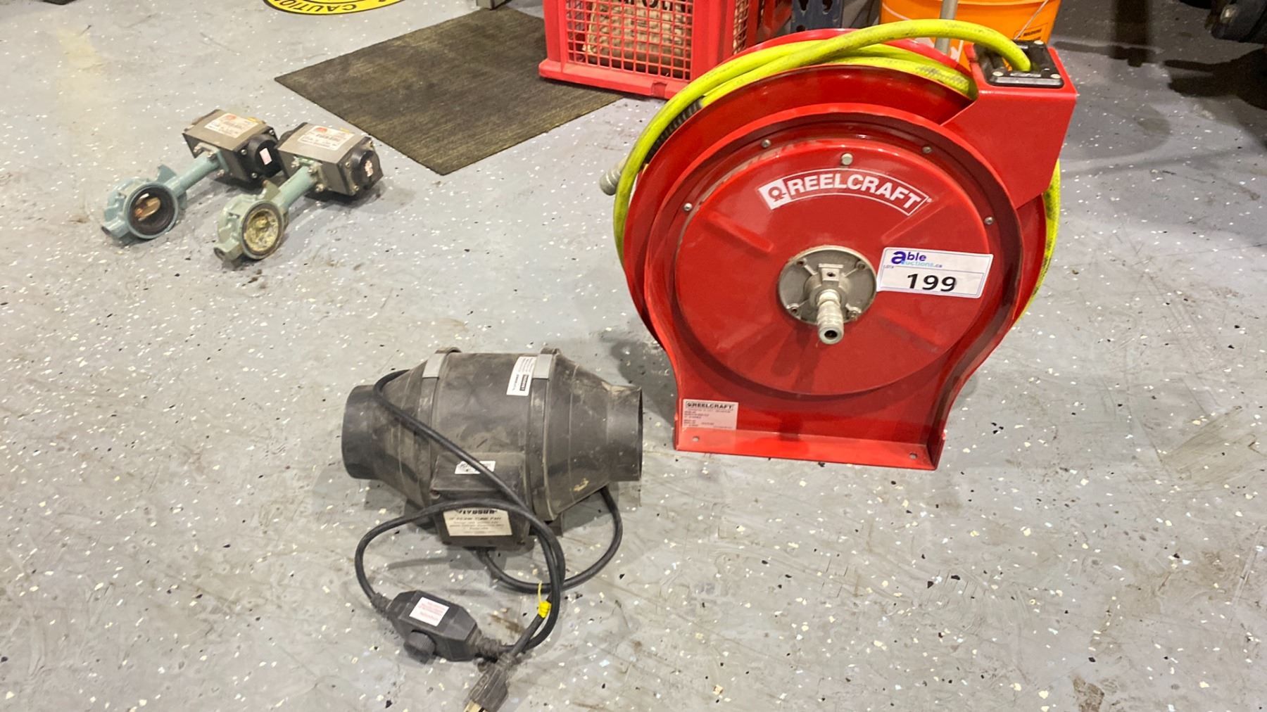 REELCRAFT PNEUMATIC 50' HOSE REEL WALL MOUNT 3/8" 300 PSI & A 4" INLINE FAN