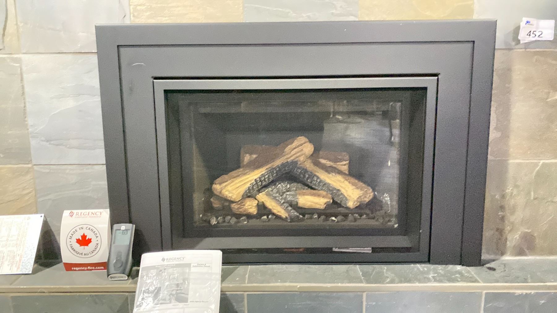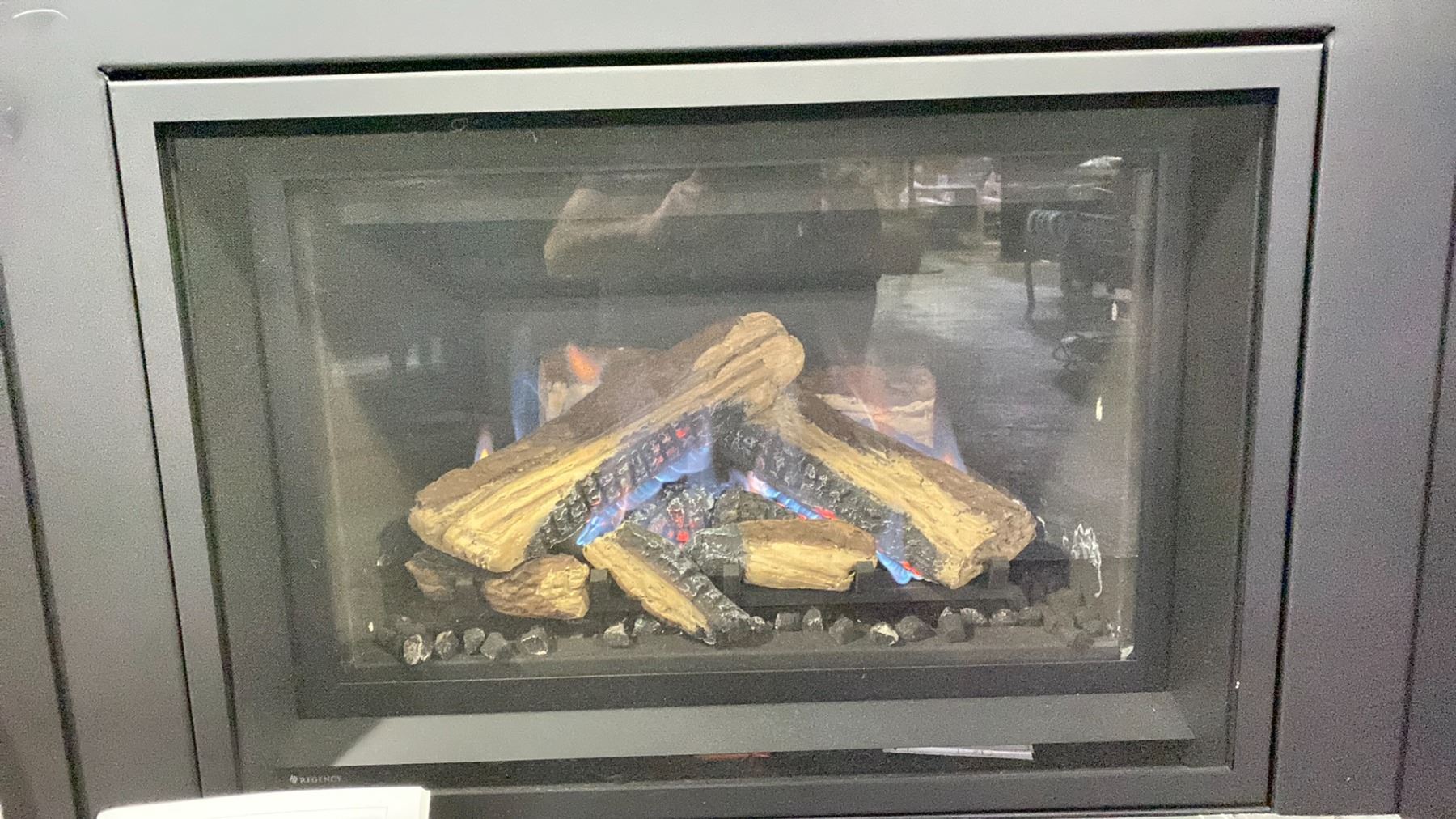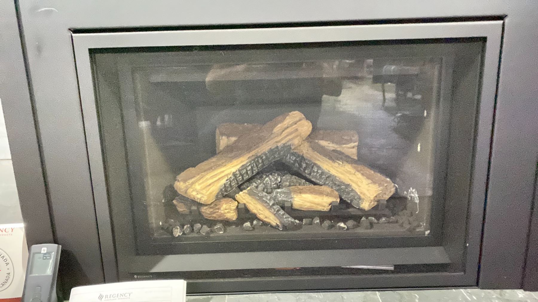 REGENCY ATMOSPHERE GI29LE INSET AS SHOWN WITH OAK LOG SET WITH GRATE AND EMBERS. 3 SIDED FACEPLATE, PREMIUM FACEPLATE SURROUND, BLACK STEEL PANELS. 31,500 BTU WITH TURN DOWN TO 17,000, PATENT PENDING INFUSION BURNER, FLAME HEIGHT ADJUSTMENT CONTROL WITH TURN DOWN. RETAILS $5835