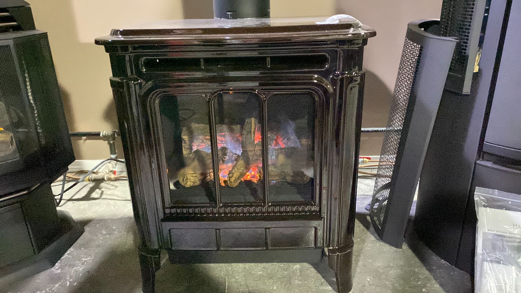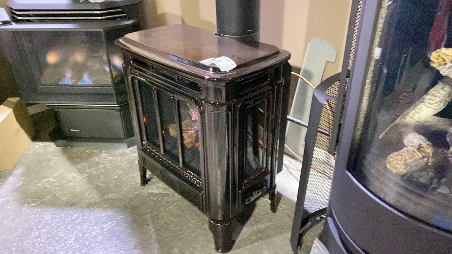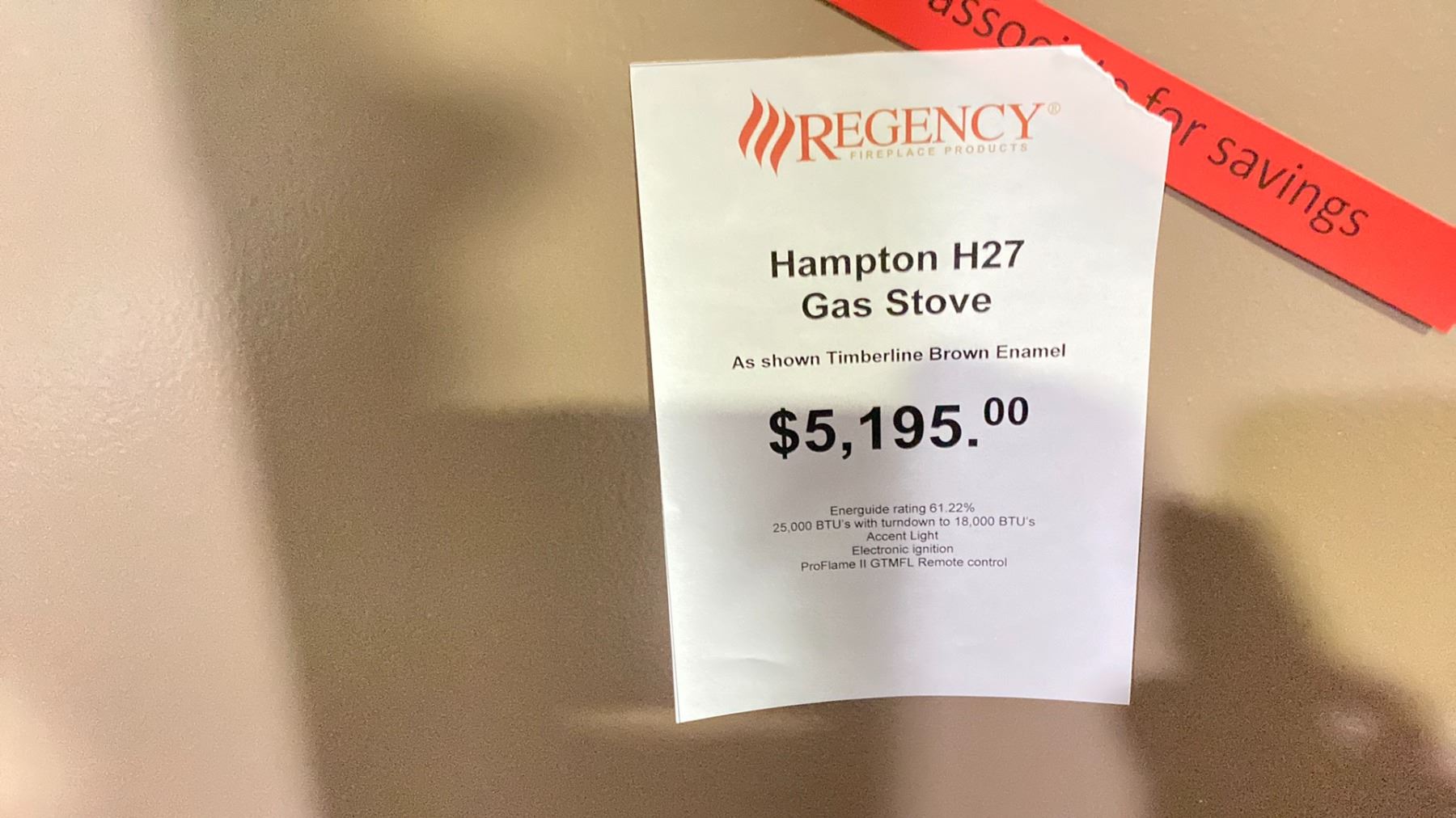 REGENCY HAMPTON H27 GAS STOVE. TIMERLINE BROWN ENAMEL. ENERGUIDE RATING 61.22%, 25,000 BTU WITH TURNDOWN TO 18,000 BUT, ACCENT LIGHT ELECTRONIC IGNITION, PROFLAME II GTMFL REMOTE CONTROL