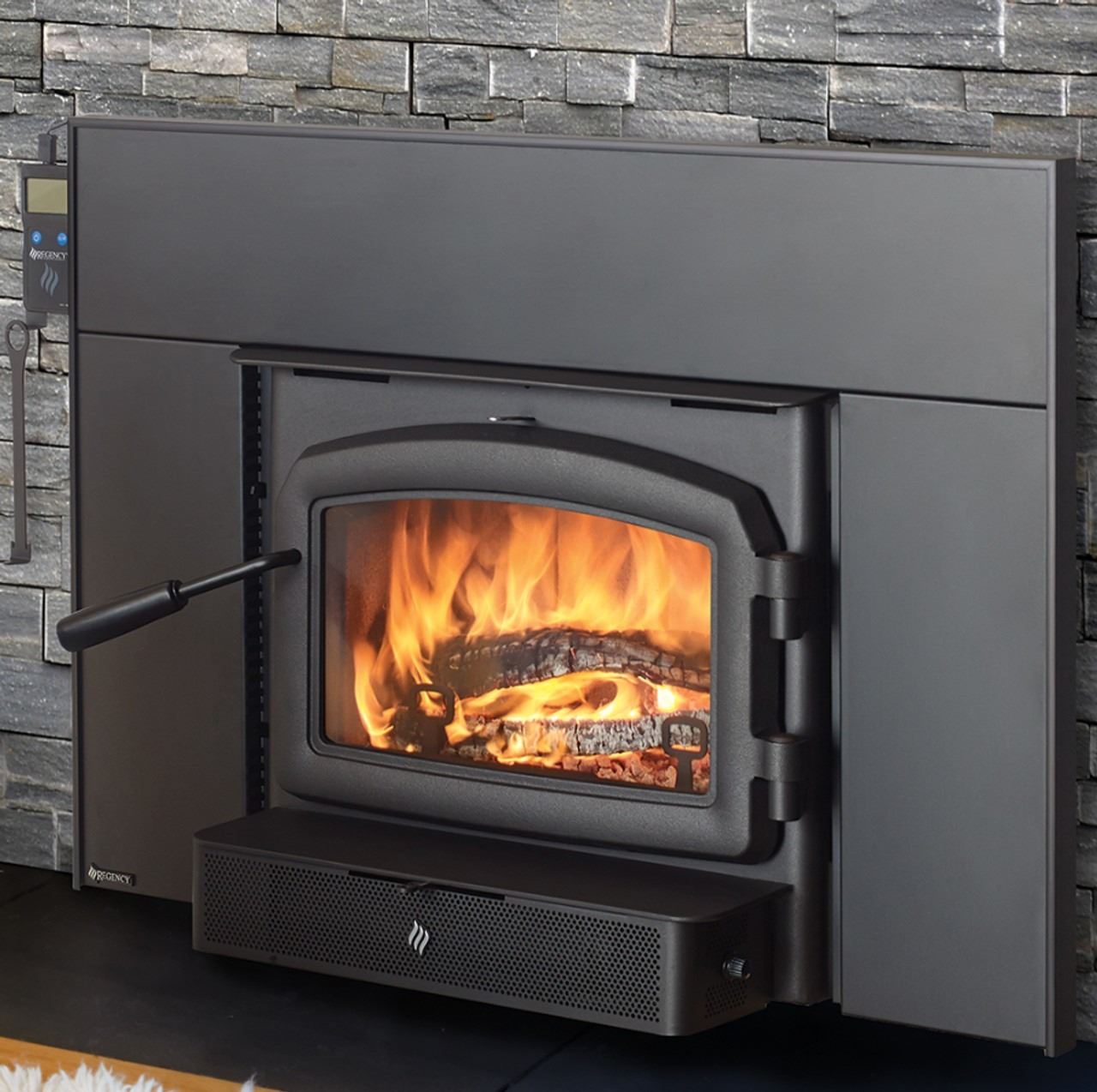 REGENCY I1500S CLASSIC BLACK CAST IRON CASCADES WOOD INSERT FIREPLACE WITH STONE INLAY, DOOR, BLOWER & OFFSET FUEL ADAPTER
