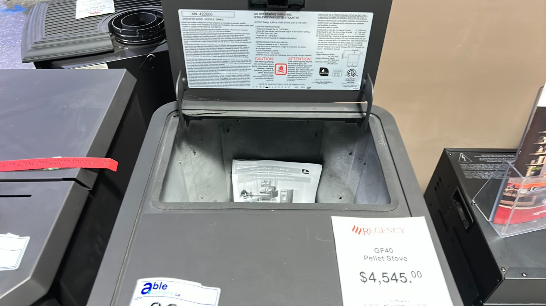 REGENCY PELLET STOVE. MODEL GF40. 70.7% EFFICIENCY, 30,000 BTU WITH TURNDOWN TO 10,000 BTU, HEATS UP TO 1200 SQ FT, 67 LB HOPPER, STANDARD WALL THERMOSTAT, MOBILE HOME APPROVED