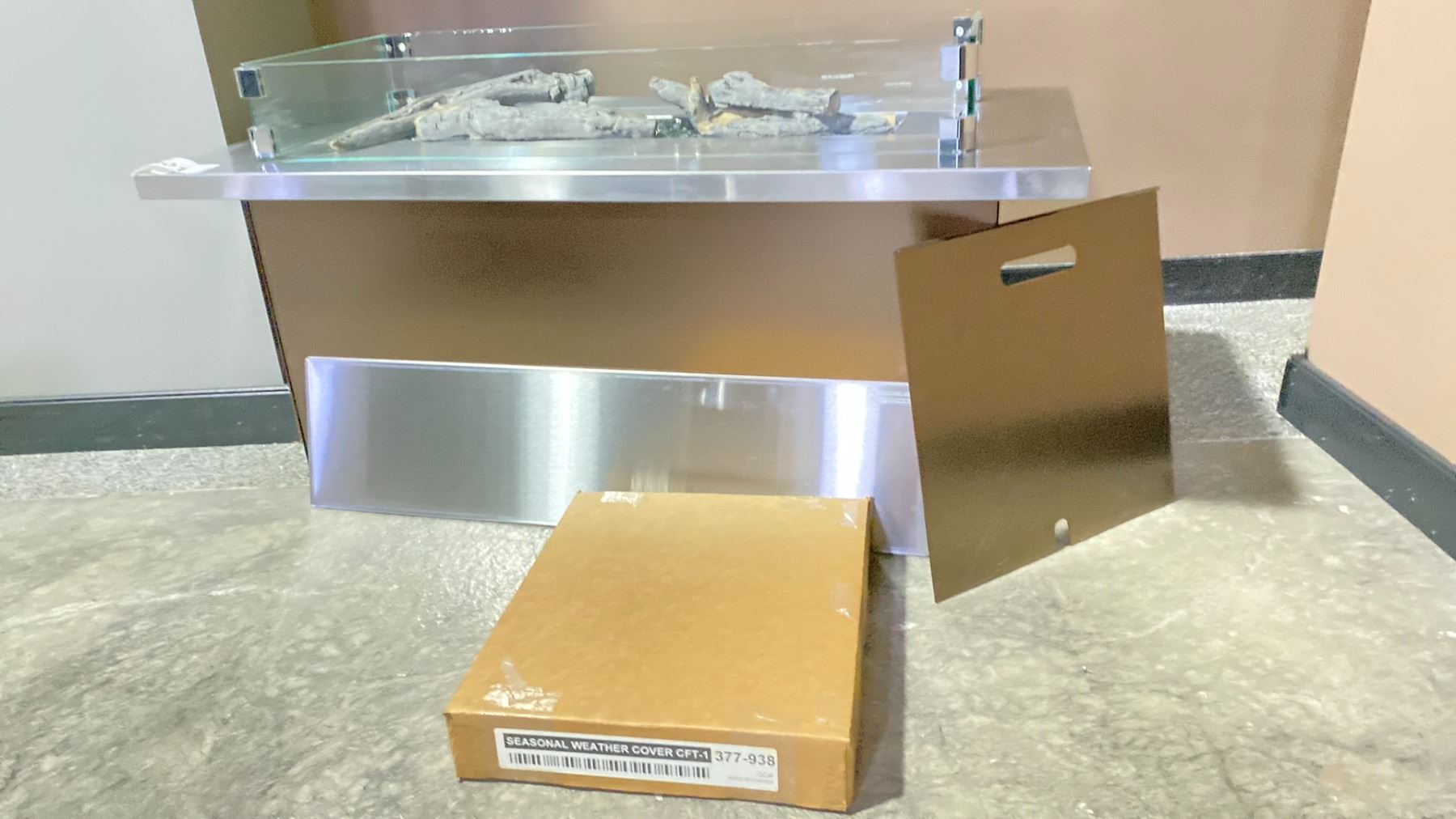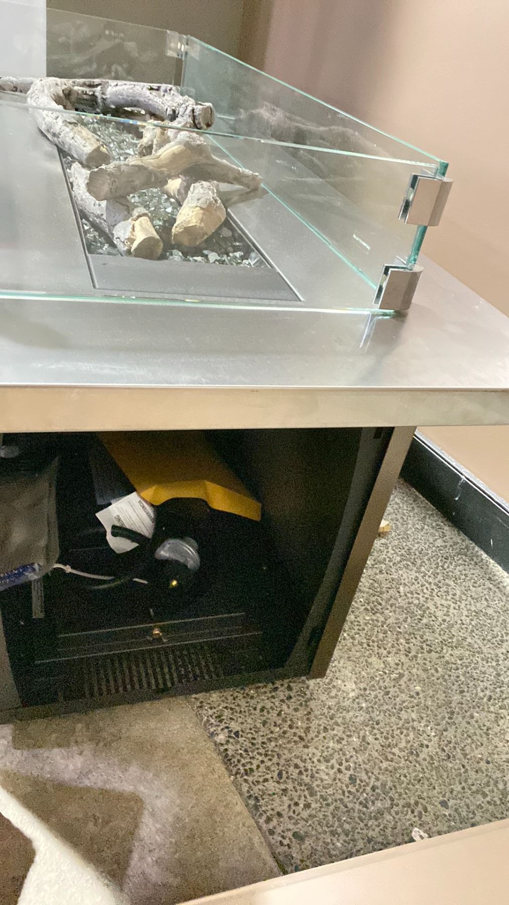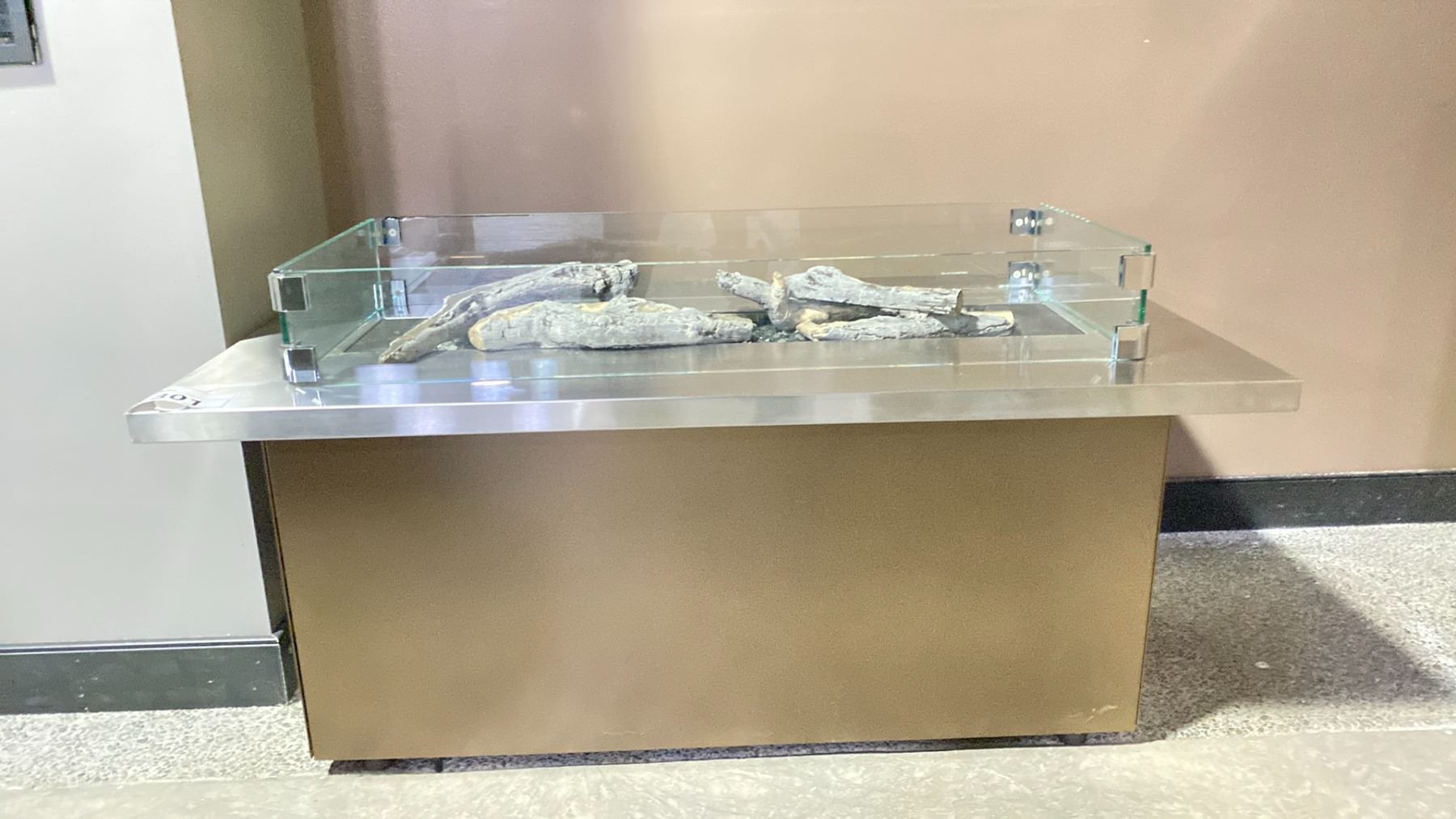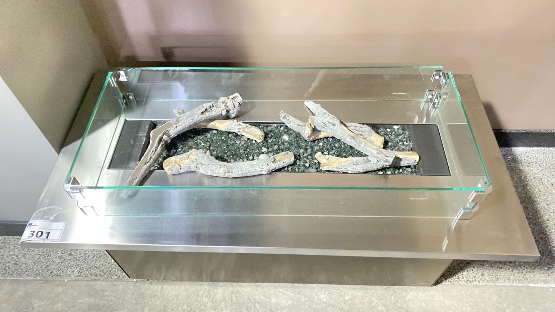 REGENCY PLATEAU COFFEE TABLE PROPANE FIRE TABLE. STAINLESS STEEL TOP, GLASS SURROUND AND CERAMIC LOG SET. 48X24"X20"H. 48,000 BTI. 30" STEEL BURNER