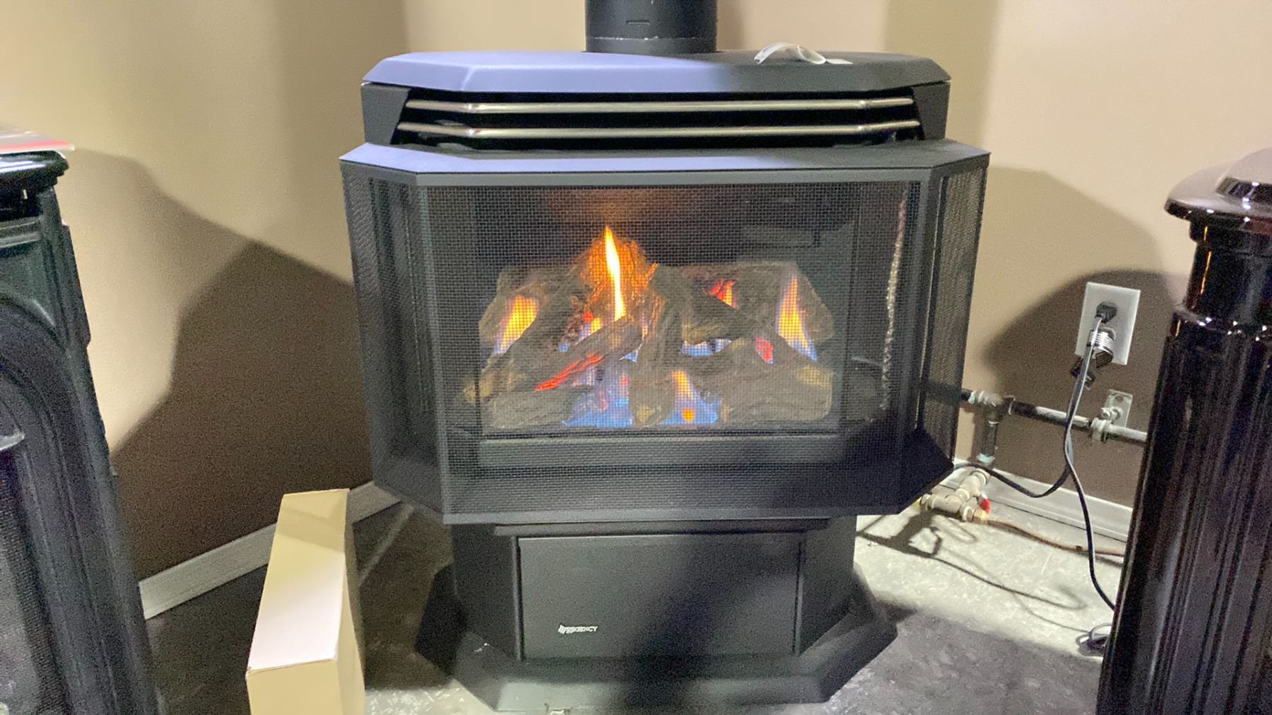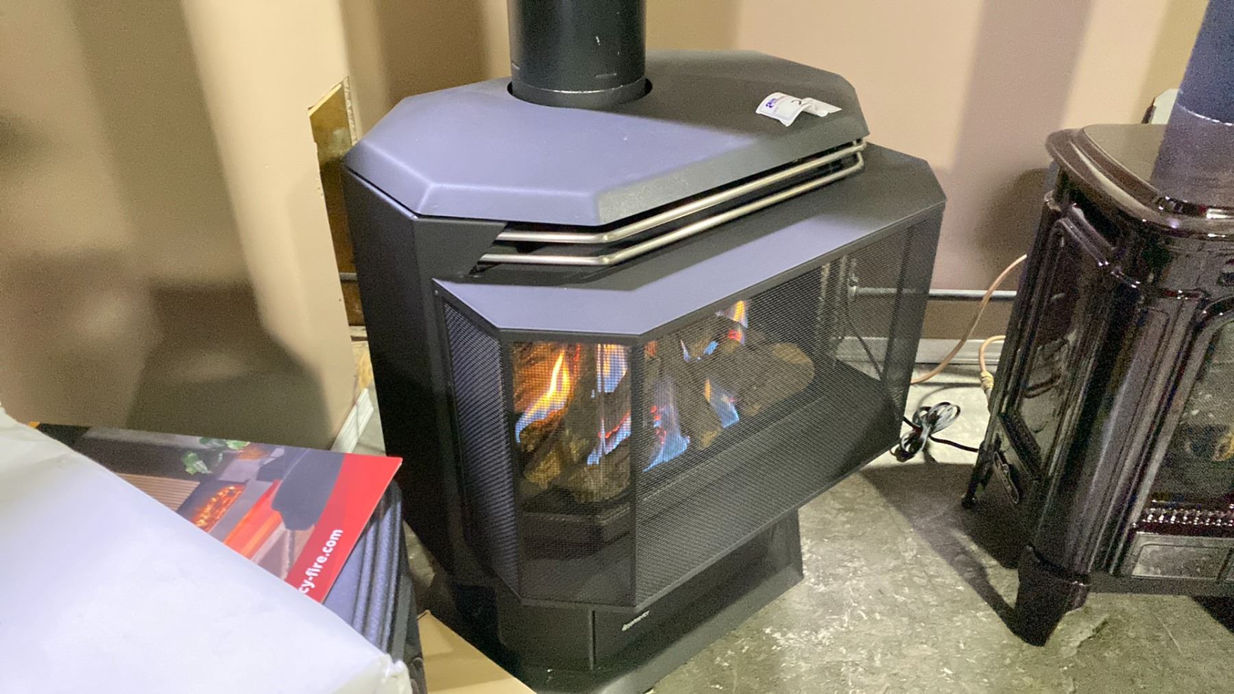 REGENCY ULTIMATE U39 GAS STOVE. SAFETY SCREEN, BLACK WRAP DOOR, NICKEL LOUVERS, BLACK STEEL PEDESTAL & FLAME HEIGHT ADJUSTMENT, 38,000 BTU WITH TURN DOWN TO 20,000, ENERGUIDE EFFICIENCY RATING 69.41%
