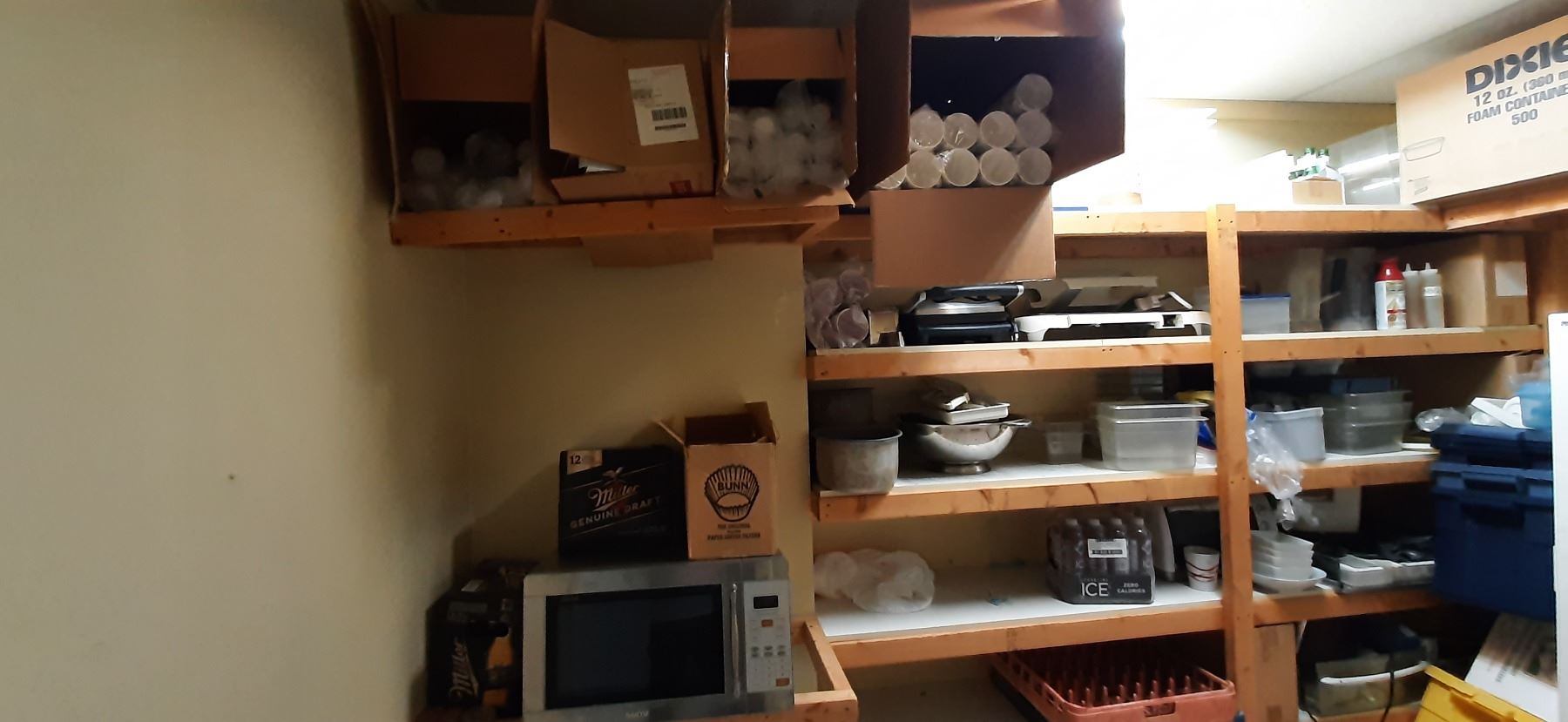 REMAINING CONTENTS OF STORAGE ROOM INCLUDING COMMERCIAL KITCHEN SUPPLIES, MICROWAVE, PANINI PRESS...