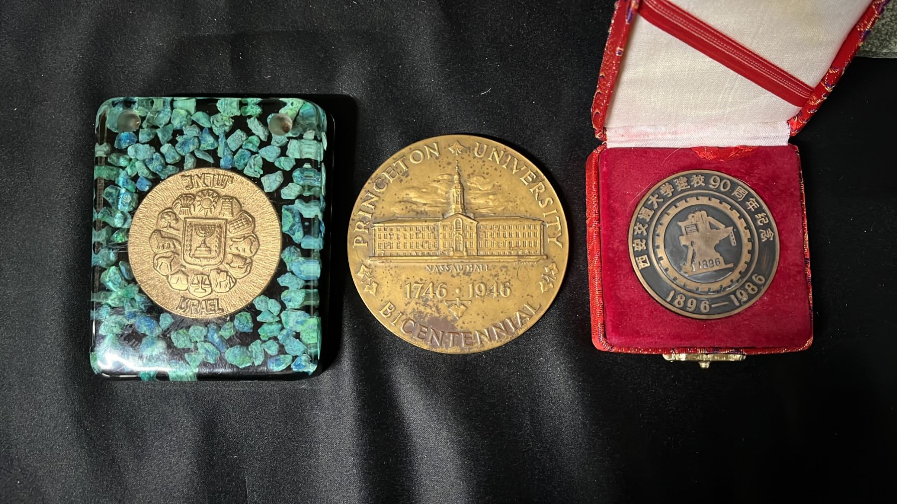 RESIN DRAGON PEN HOLDER, EMBLEM OF ISRAEL IN A RESIN PAPERWEIGHT, PRINCETON UNIVERSITY BICENTENNIAL MEDAL, COMMEMORATIVE MEDAL, TWO CHINESE STONE SEALS & MORE