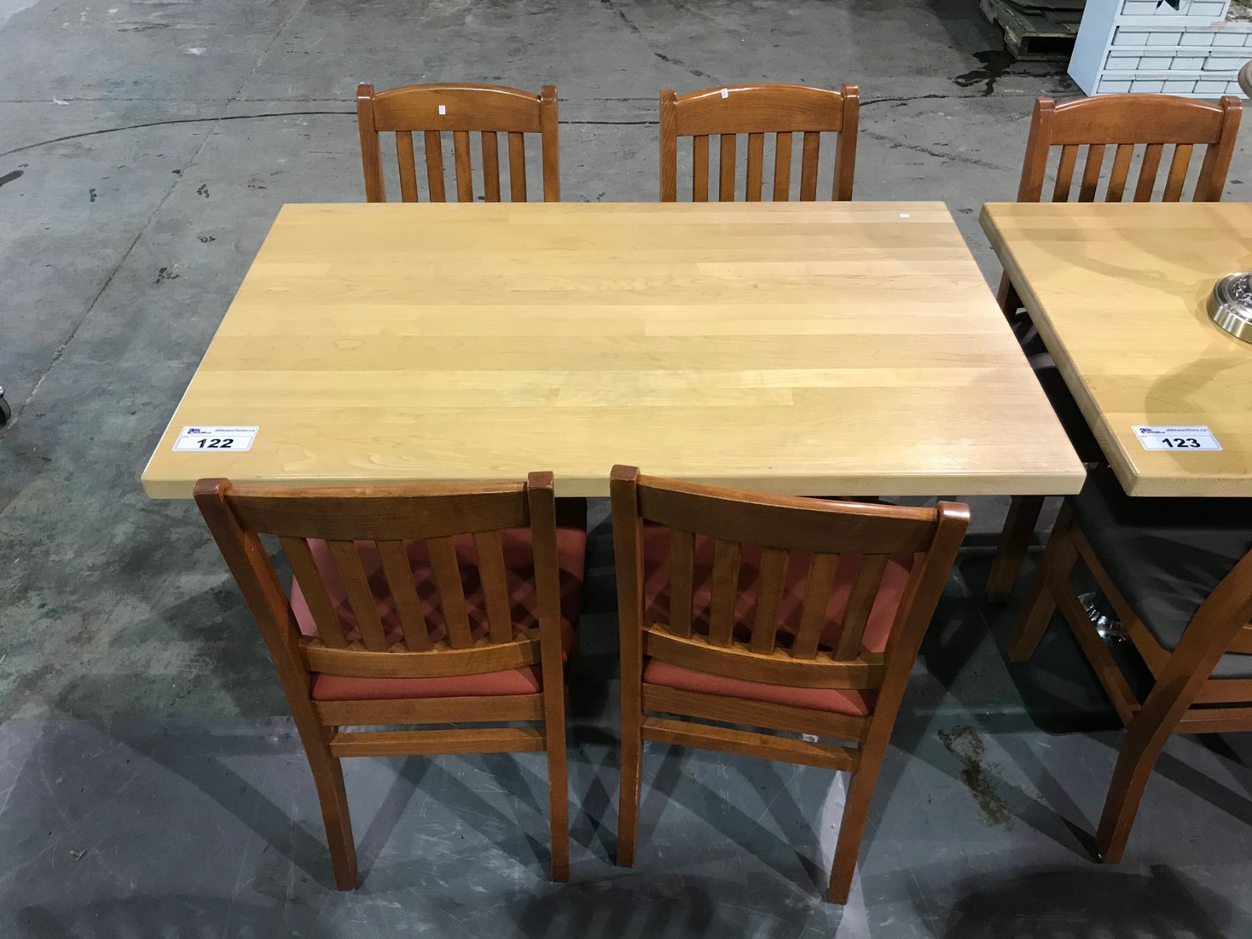 RESTAURANT STYLE TABLE & 4 CHAIRS /W RED CUSHIONS (48"L X 30"W X 29.75"H)