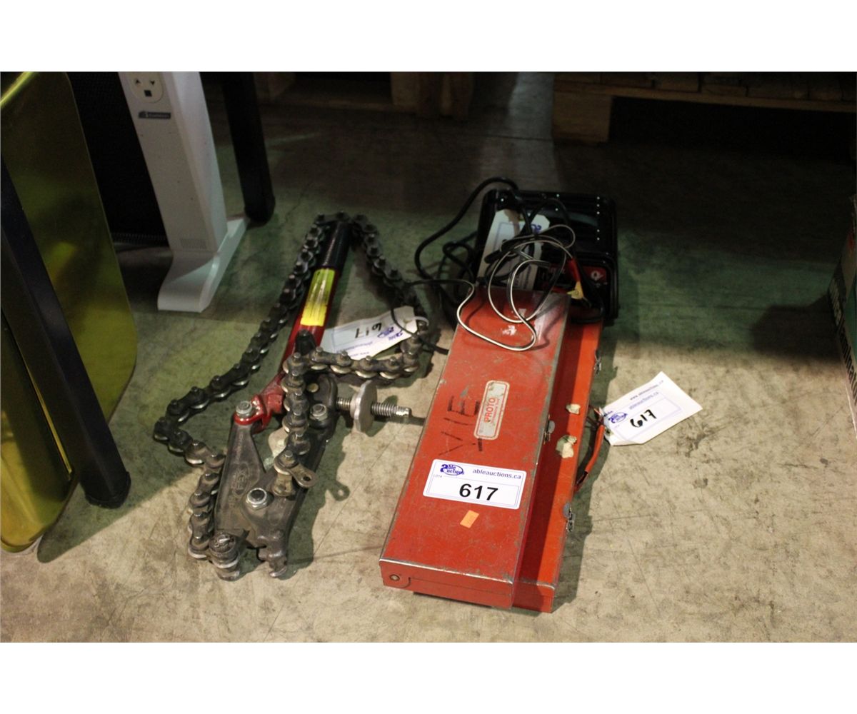 REX CHAIN PIPE WRENCH, BATTERY CHARGER AND 2 SOCKET SETS