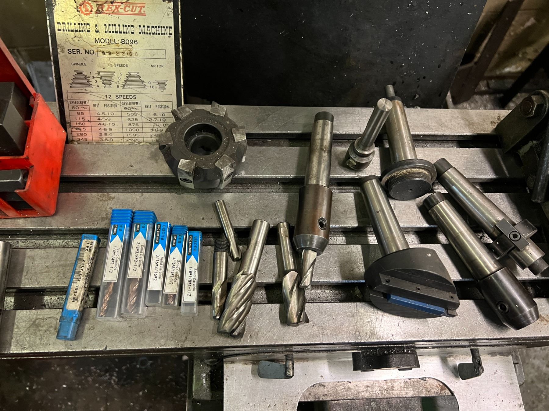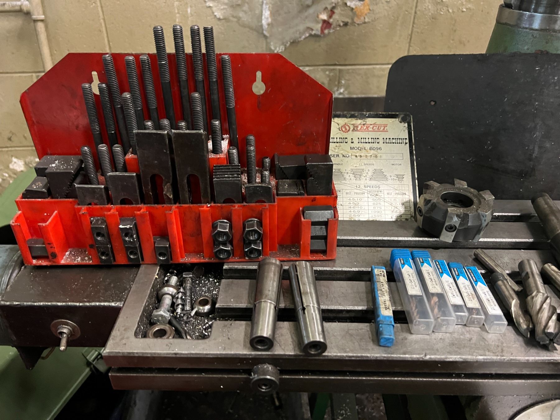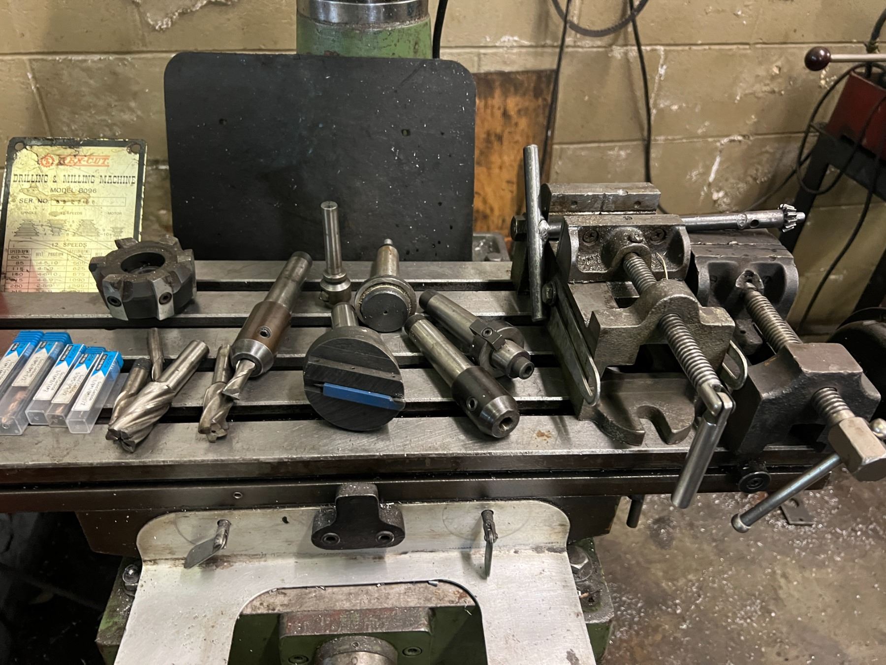 REX-CUT DRILLING & MILLING MACHINE MODEL B096. 12 SPEED. COMES WITH MISC END MILLS, COLLETS. 110 V. INCLUDES HOLD DOWN KIT AND TWO VICES. HAS DIGITAL READ OUT DEPTH GAUGE ATTACHED.