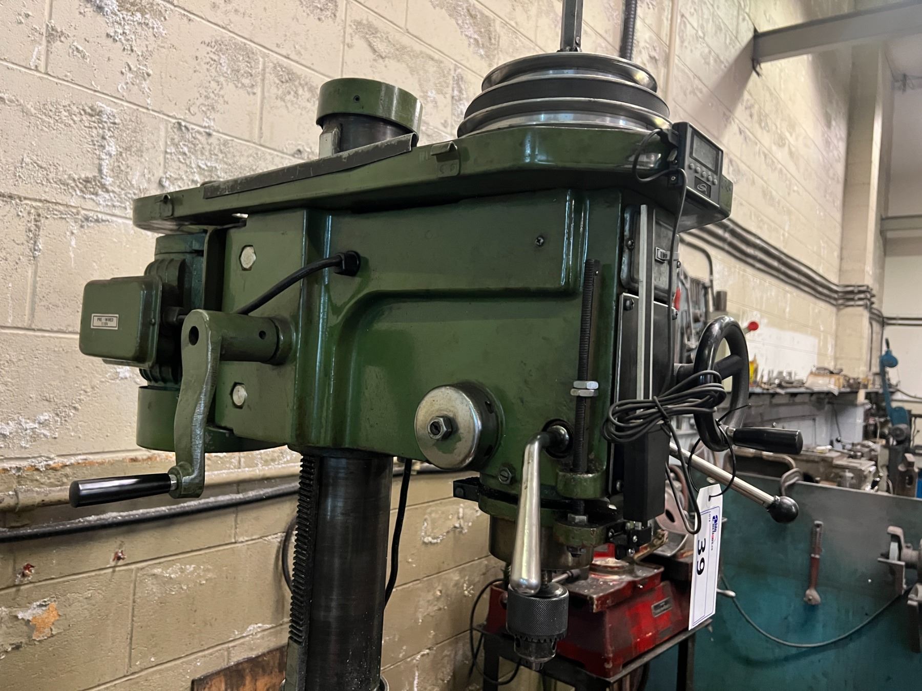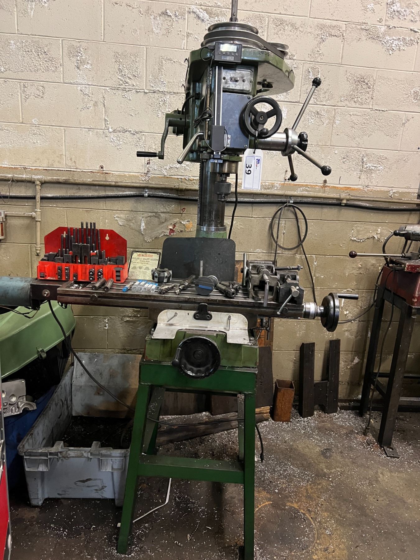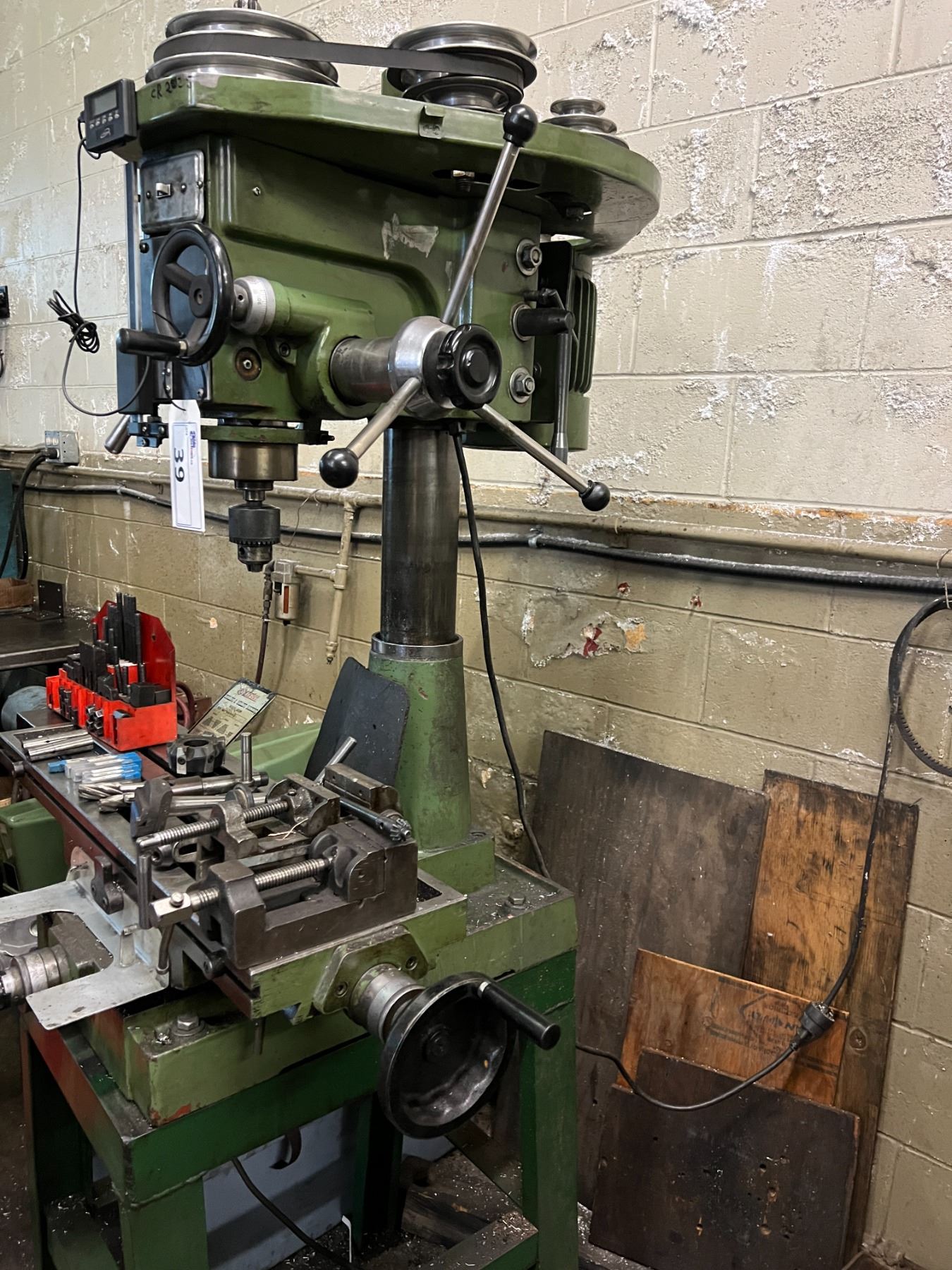 REX-CUT DRILLING & MILLING MACHINE MODEL B096. 12 SPEED. COMES WITH MISC END MILLS, COLLETS. 110 V. INCLUDES HOLD DOWN KIT AND TWO VICES. HAS DIGITAL READ OUT DEPTH GAUGE ATTACHED.
