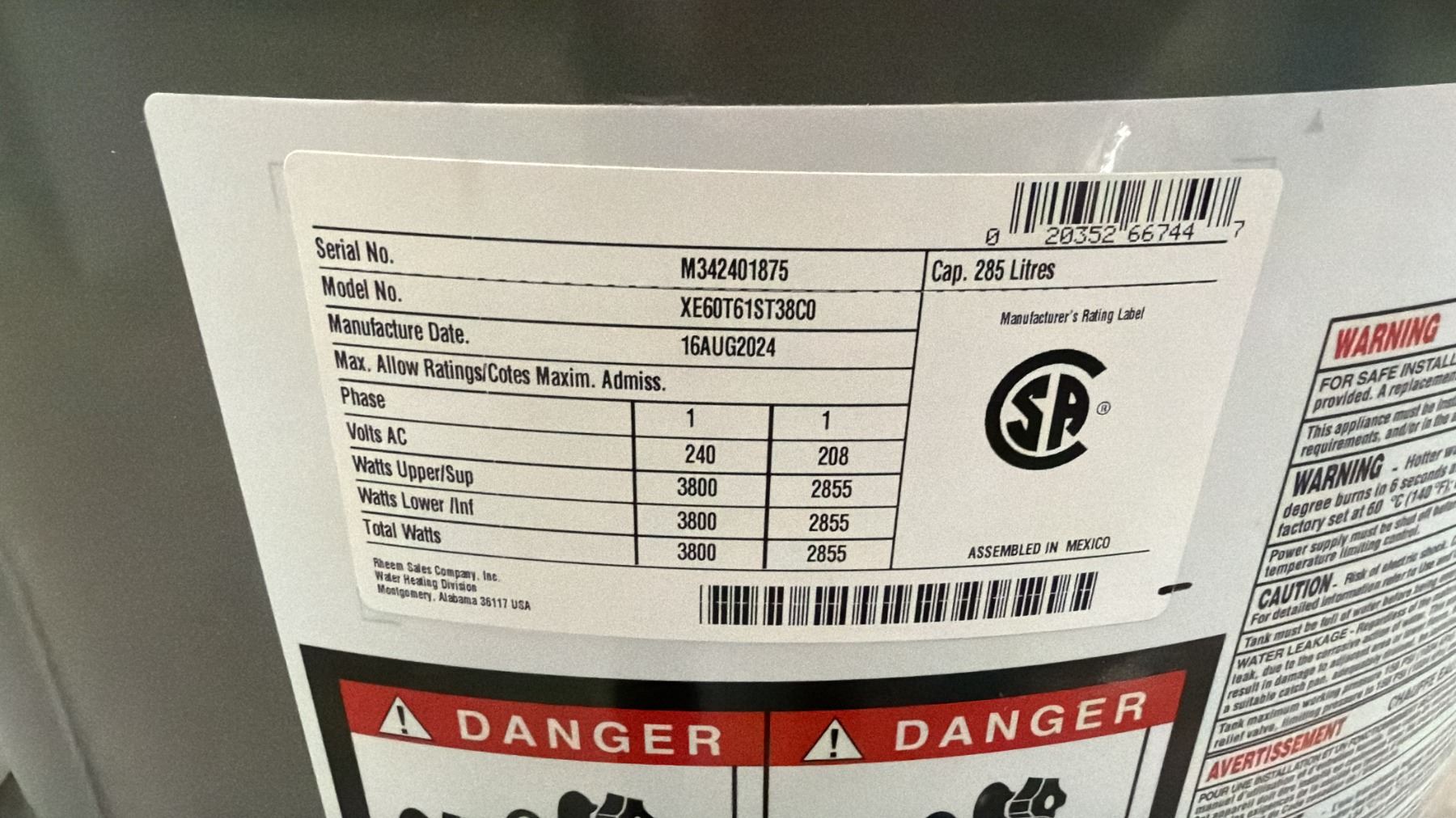 RHEEM 285 LITRE HOT WATER TANK