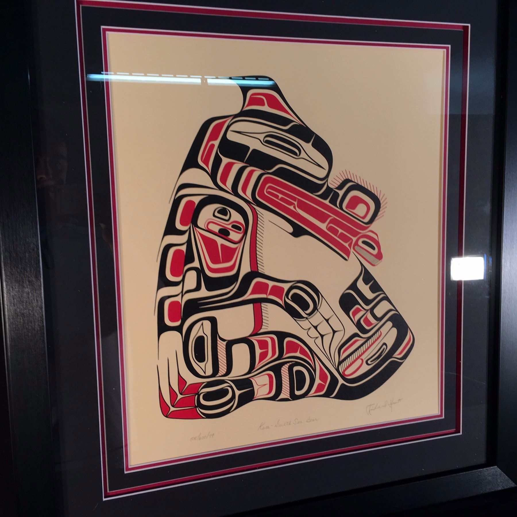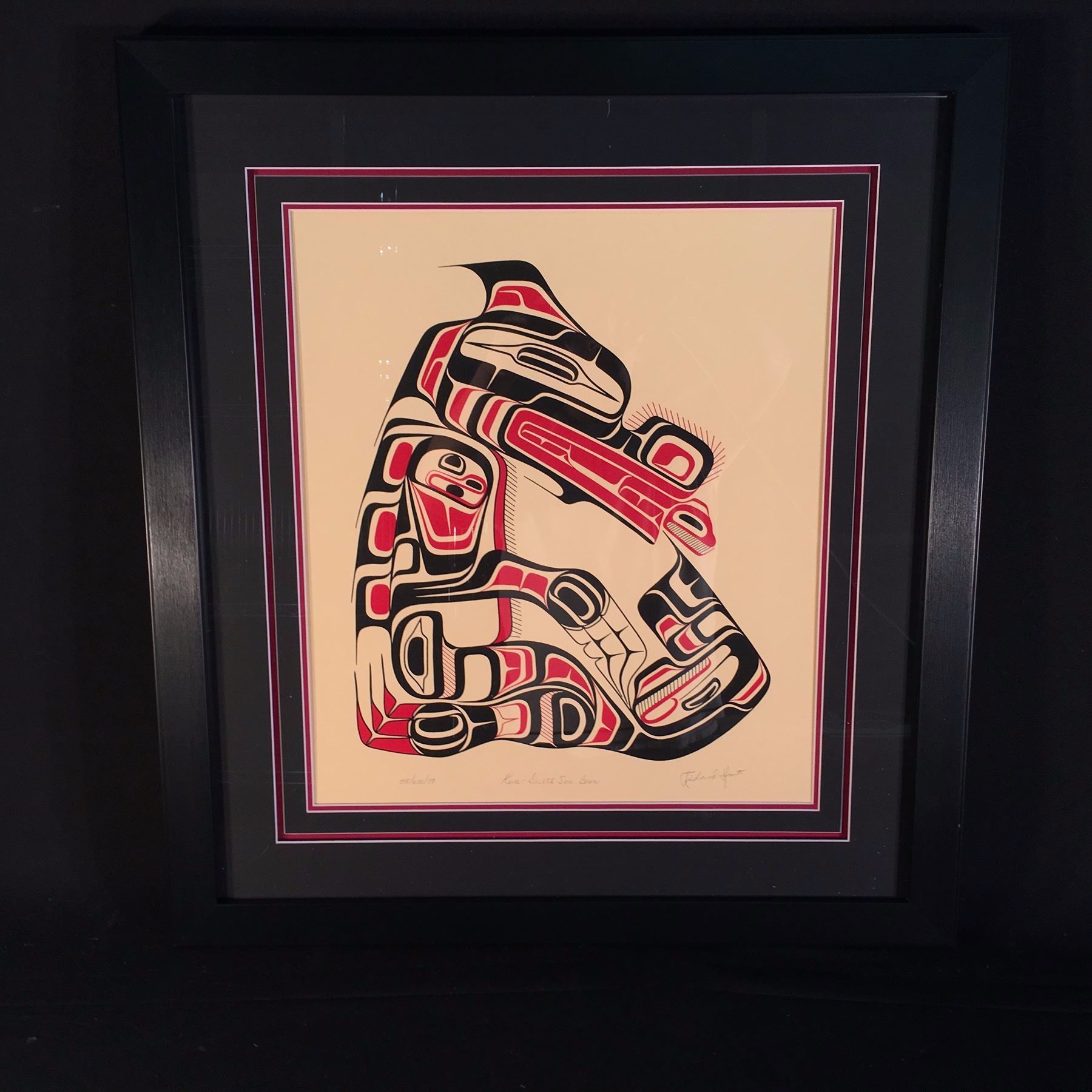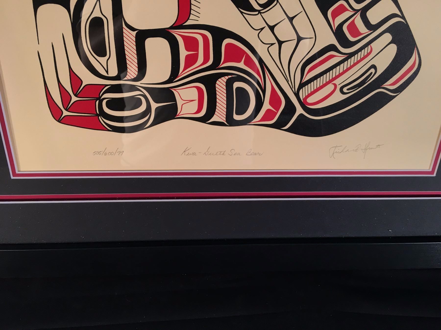 RICHARD HUNT, OF KWA-GUILTH FIRST NATION, SIGNED LIMITED EDITION PRINT, 505/600, 1979, "SEA BEAR", SIGNED ON LOWER RIGHT BY ARTIST, 26'' WIDE, 28.5'' TALL INCLUDING FRAME, WITH ARTIST BIOGRAPHY SHEET AND LIMITED EDITION PRINT CERTIFICATE