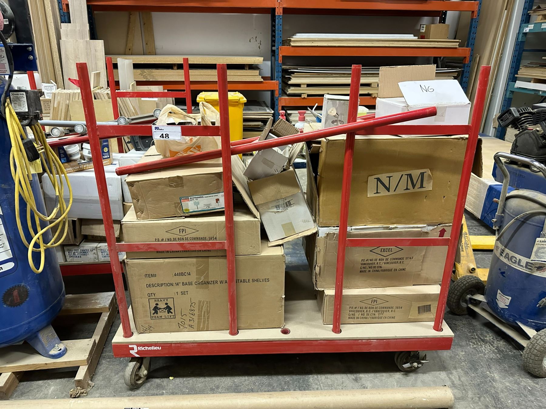RICHELIEU RED MOBILE PRODUCT CART WITH CONTENTS OF ASSORTED LIGHTS AND LIGHT FIXTURES