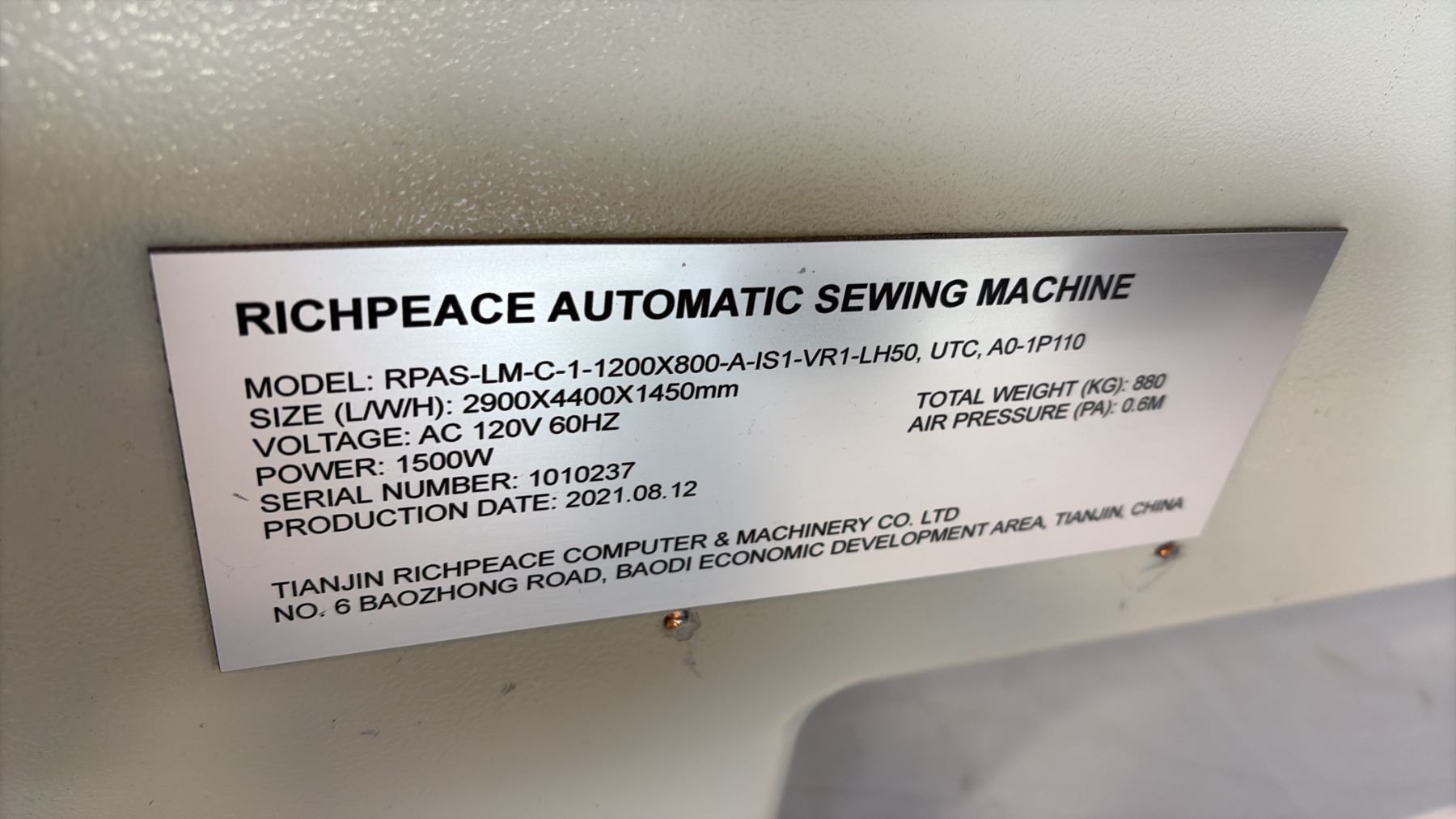 RICHPEACE RPAS-LM-C1-1200X800-A-IS1-VR1=LH50, UTC, A0-1P110 AUTOMATIC COMPUTER-CONTROLLED