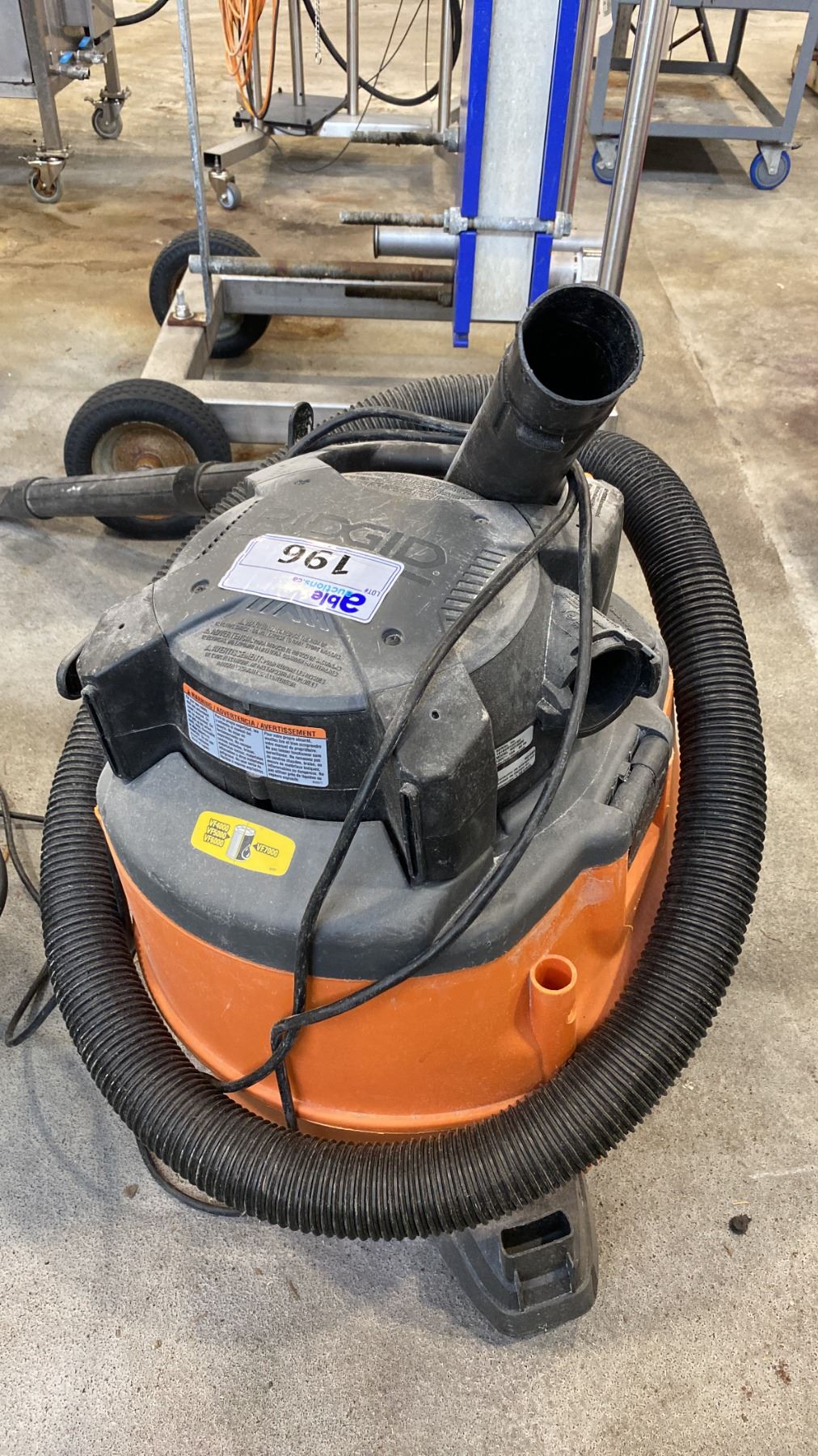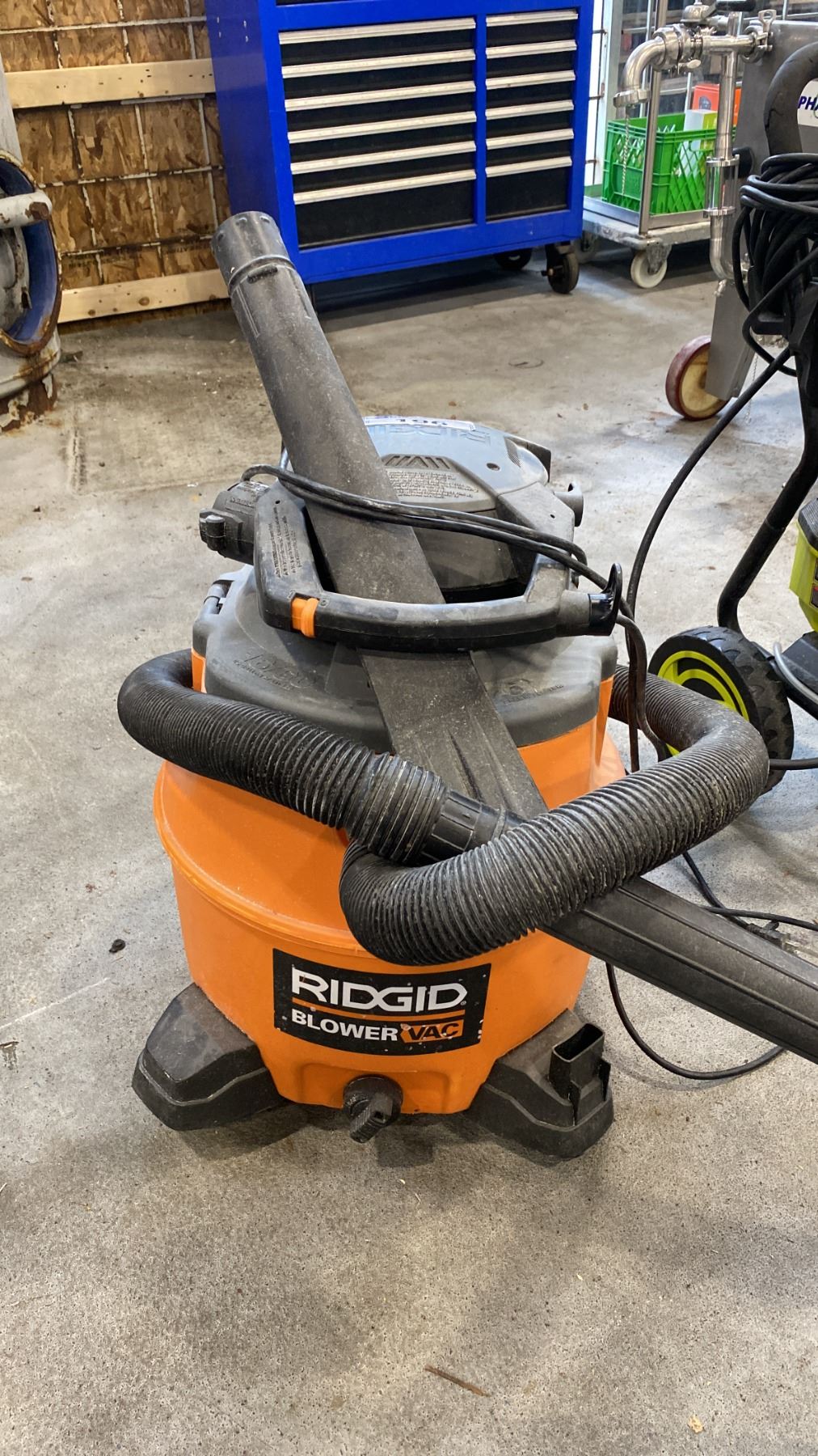RIDGID BLOWER VAC WET/DRY SHOP VAC WITH HOSE AND ATTACHMENTS *1 WHEEL MISSING*