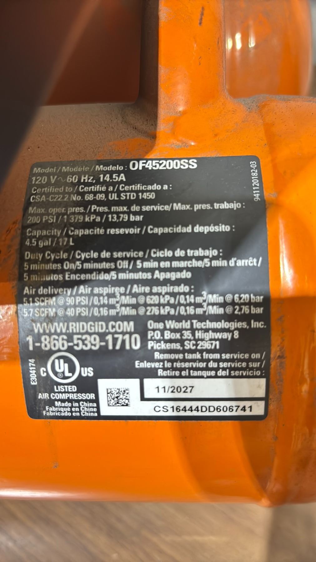 RIDGID OF45200SS 4.5 GALLON 200 PSI PORTABLE COMPRESSOR WITH HOSE