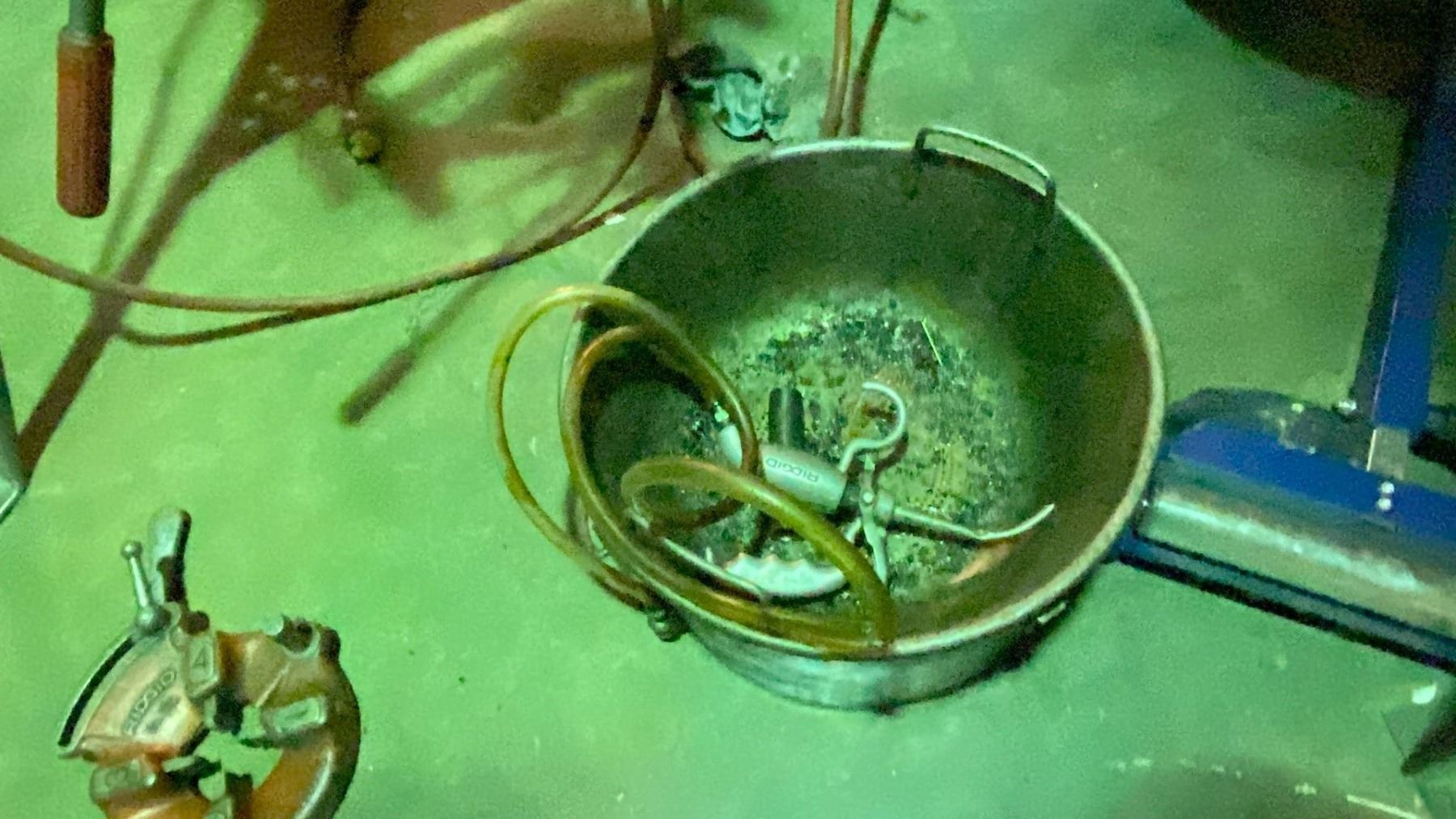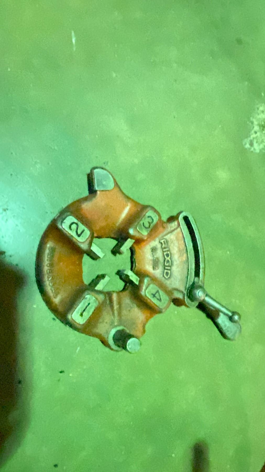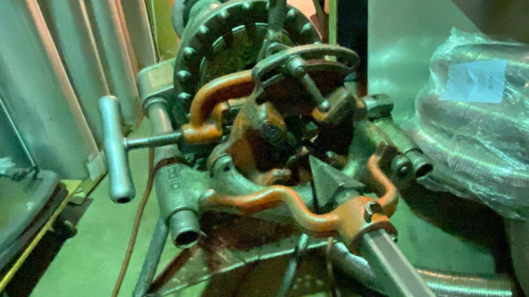 RIDGID PIPE THREADING KIT. MODEL 300, WITH ACCESSORIES AS SHOWN AND WITH AN OIL BUCKET.