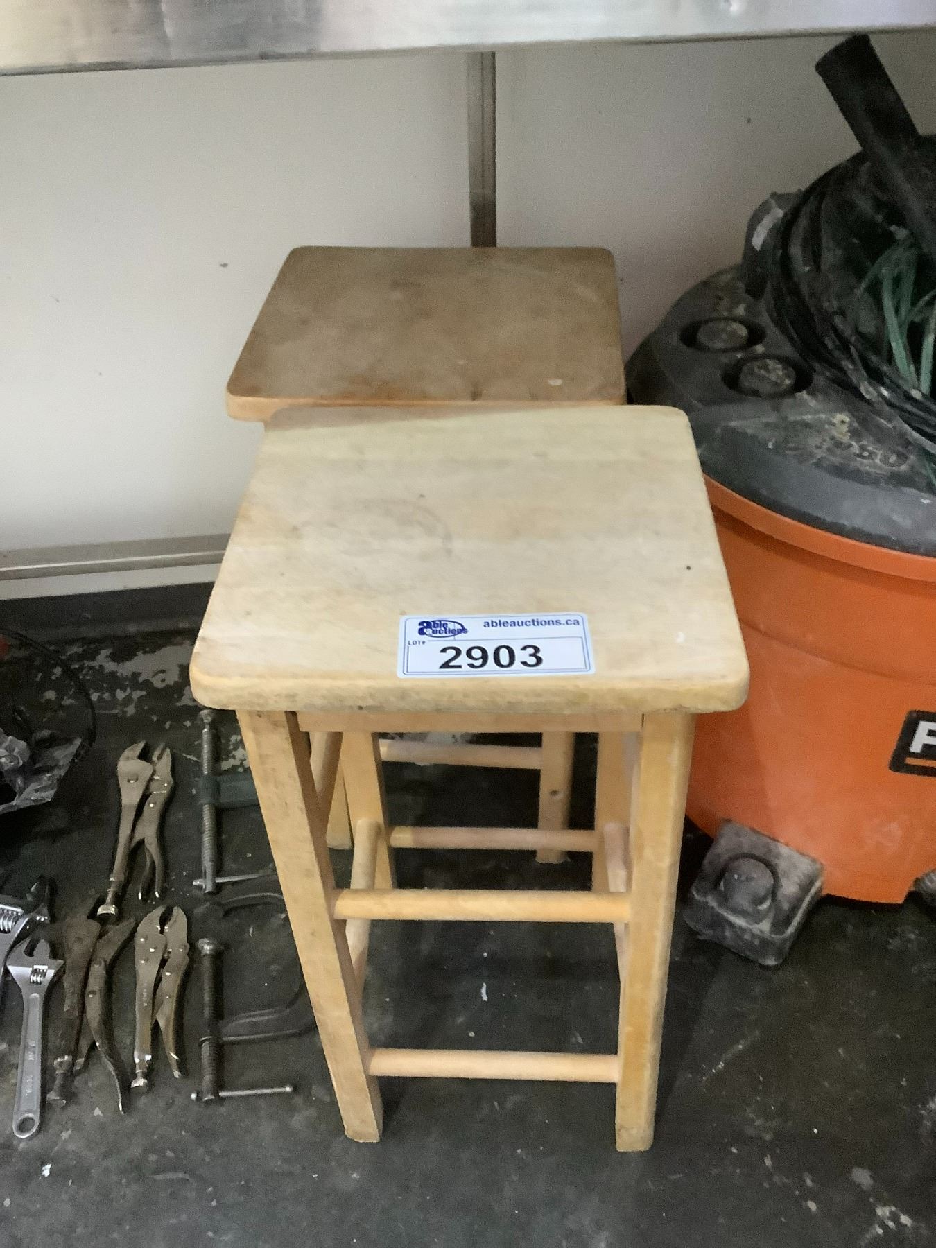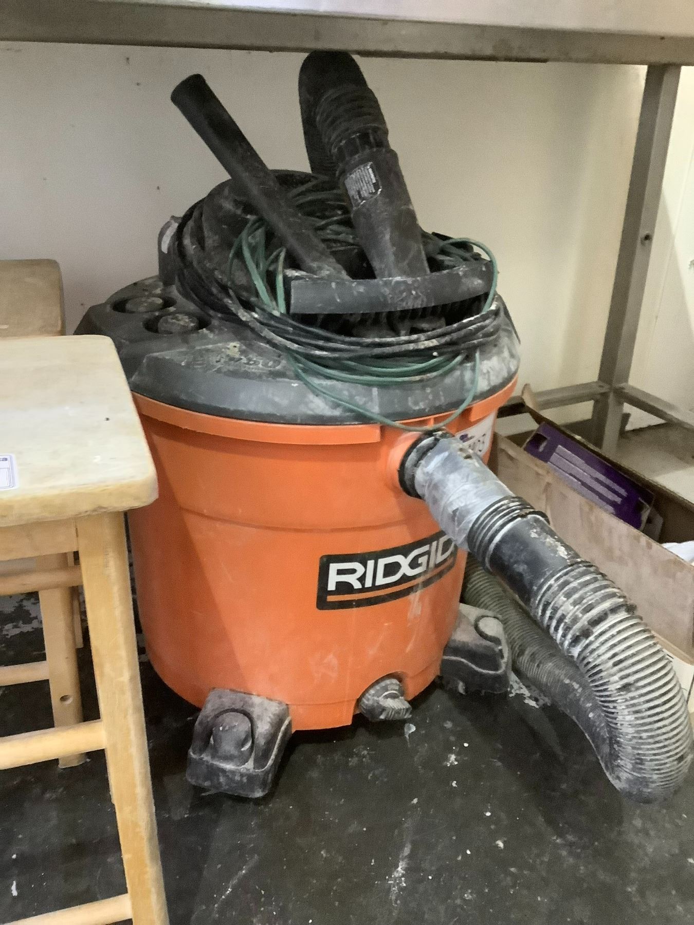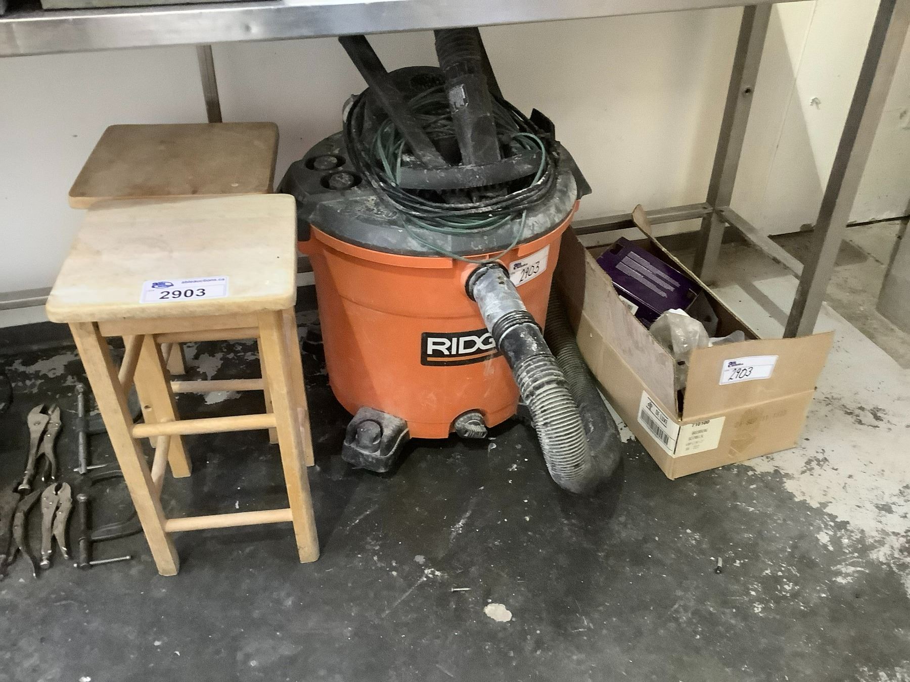 RIDGID SHOPVAC, 2 WOODEN STOOLS, ASSORTED VEHICLE LIGHTS & MORE