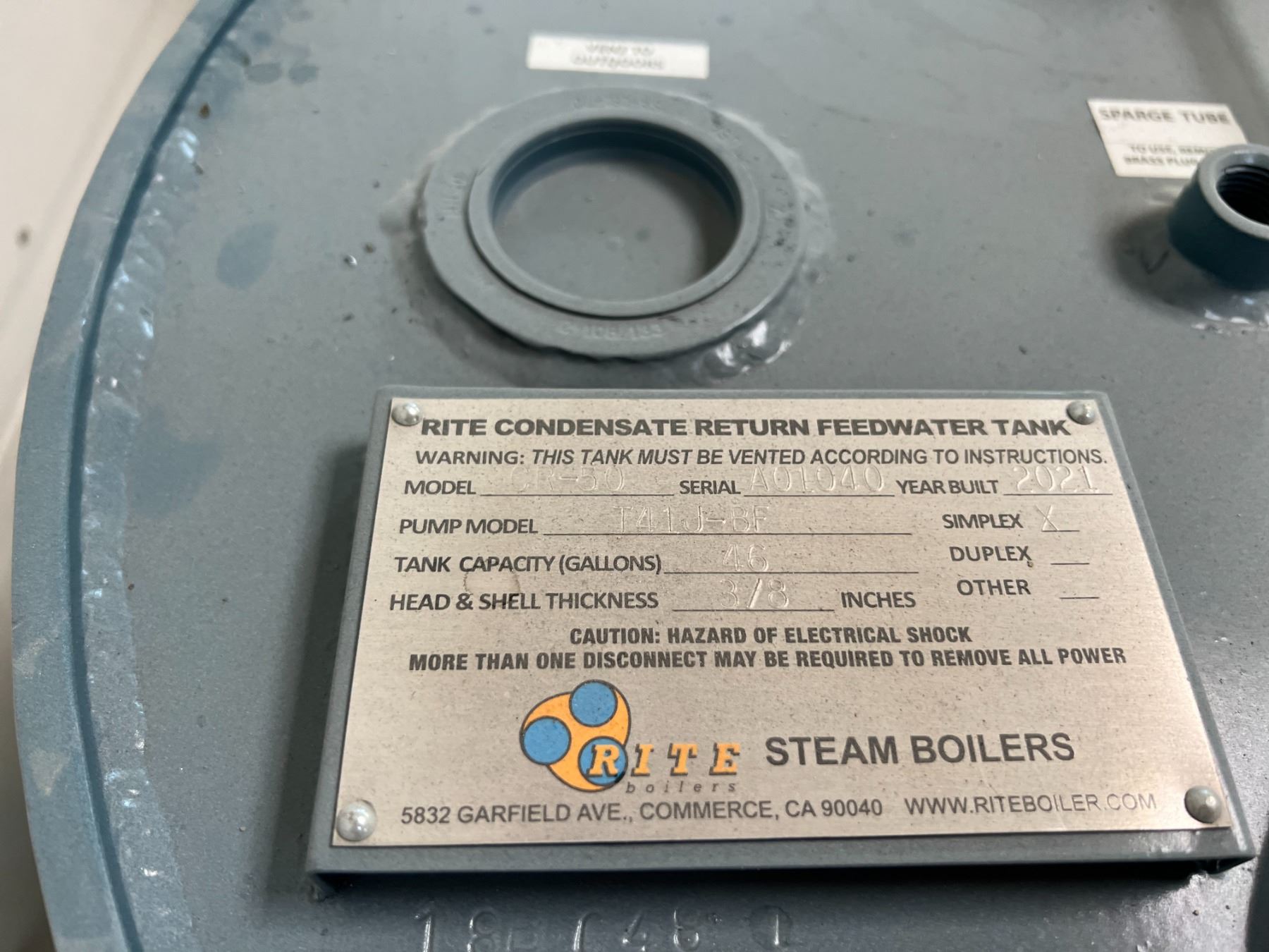 RITE ENGINEERING CONDENSATE RETURN FEED WATER TANK. MODEL CR-50. 46 GALLON CAPACITY. SIGHT GLASS.