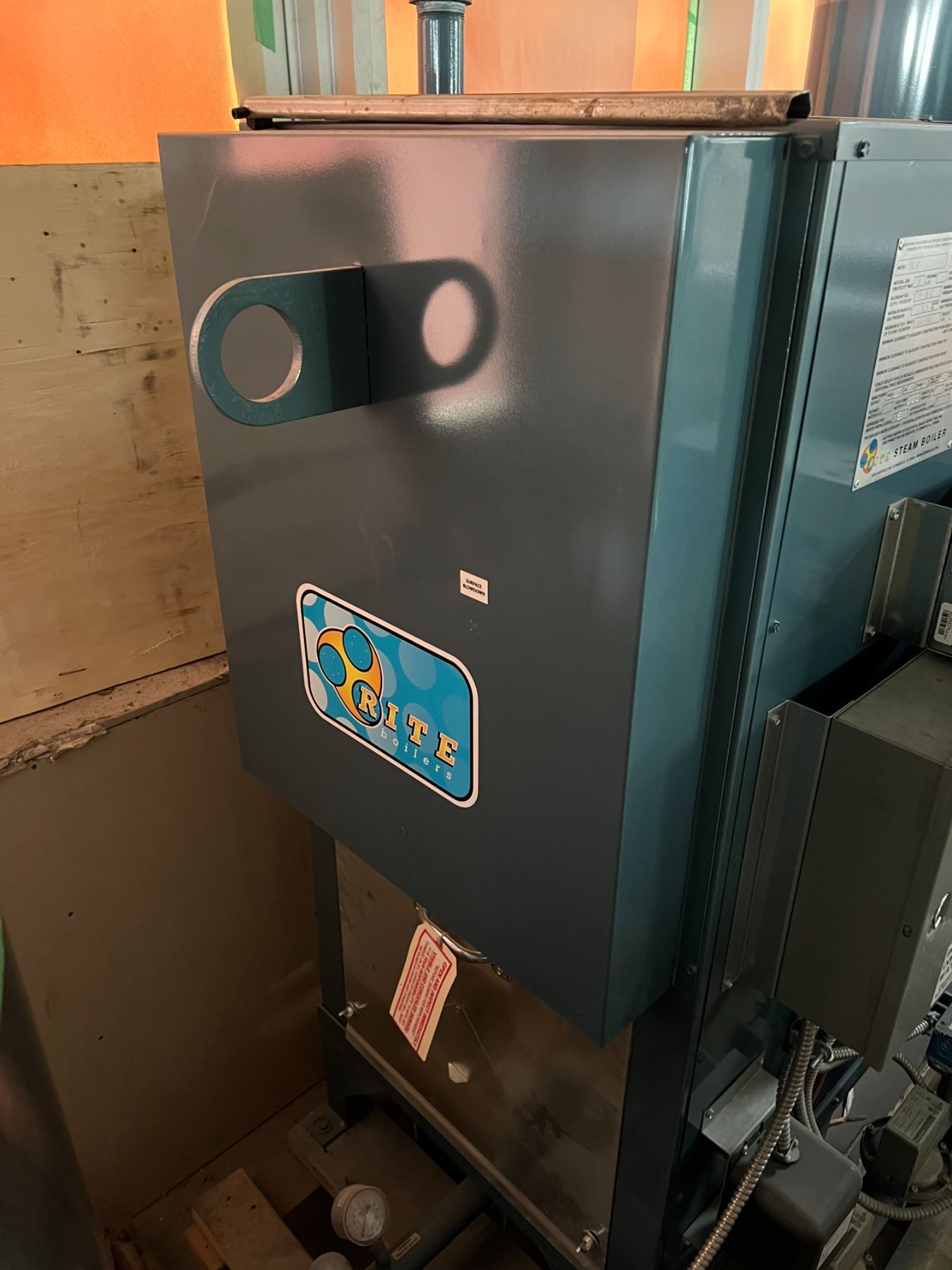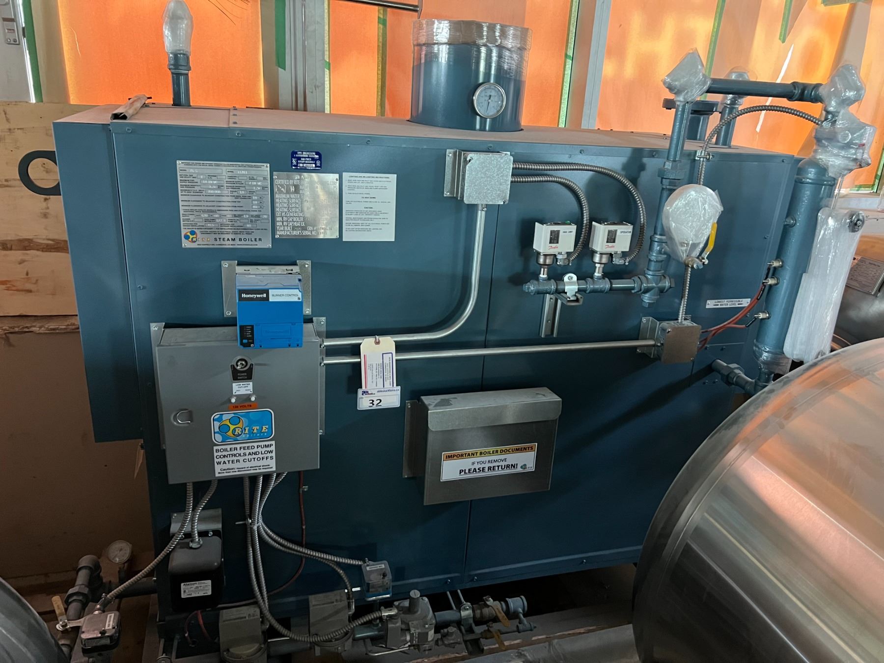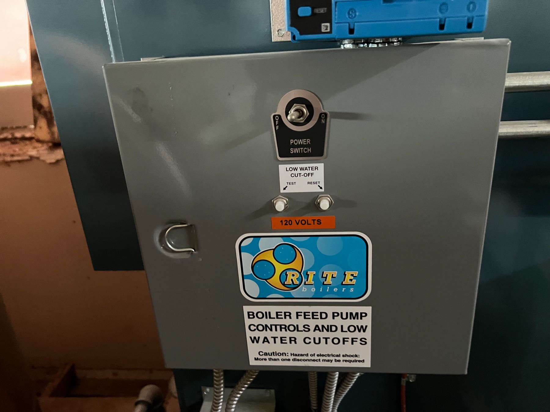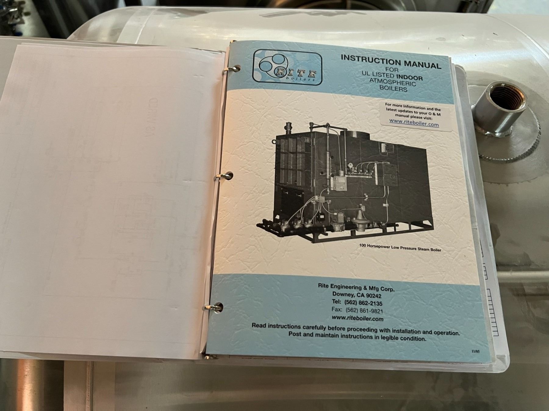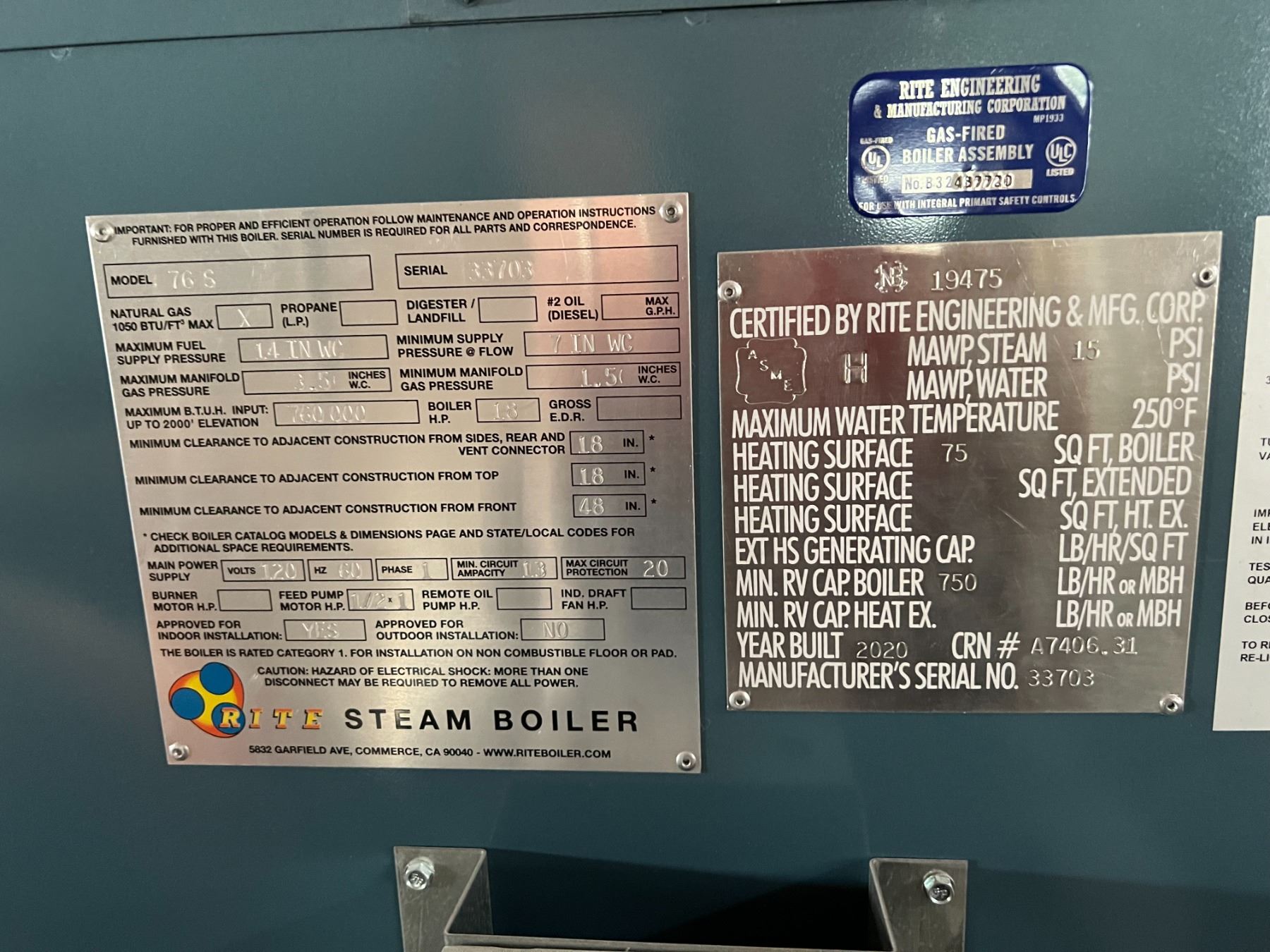 RITE ENGINEERING GAS-FIRED STEAM BOILER. MODEL 76S. MAXIMUM BTU 760,000. 18 HP BOILER. MAX WATER TEMP 250 DEGREES. 78X36X72" HIGH. HI/LO FIRE. WITH MANUAL