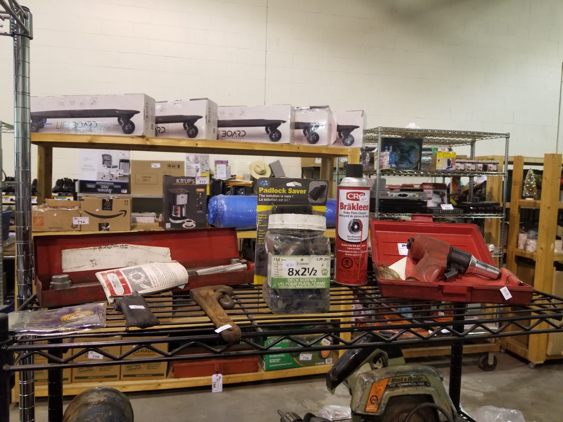 RIVET GUN, PADLOCK SAVER, SCREWS, BRAKE CLEANER, PIPE WRENCH, GREY ROCK HEAVY DUTY BRAKE SHOE TOOL SET, ETC