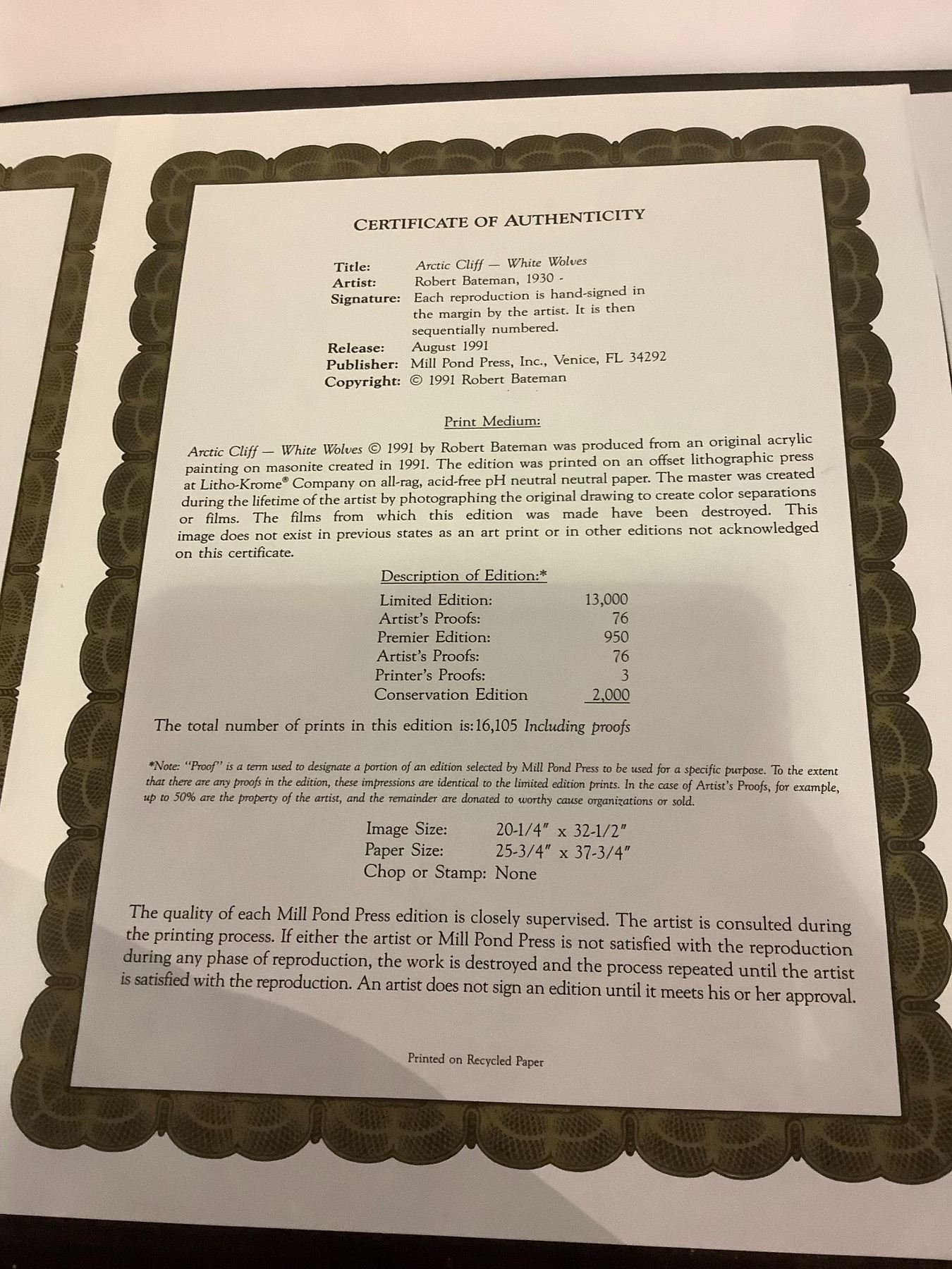 ROBERT BATEMAN ARTIST SIGNED LEP 8889/13000 WITH COA TITLED "ARCTIC CLIFF WHITE WOLVES"