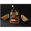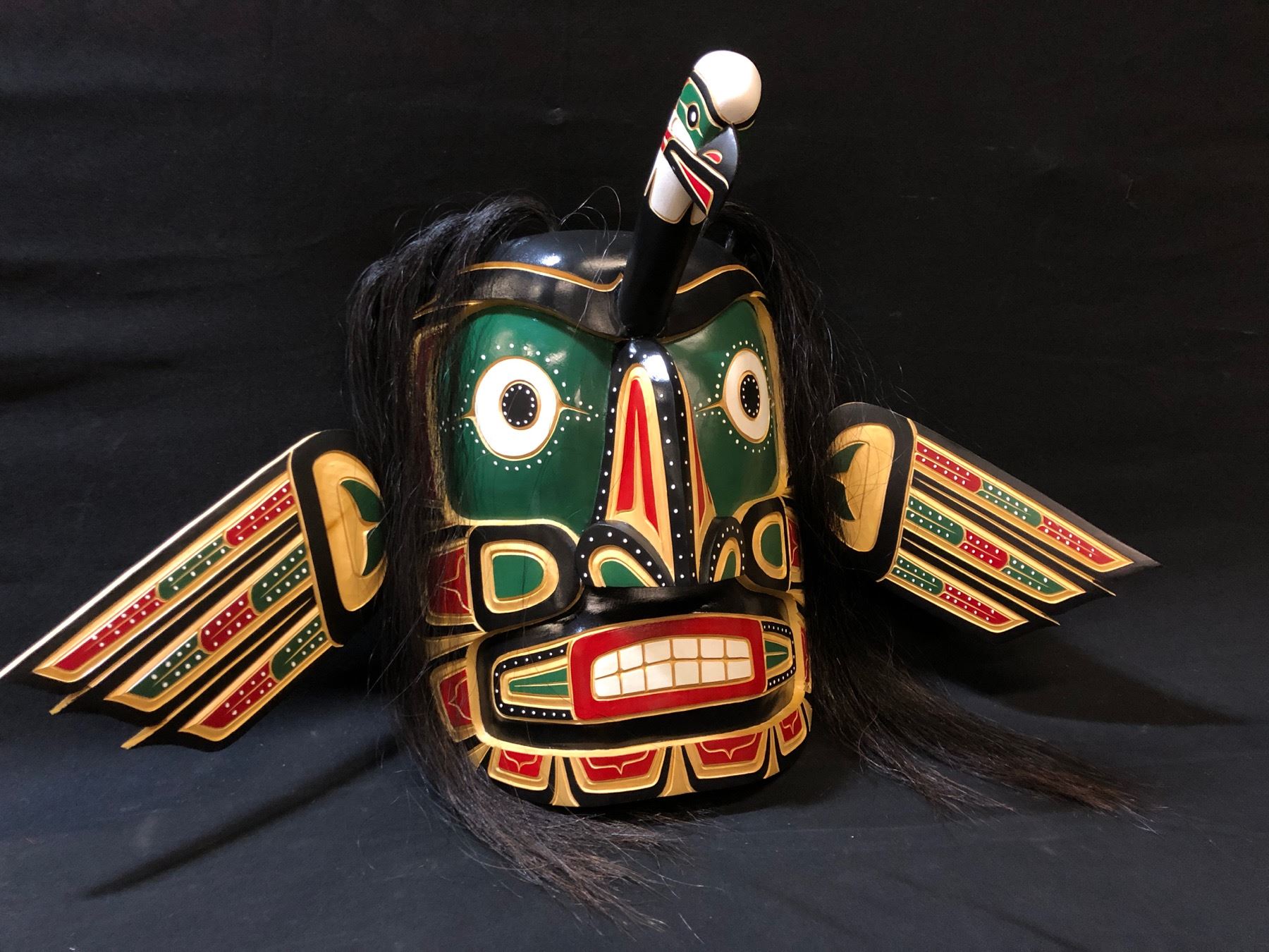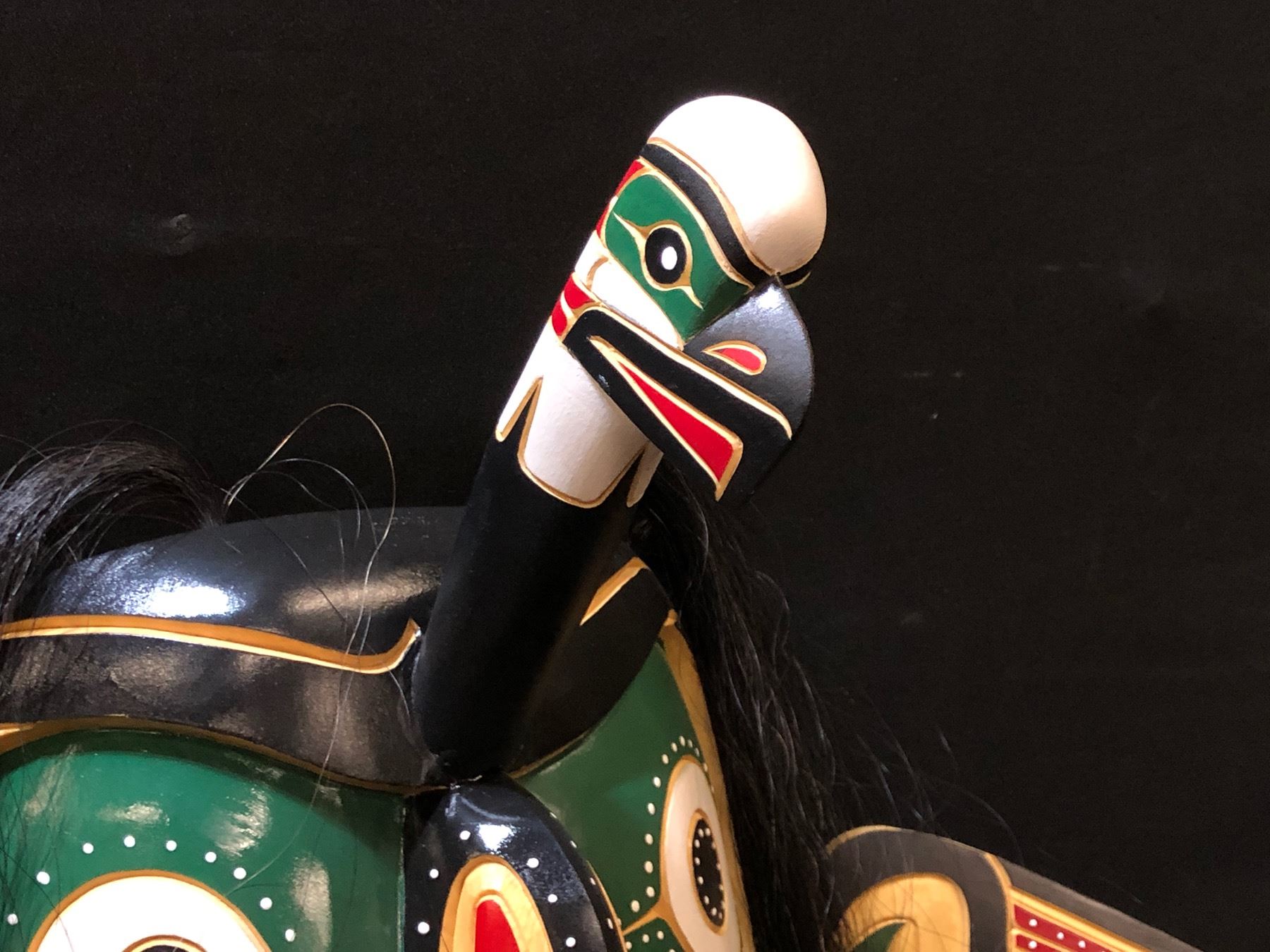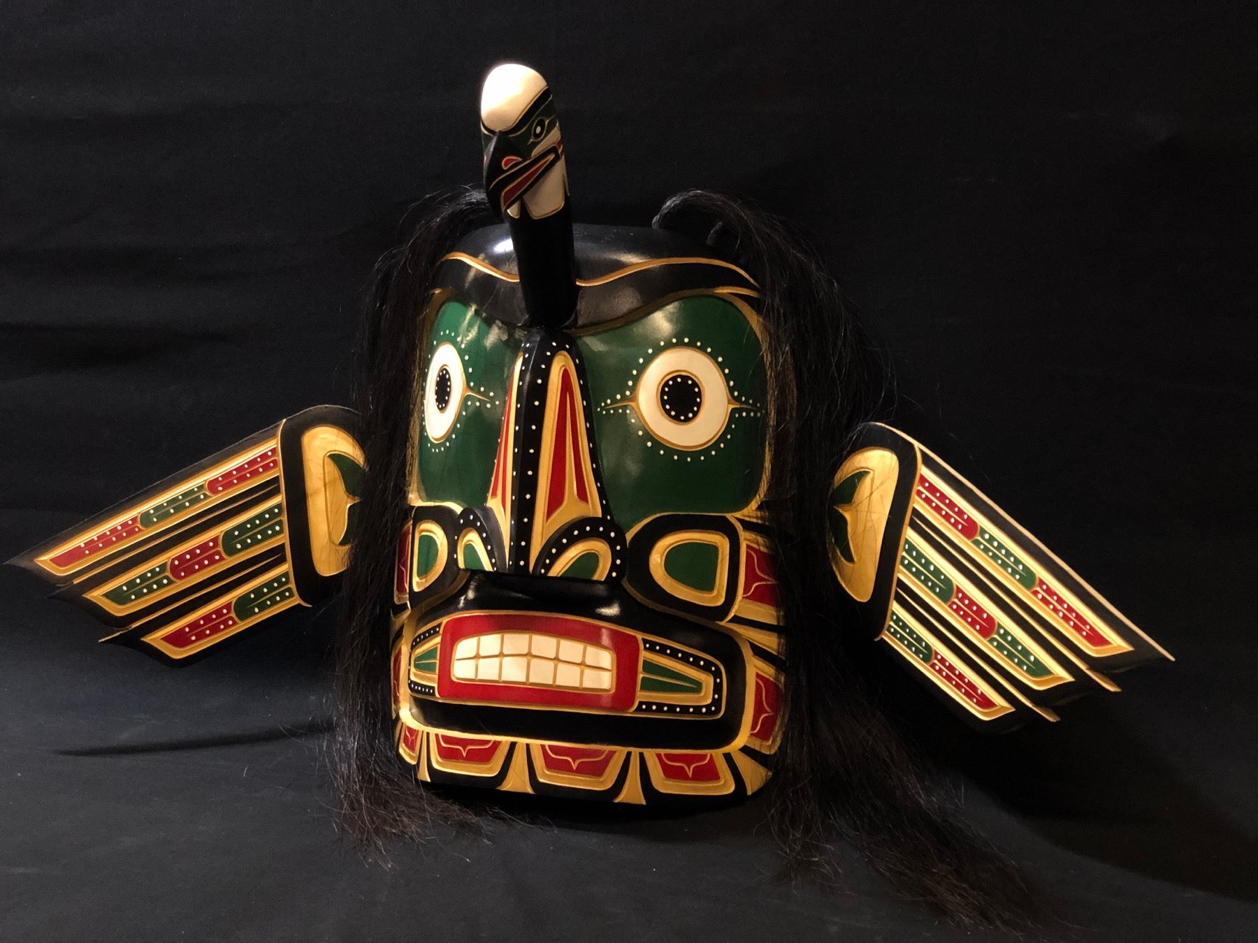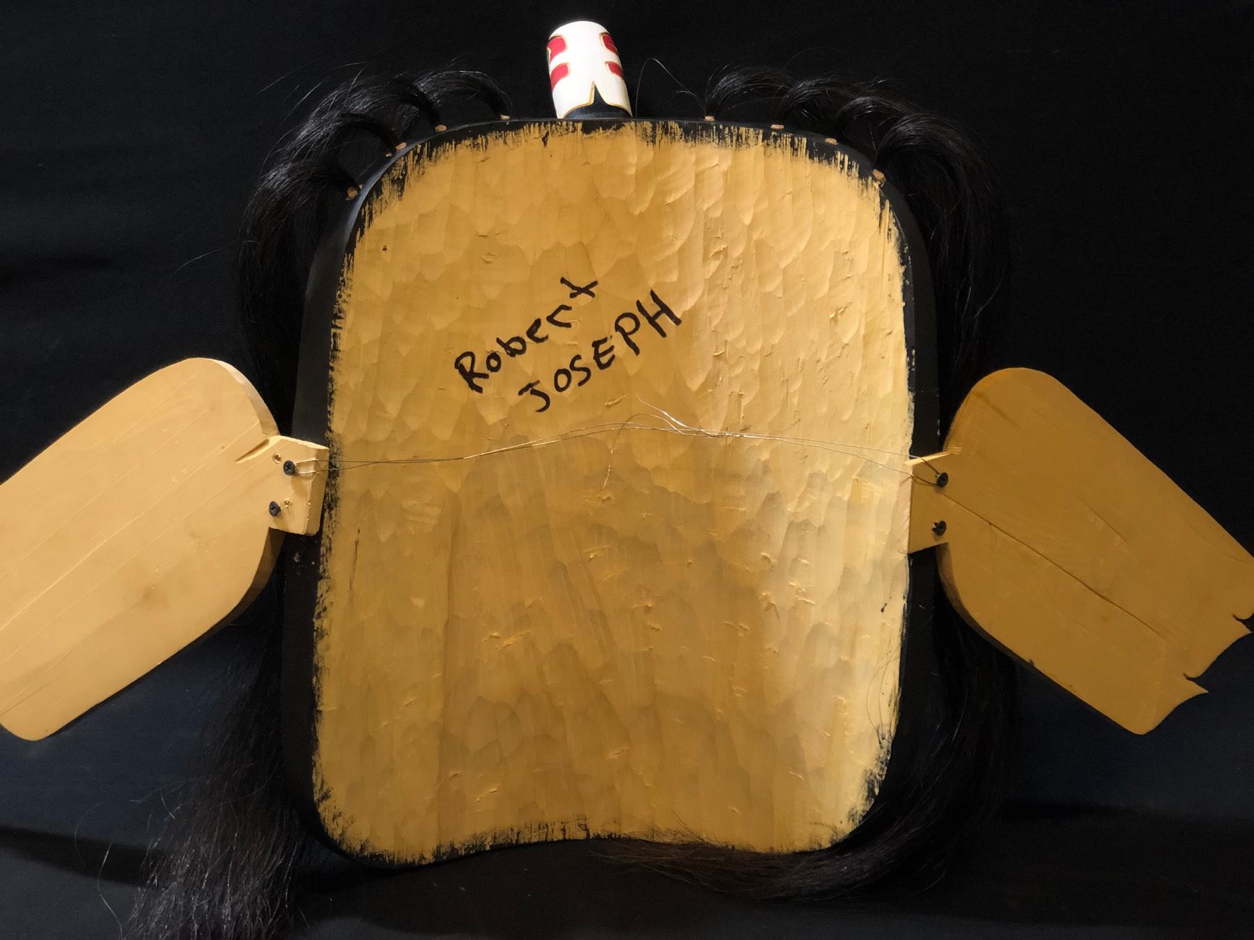 ROBERT JOSEPH, HAND CARVED AND PAINTED TRANSFORMATION MASK, FEATURING EAGLE AND HUMAN DESIGNS AND HORSE HAIR ACCENTS, 36'' WIDE X 22'' TALL