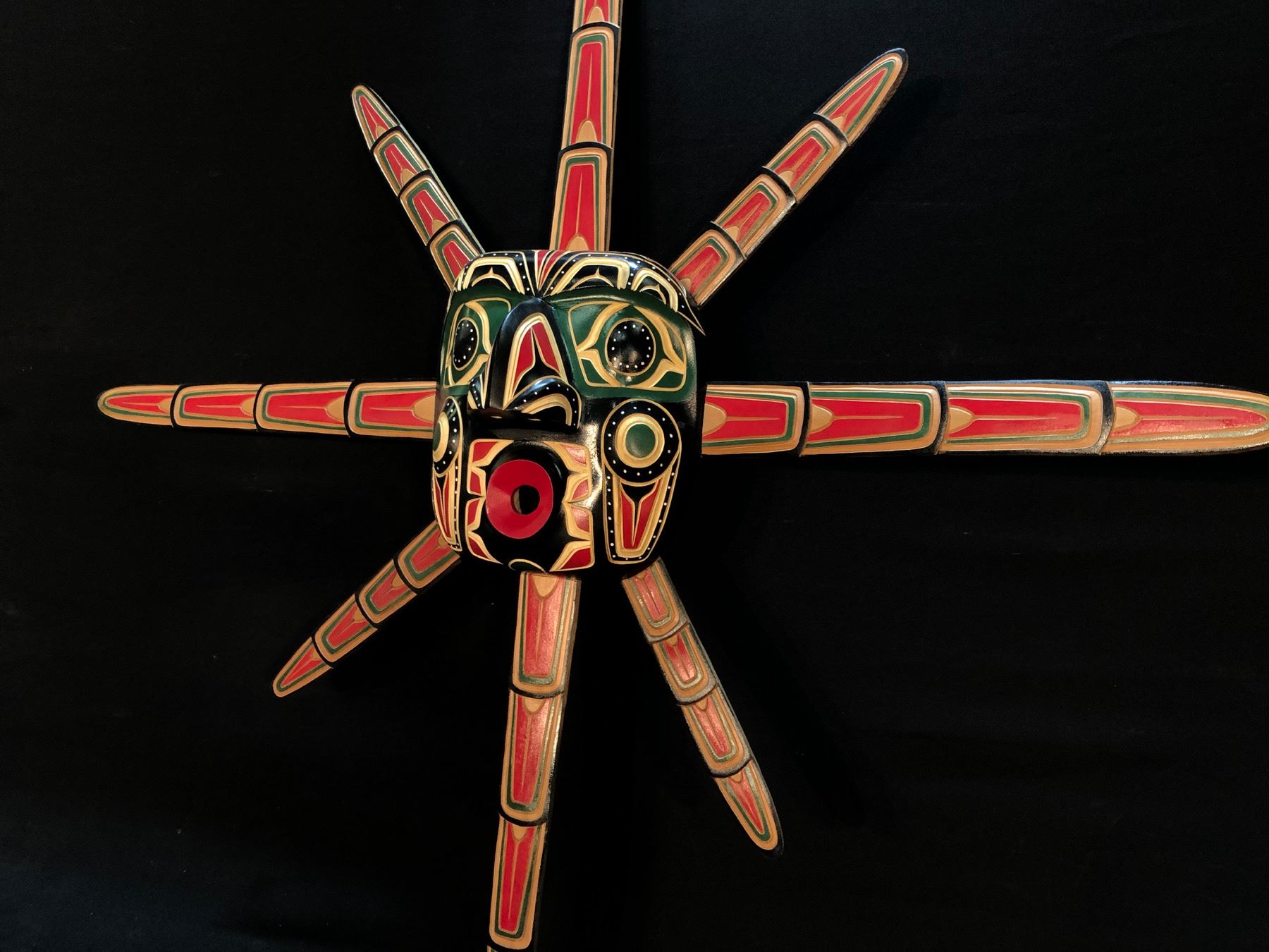 ROBERT JOSEPH, OF SQUAMISH NATION, HAND CARVED AND PAINTED 8 RAY SUN MASK WITH MAN DESIGNS, APPROX. 42'' TALL