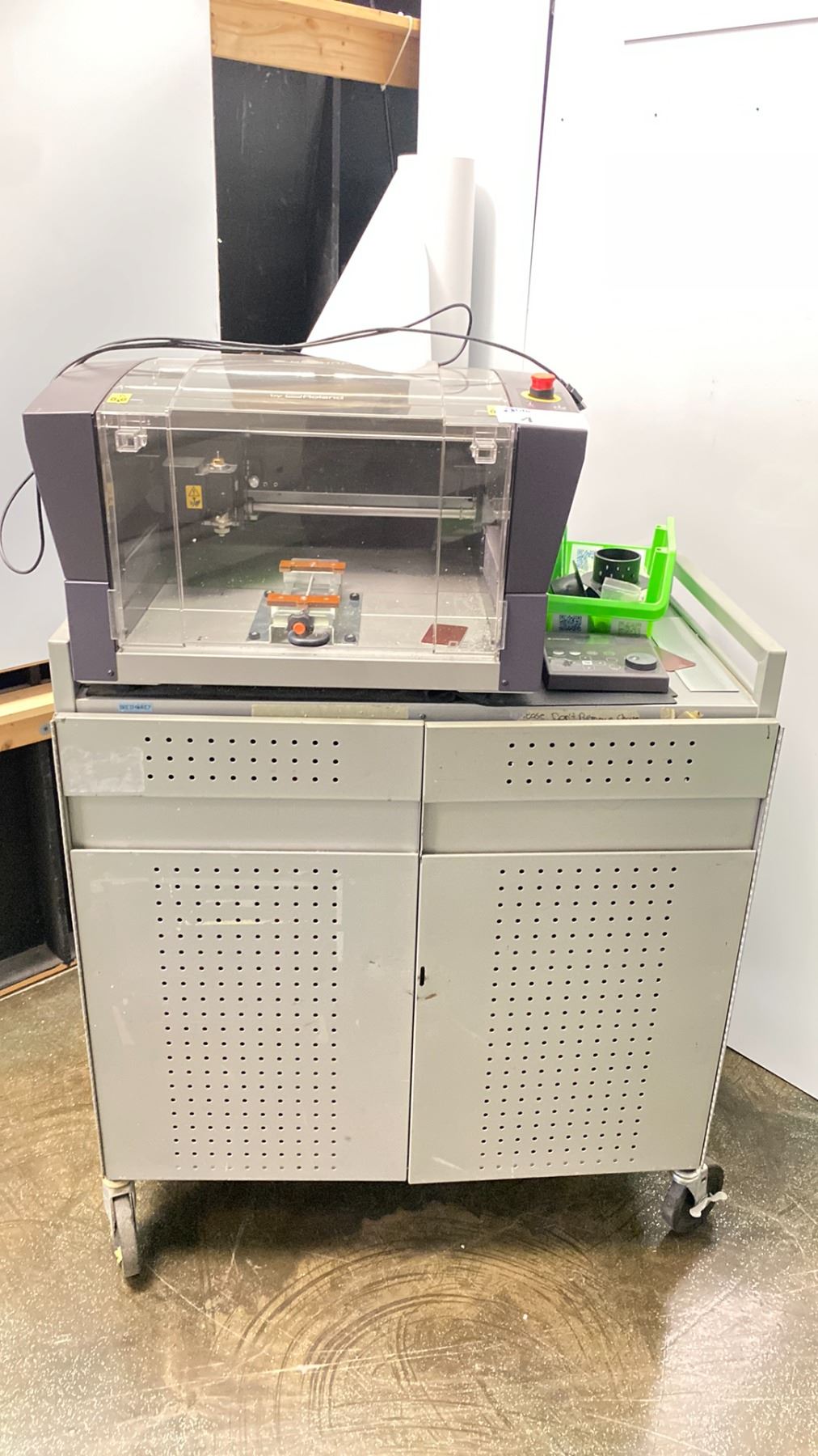 ROLAND DGSHAPE DE-3 DESKTOP ROTARY ENGRAVER SER#ZED0796 ON METAL ROLLING CART WITH ASSORTED CONTENTS (CART: 35.5"L X 21"W X 40"H) *ITEM LOCATED OFF SITE IN VANCOUVER*