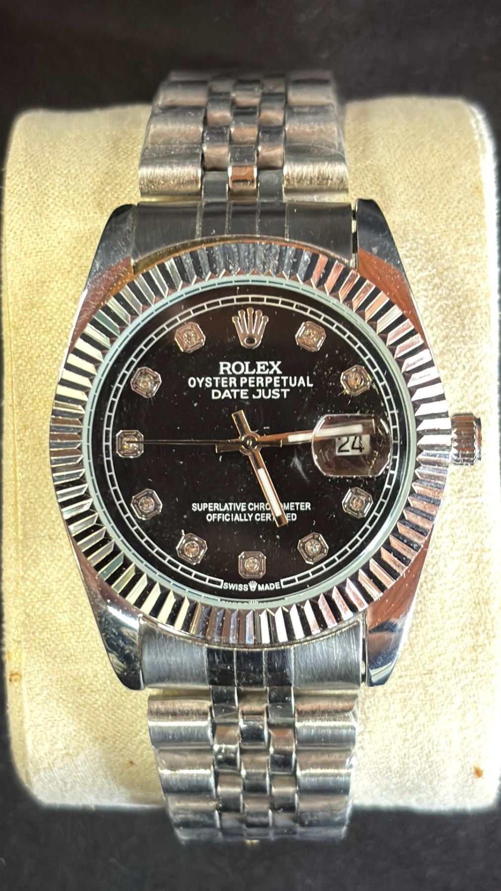 ROLEX DATEJUST REPLICA WATCH, STEEL BLACK DIAL, FLUTED BEZEL, JUBILEE BRACELET M126334