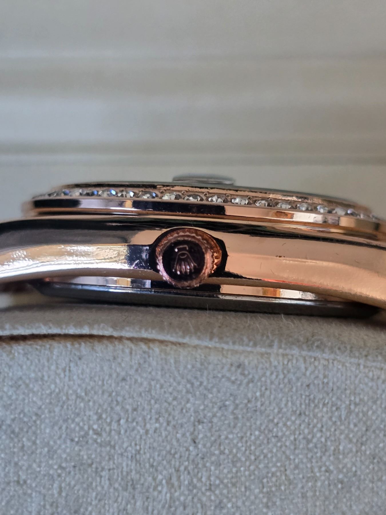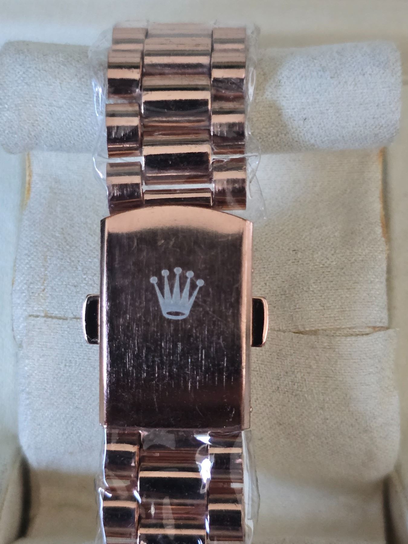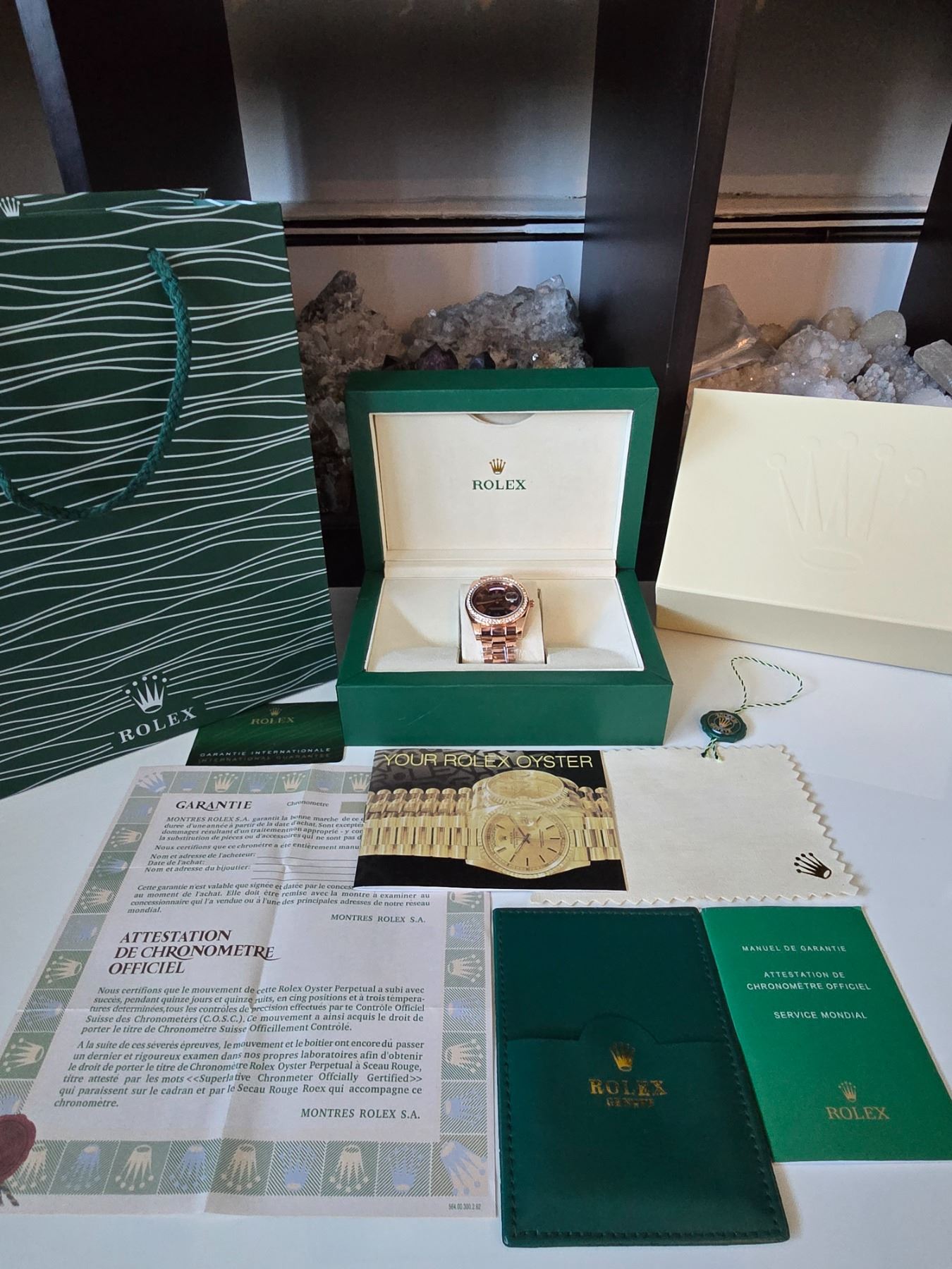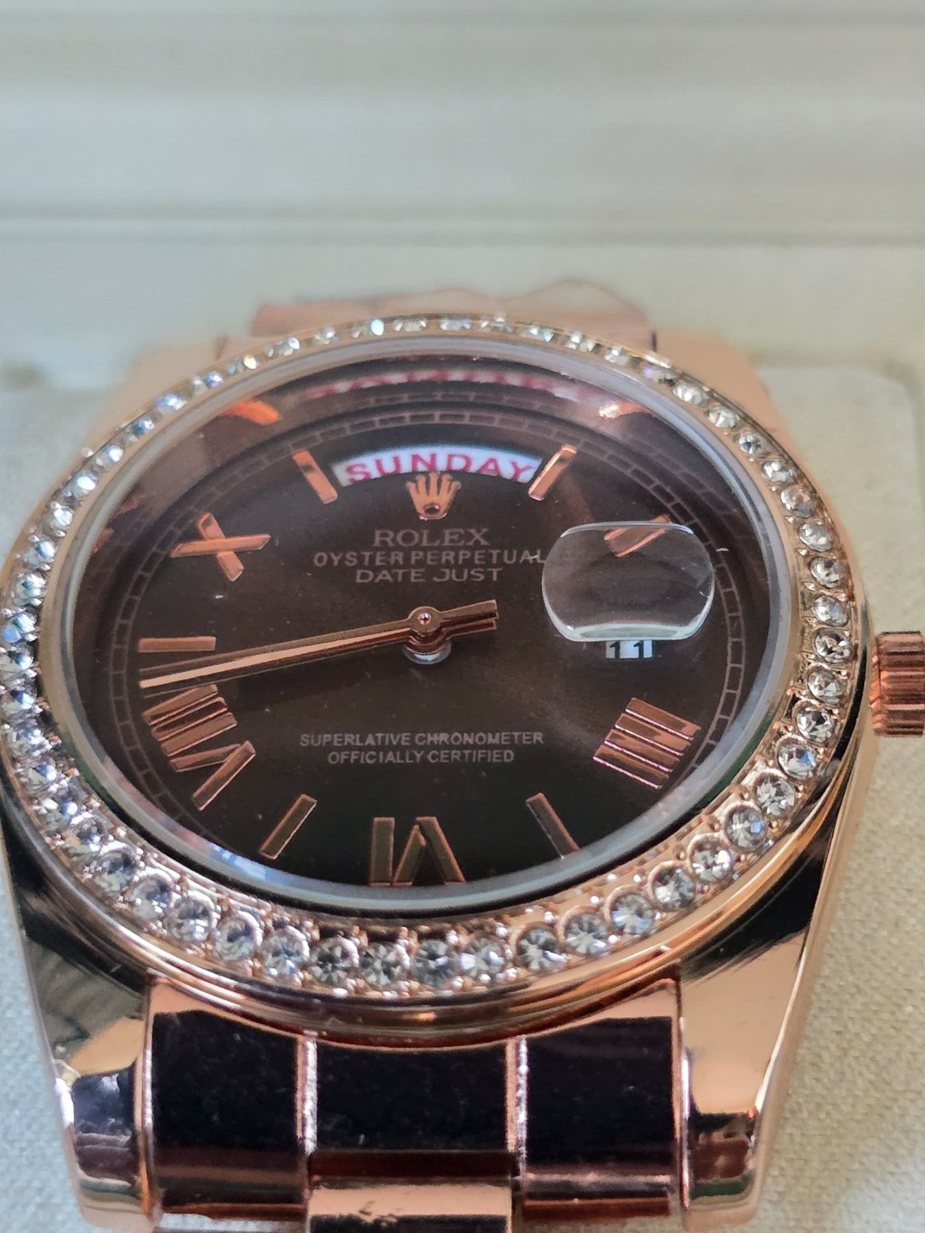 ROLEX DAY-DATE 40 MM CHOCOLATE DIAL REF. 228345RBR ROLEX REPLICA WATCH ORIGINAL HAS 18K ROSE GOLD WITH DIAMONDS BEZEL. 18K ROSE GOLD CASE AND OYSTER BRACELET. FULL SET WITH BOX, PAPERS AND BAG.