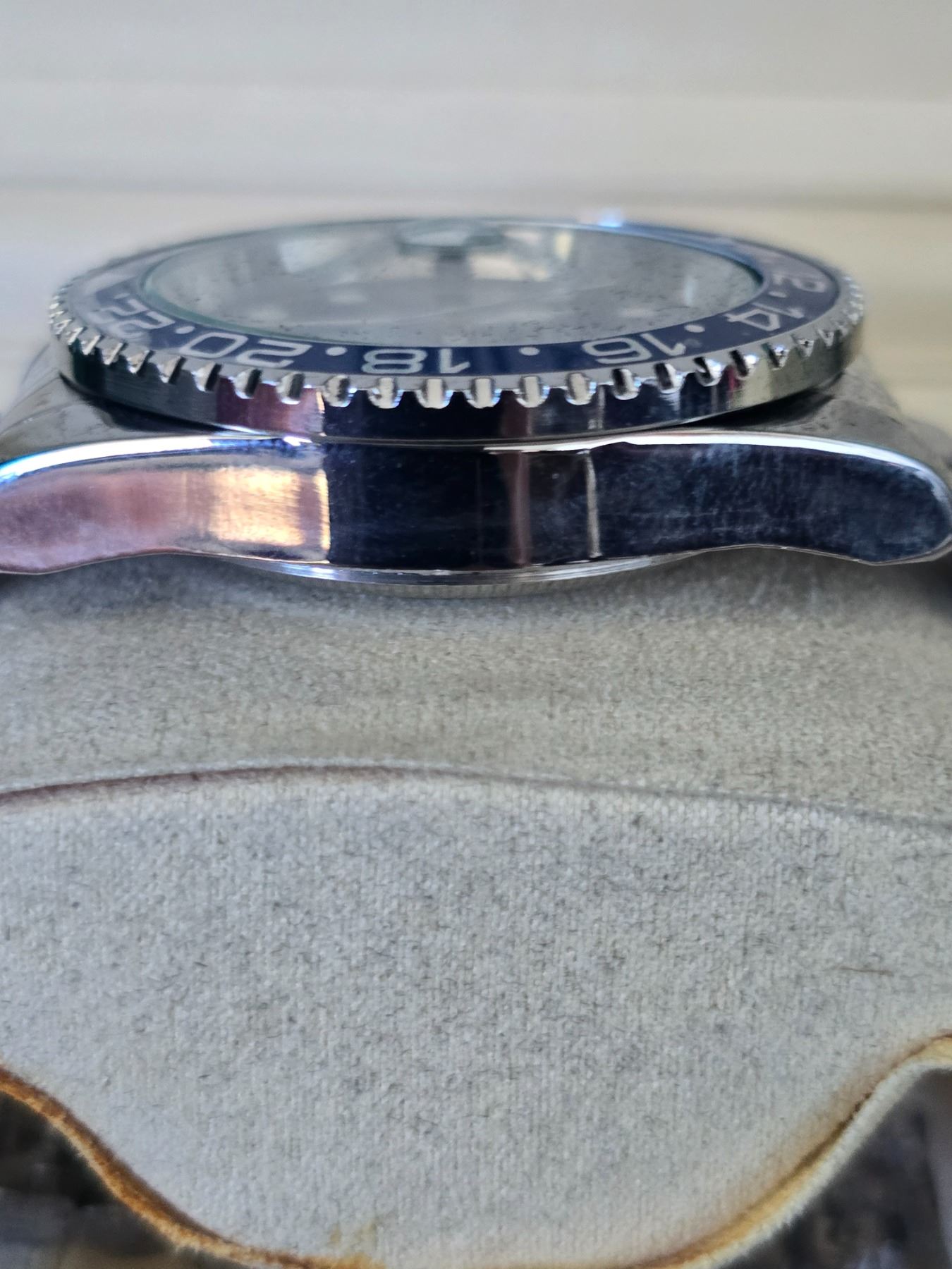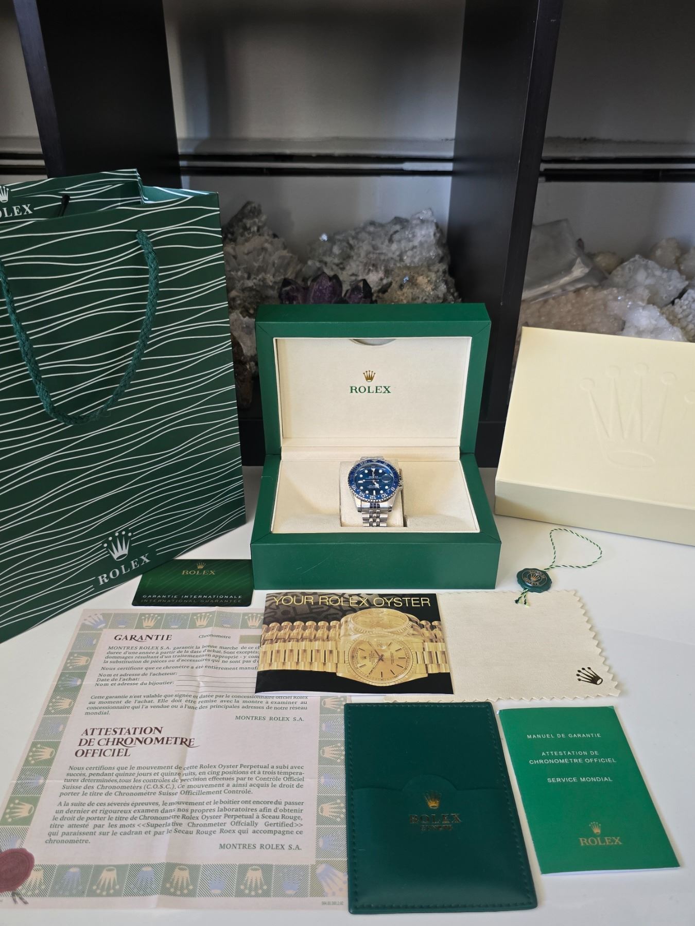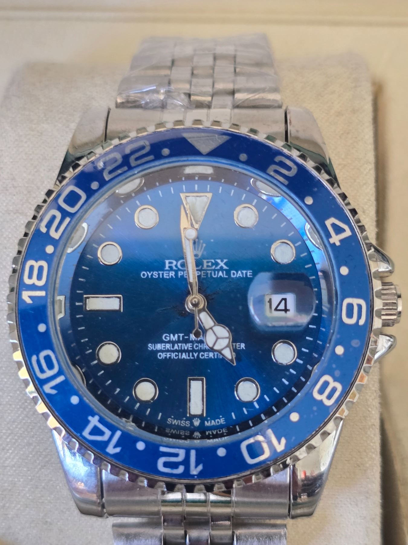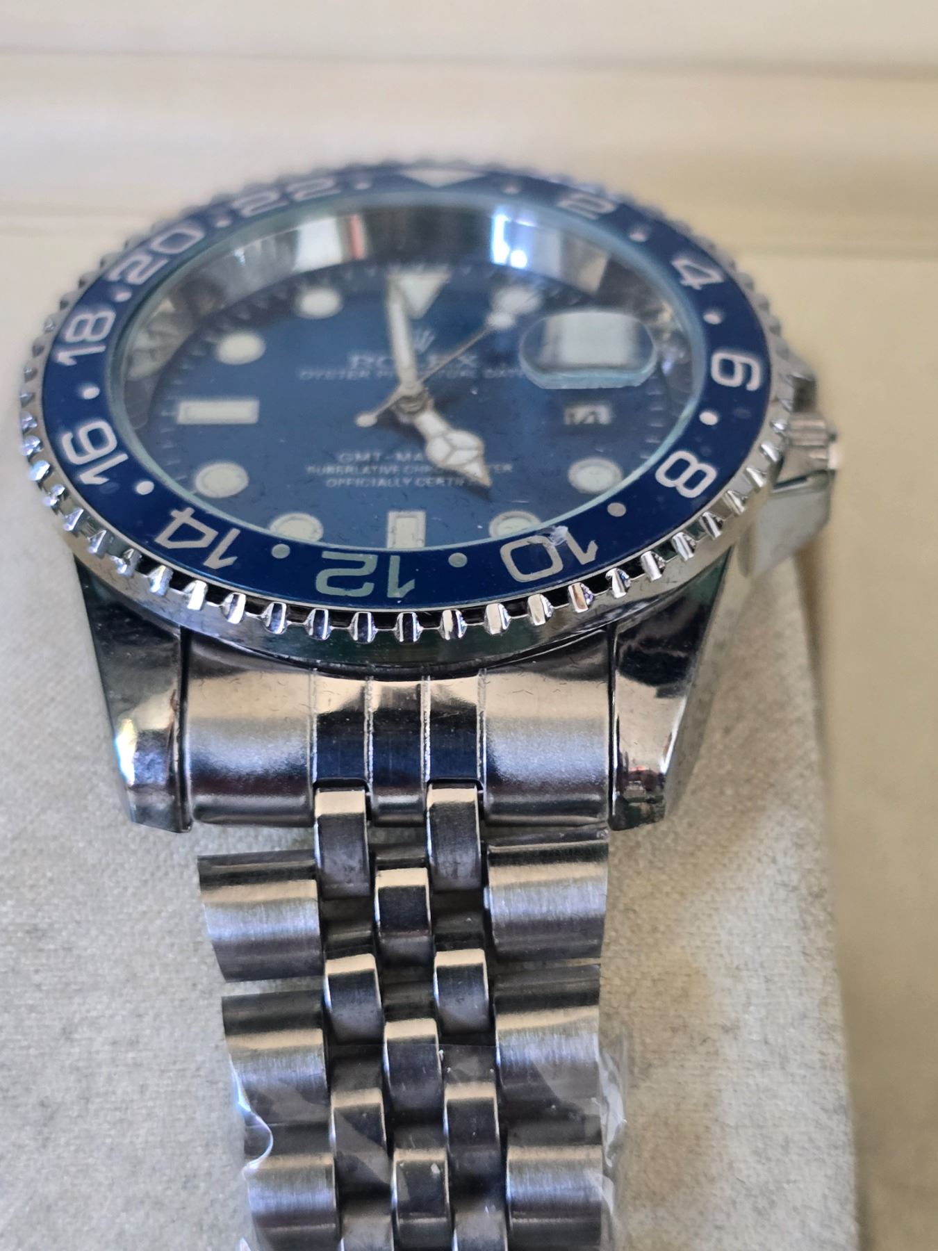ROLEX GMT MASTER II BLUE DIAL AND BEZEL ROLEX REPLICA WATCH ORIGINAL HAS STAINLESS-STEEL CASE AND JUBILEE BBRACELET. FULL SET WITH BOX, PAPERS AND BAG