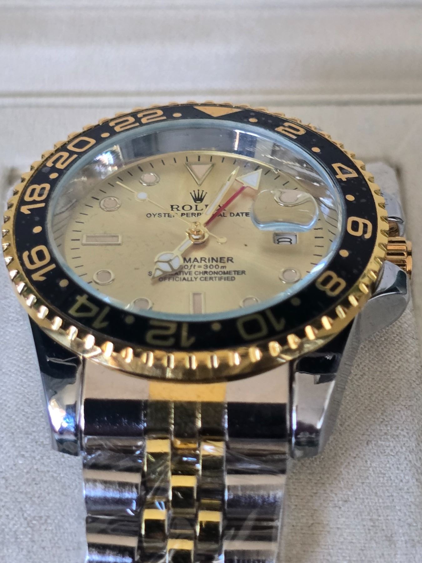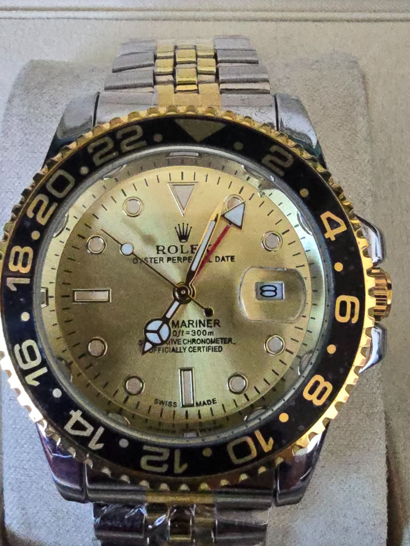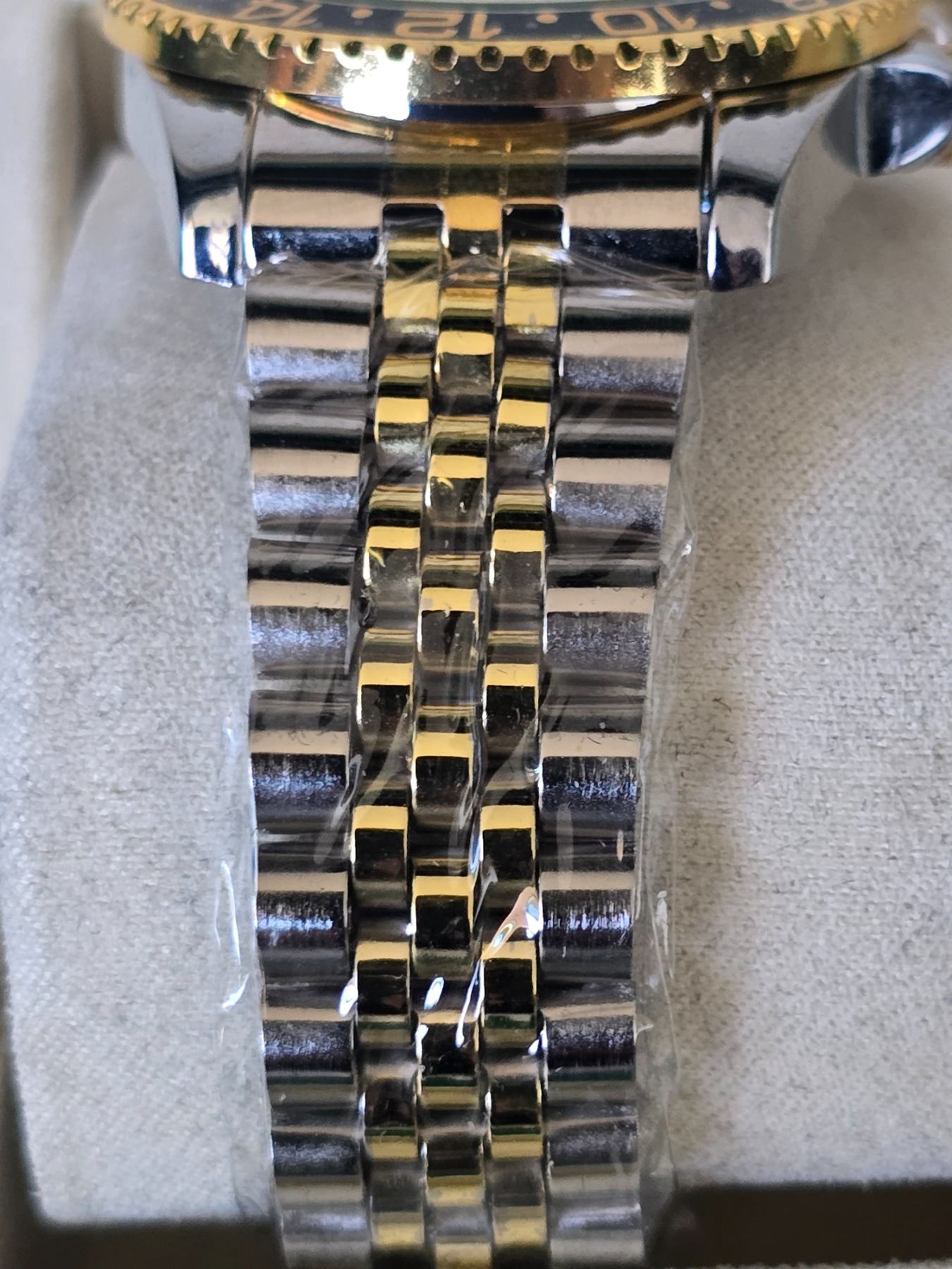 ROLEX GMT MASTER II GOLDEN DIAL AND BLACK BEZEL REF. 16713 ROLEX REPLICA WATCH. ORIGINAL HAS 2 TONE 18K YELLOW GOLD/STAINLESS-STEEL CASE AND JUBILEE BRACELET FULL SET WITH BOX, PAPERS AND BAG.