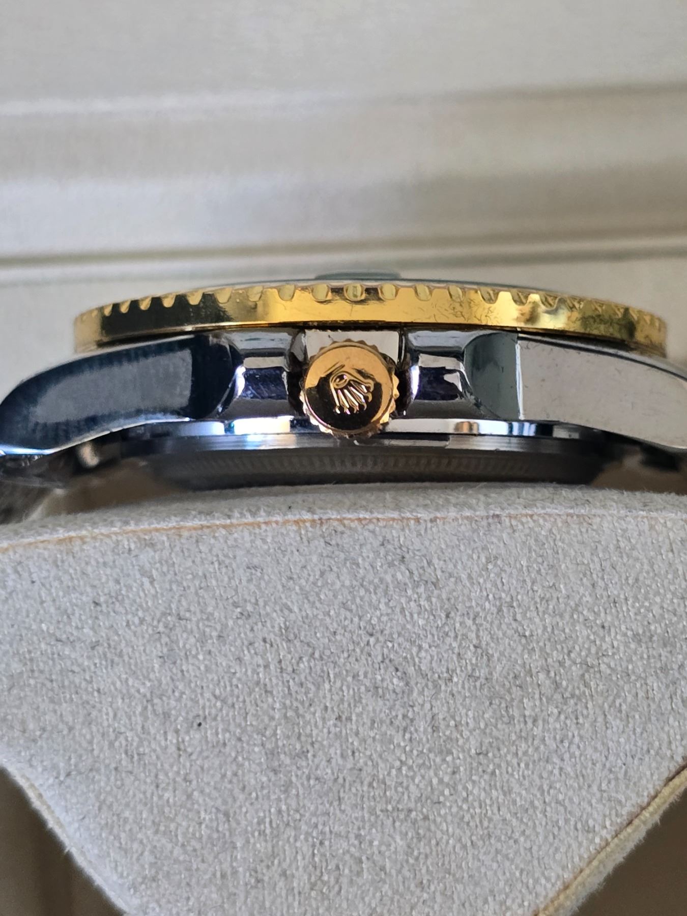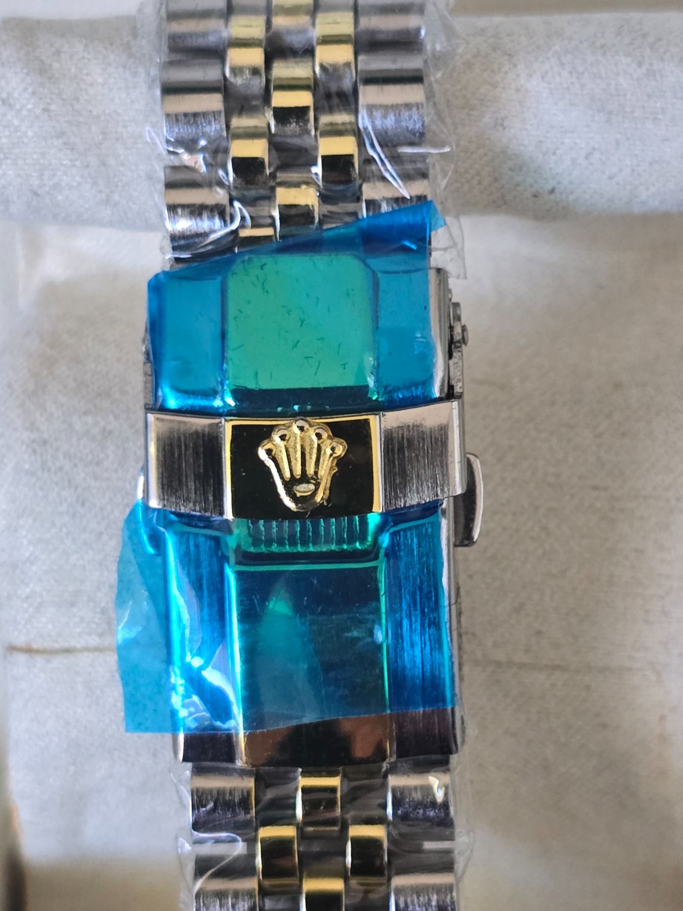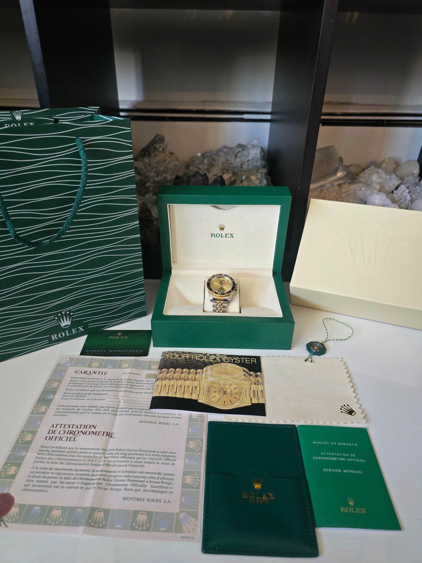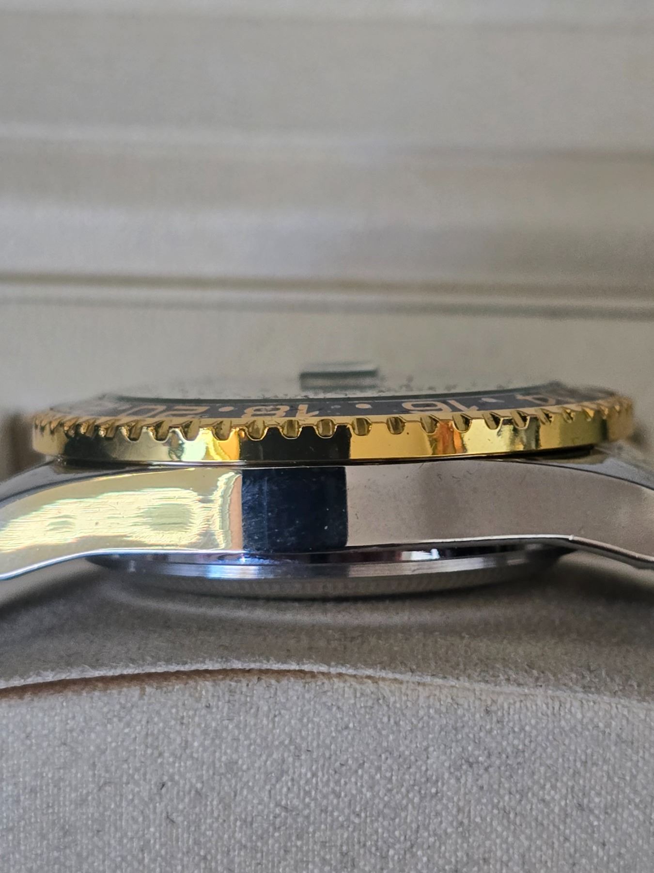 ROLEX GMT MASTER II GOLDEN DIAL AND BLACK BEZEL REF. 16713 ROLEX REPLICA WATCH. ORIGINAL HAS 2 TONE 18K YELLOW GOLD/STAINLESS-STEEL CASE AND JUBILEE BRACELET FULL SET WITH BOX, PAPERS AND BAG.
