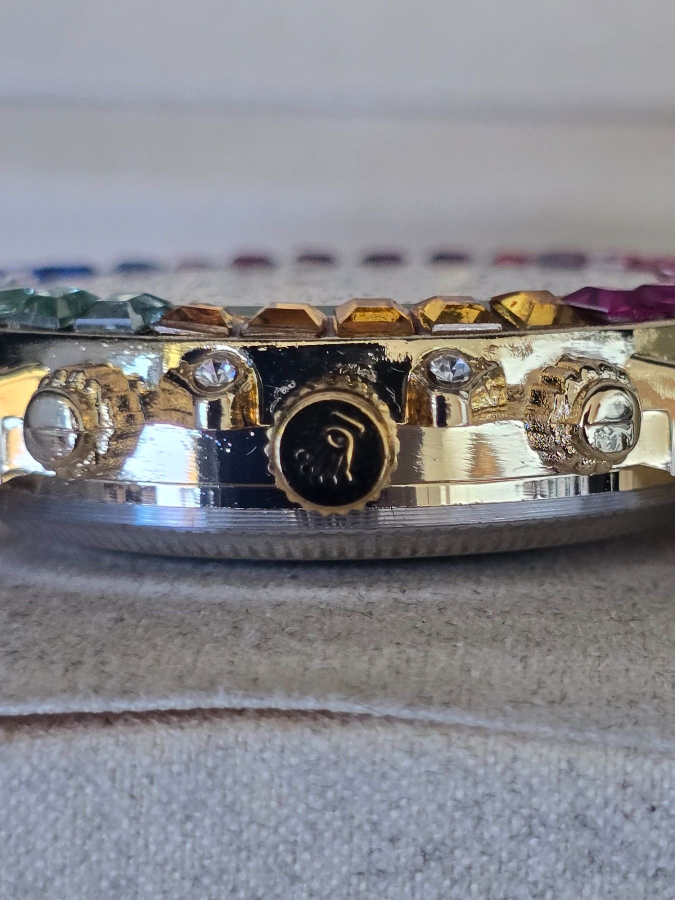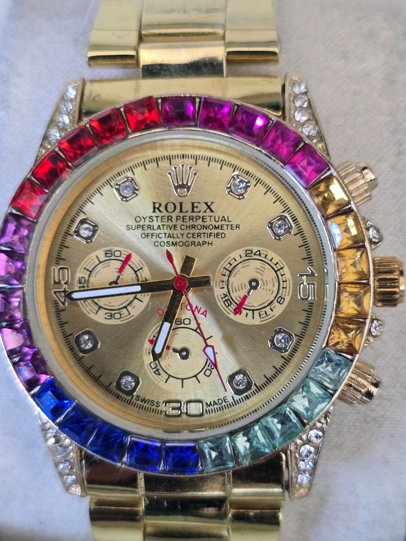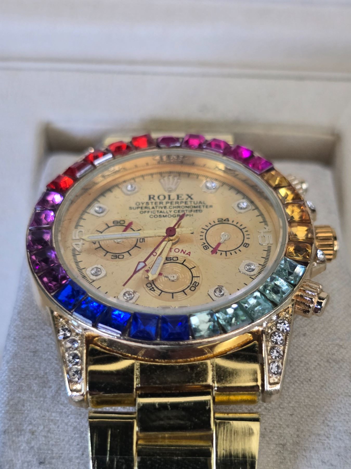 ROLEX OYSTER PERPETUAL COSMOGRAPH DAYTONA REF.116598 RBOW ROLEX REPLICA WATCH GOLDEN DIAL WITH DIAMOND INDEX AND DIAMOND BEZEL ORIGINAL HAS 18K YELLOW GOLD CASE AND OYSTER BRACELET FULL SET WITH BOX, PAPERS AND BAG