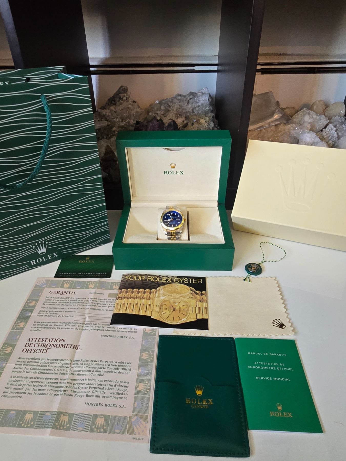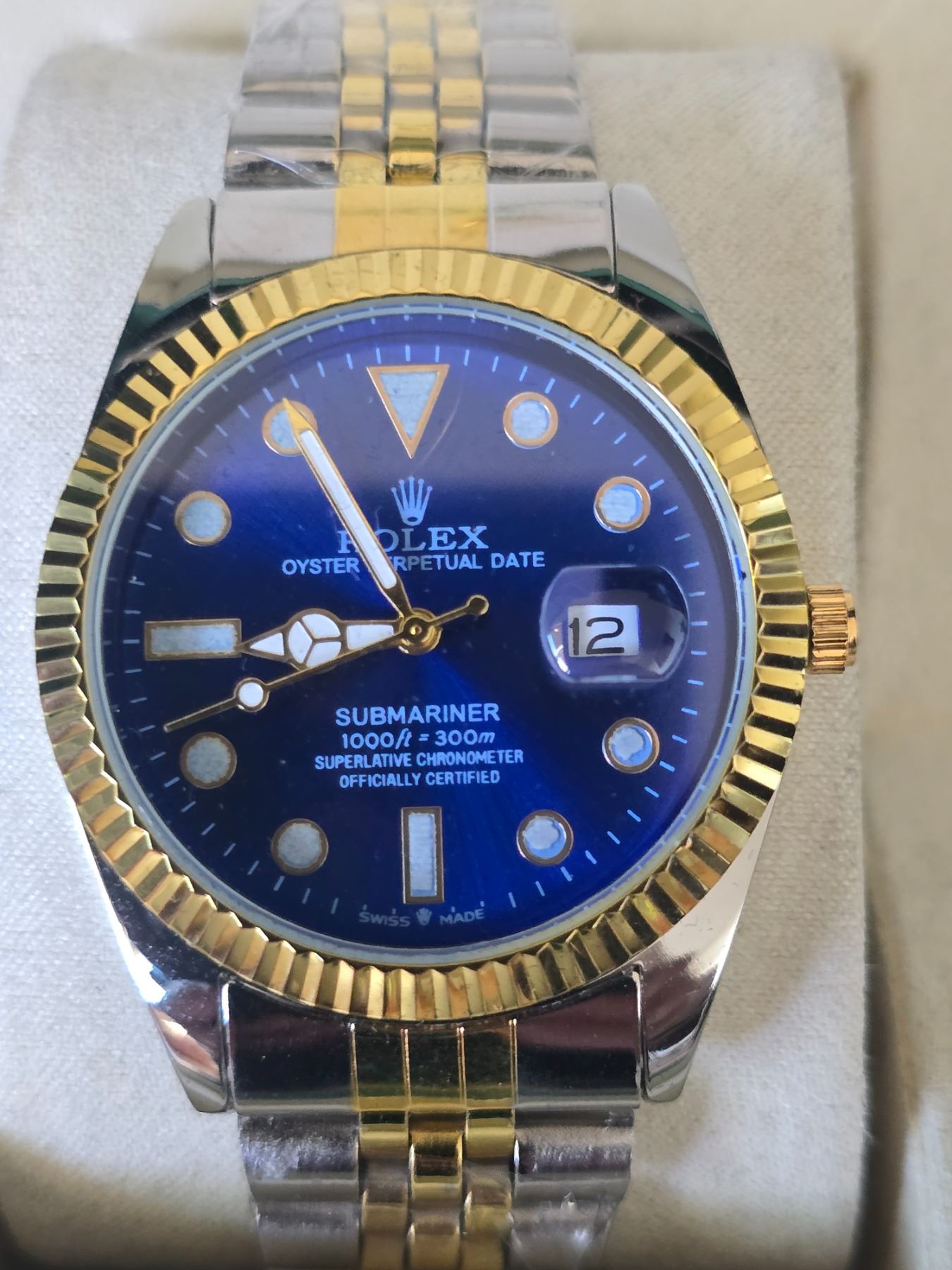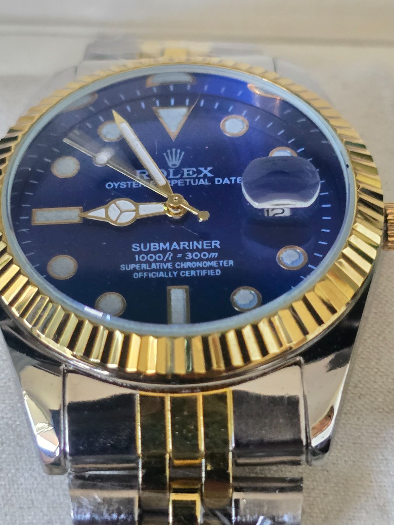 ROLEX SUBMARINER 40 MM BLUE DIAL WITH WHITE/GOLD INDEXES ROLEX REPLICA WATCH ORIGINAL HAS 18K YELLOW GOLD WITH BEZEL. 2 TONE CASE AND JUBILEE BRACELET. FULL SET WITH BOX, PAPERS AND BAG.