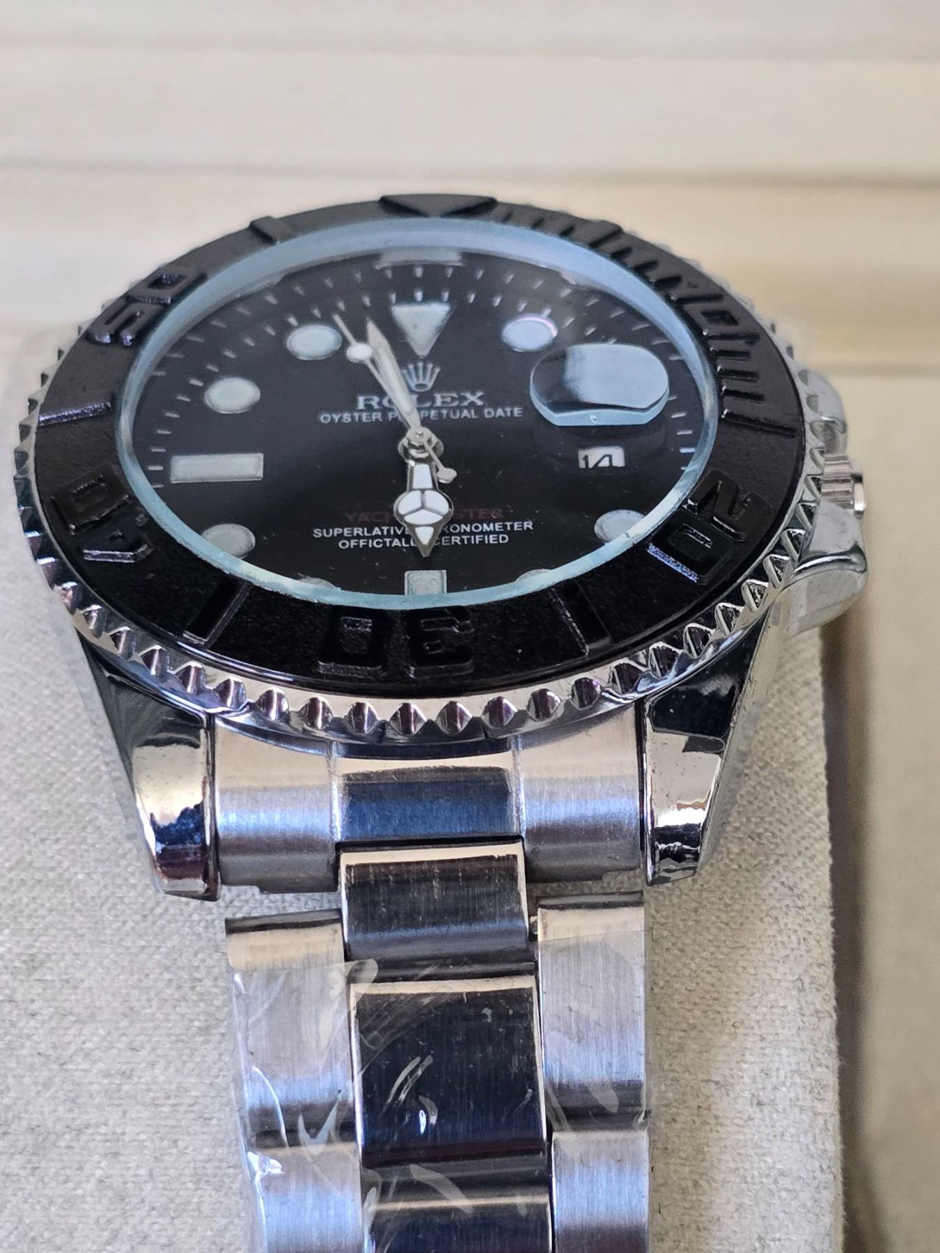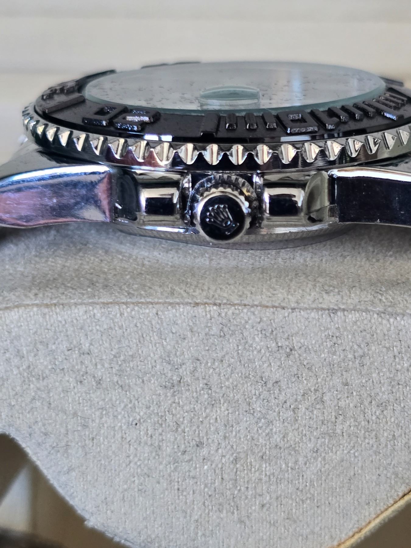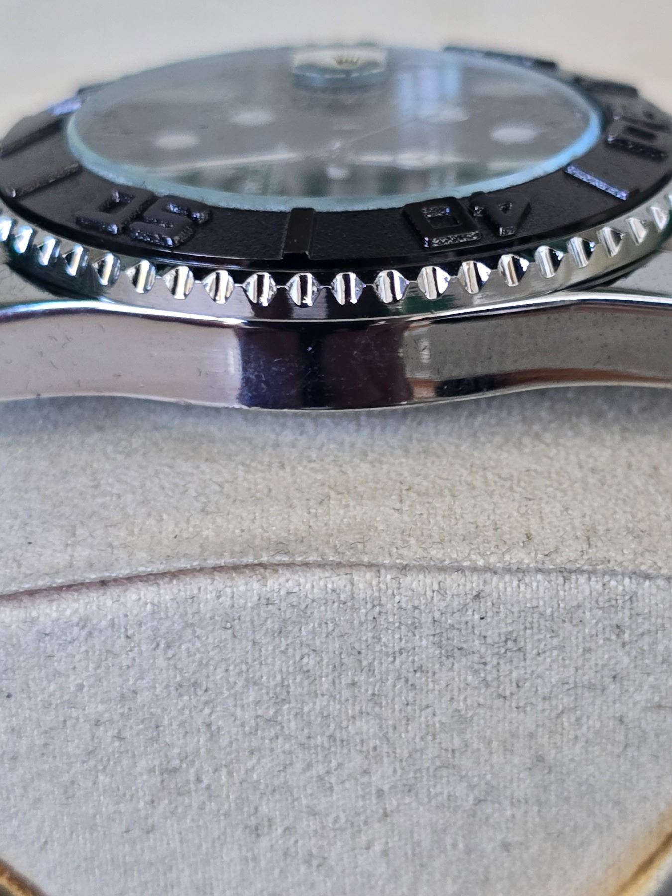 ROLEX YACHT-MASTER REF. 116622EW ROLEX REPLICA WATCH. BLACK DIAL WITH WHITE INDEXES ORIGINAL HAS TITANIUM CASE AND JUBILEE BRACELET AND CERAMIC BEZEL. FULL SET WITH BOX, PAPERS AND BAG.