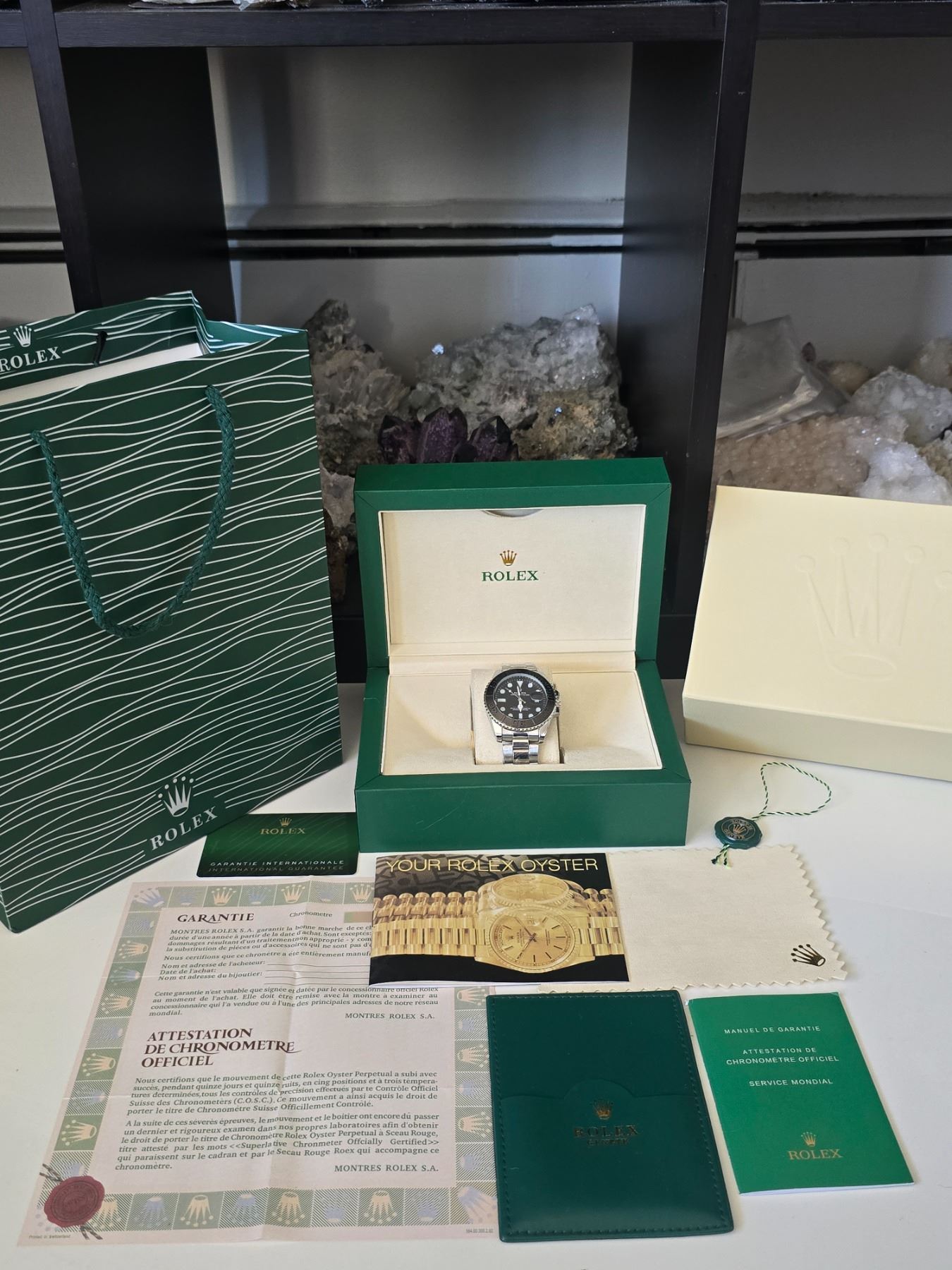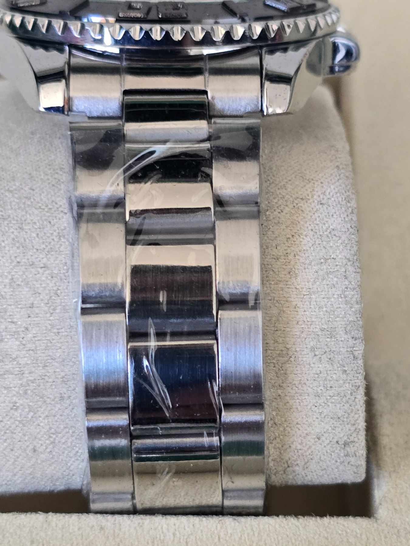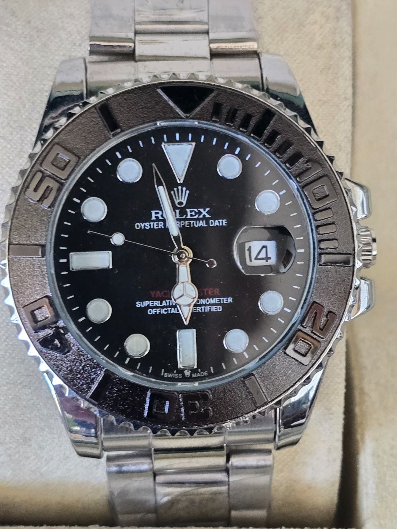 ROLEX YACHT-MASTER REF. 116622EW ROLEX REPLICA WATCH. BLACK DIAL WITH WHITE INDEXES ORIGINAL HAS TITANIUM CASE AND JUBILEE BRACELET AND CERAMIC BEZEL. FULL SET WITH BOX, PAPERS AND BAG.