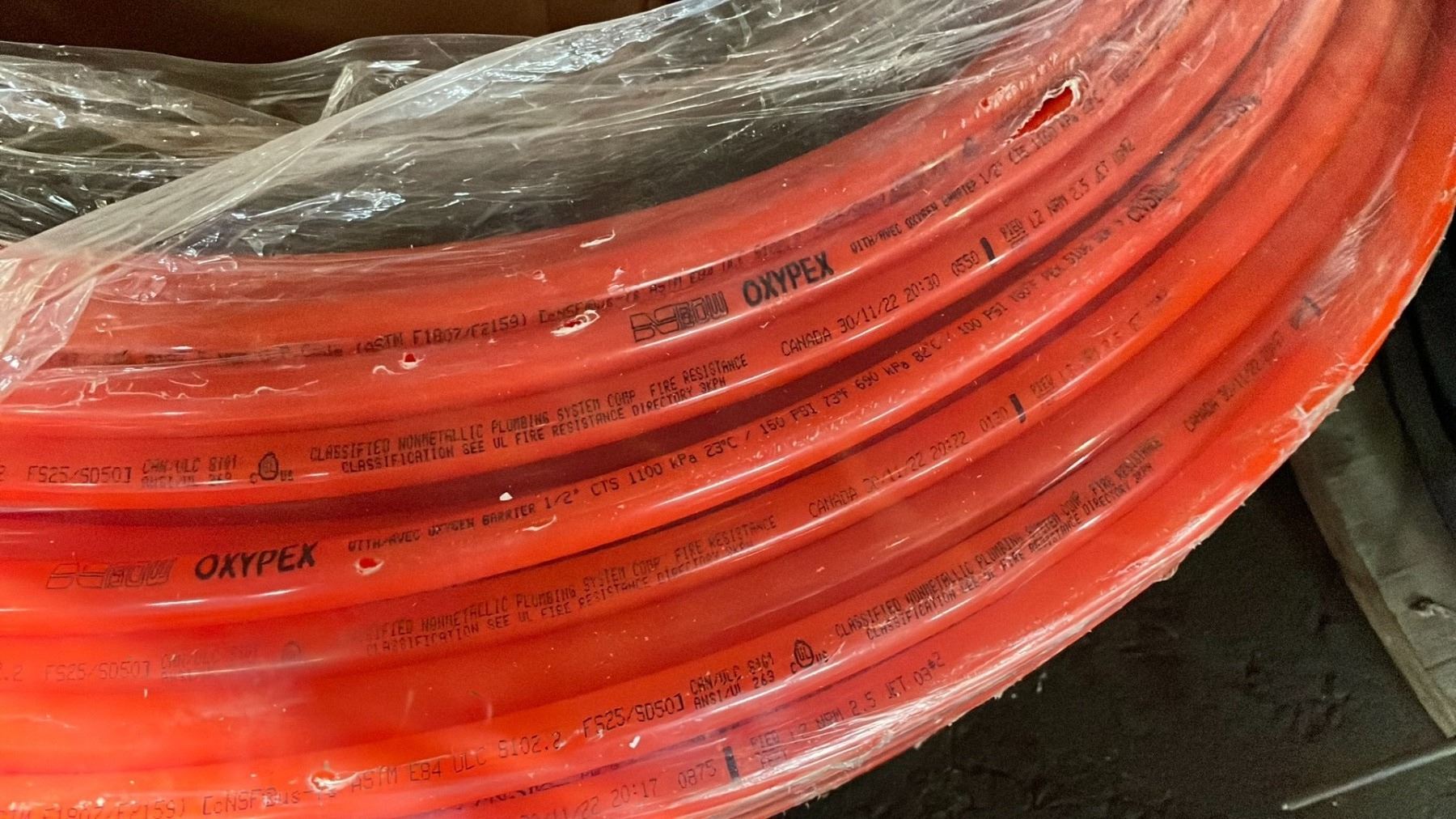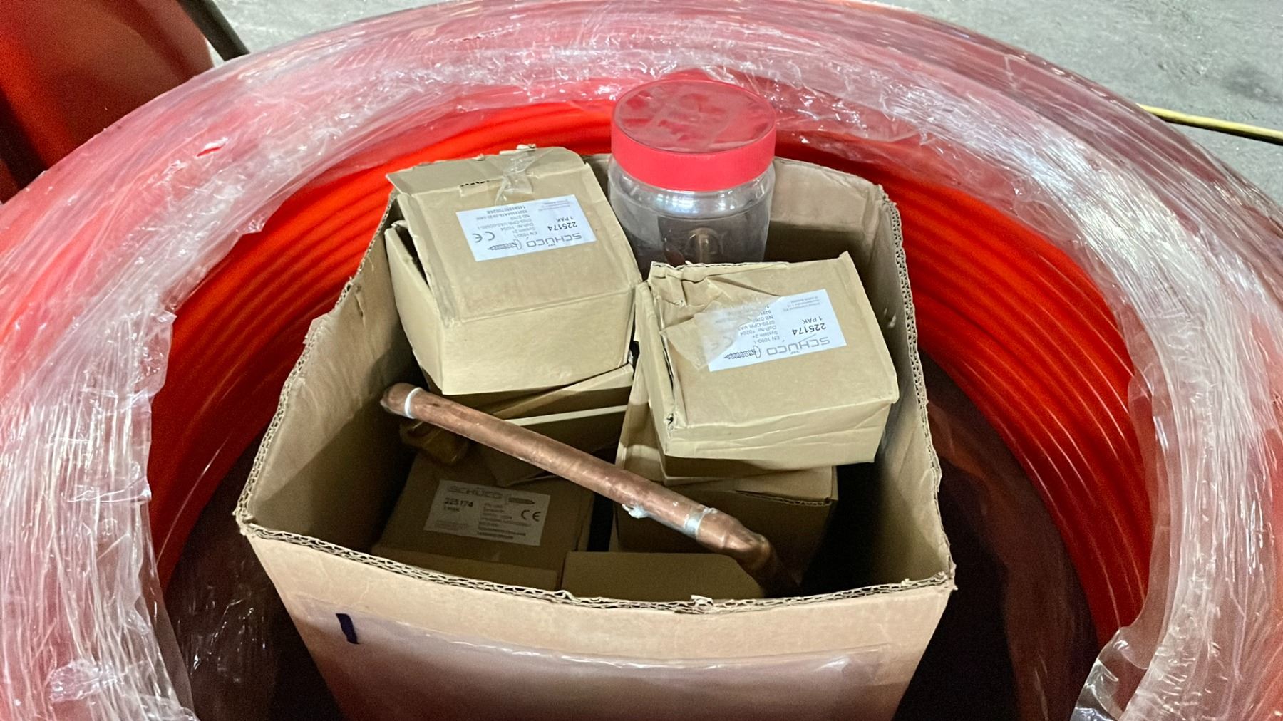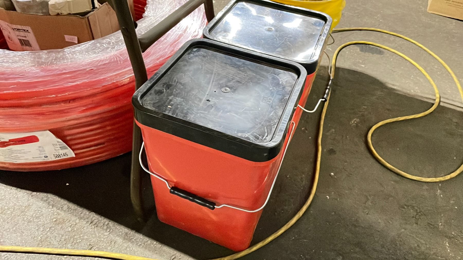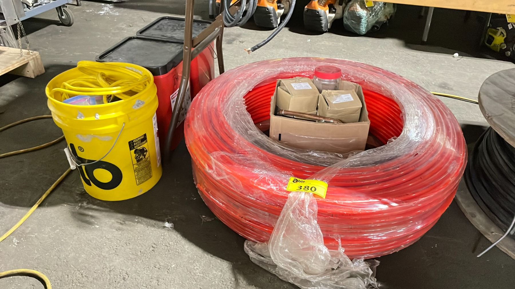 ROLL OF OXYPEX 1/2" INDUSTRIAL AIR BARRIER HOSE, BOX & 3 PAILS OF ASSORTED PLUMBING HARDWARE / JUMPER CABLES