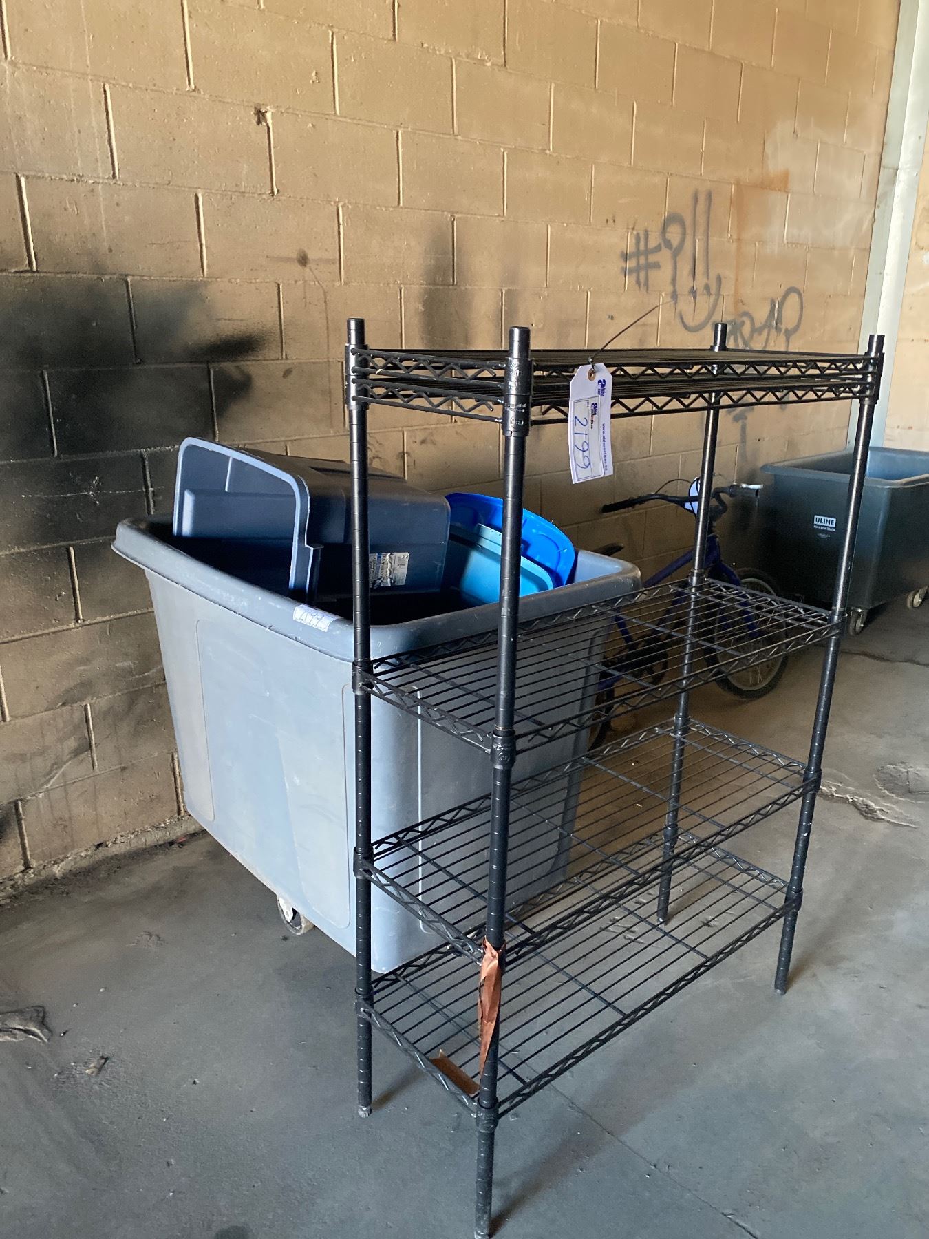 ROLLING BIN WITH TOTE CONTENTS, SMALL BLACK RACK (ROLLING BIN HAS CRACK IN BOTTOM)