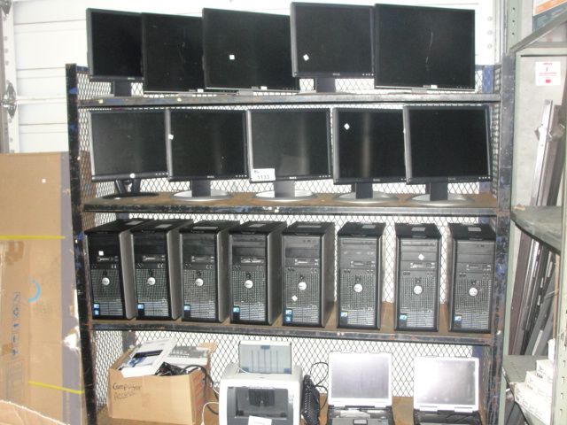 ROLLING CART FILLED WITH ASSORTED DELL COMPUTER TOWERS, MONITORS AND ASSORTED PARTS AND 2 PANASONIC TUFF BOOK LAPTOPS (ROLLING CART NOT INCLUDED)