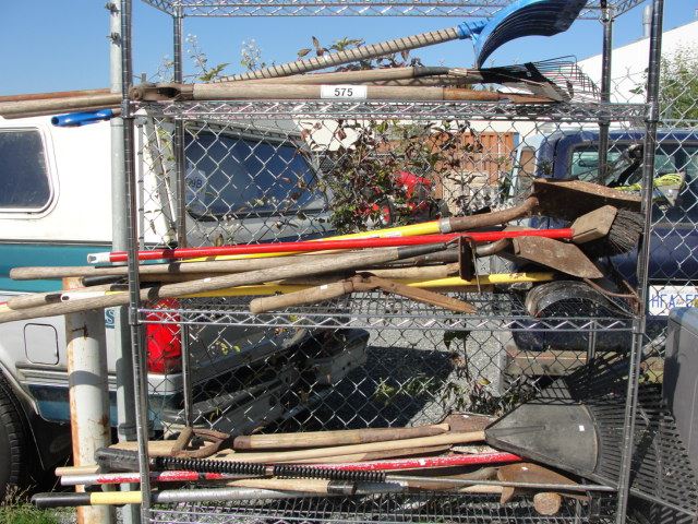 ROLLING CART FILLED WITH ASSORTED GARDEN TOOLS; SHOVELS, RAKES, HOES, ETC * ROLLING CART NOT