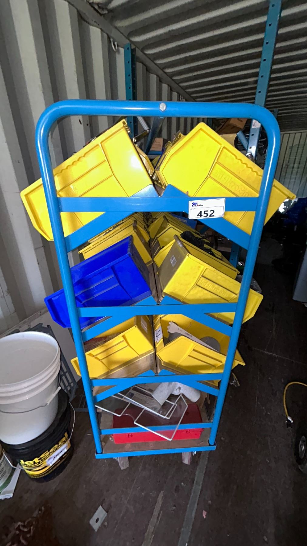 ROLLING CART ON WHEELS WITH BINS LOCATED IN CONTAINER. INC CONTENTS. NUTS AND BOLTS, HINGES, ELECTRICAL COMPONENTS, GARDEN HOSE CONNECTORS, ETC