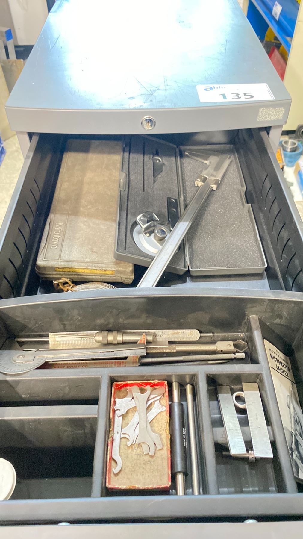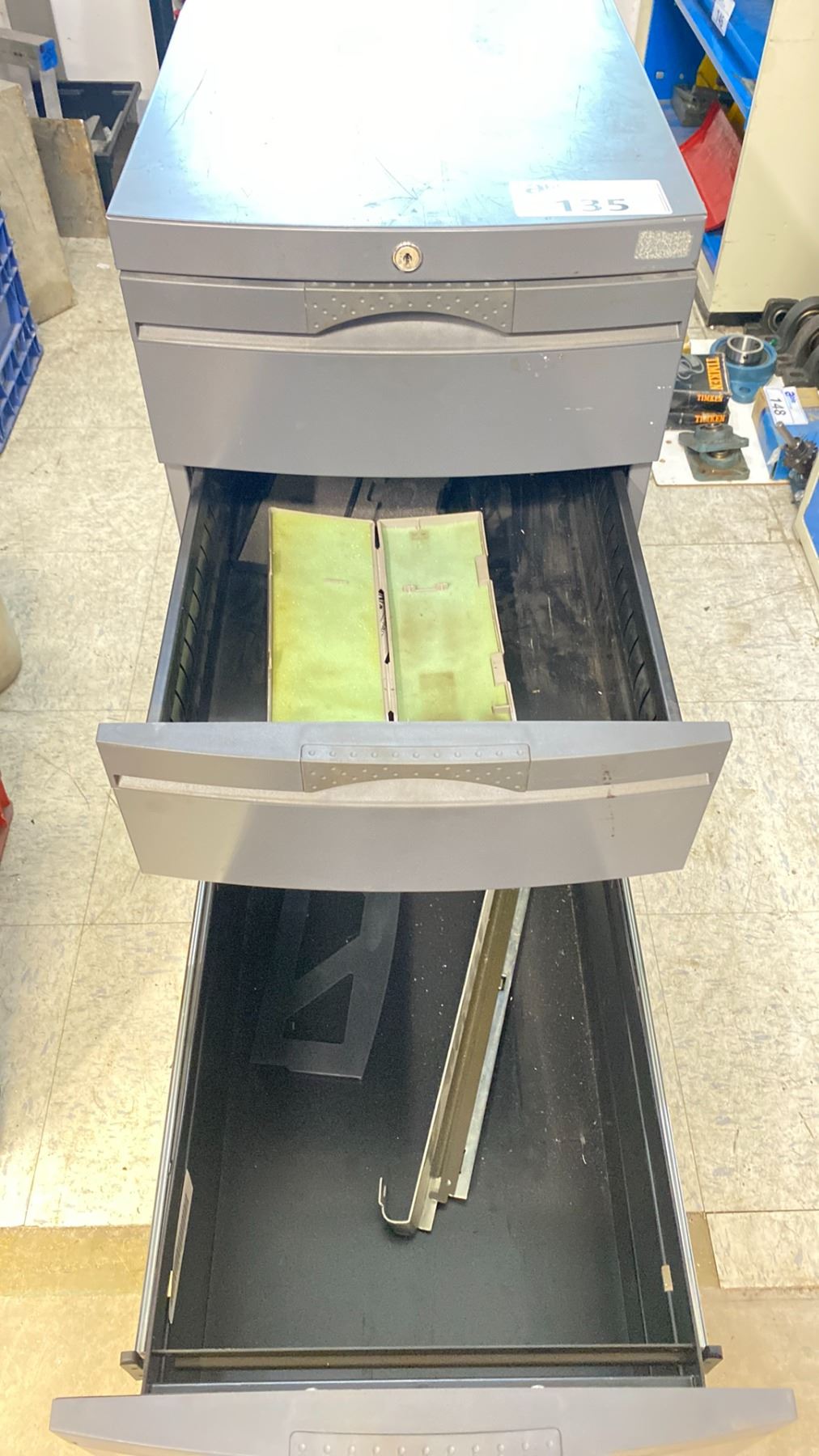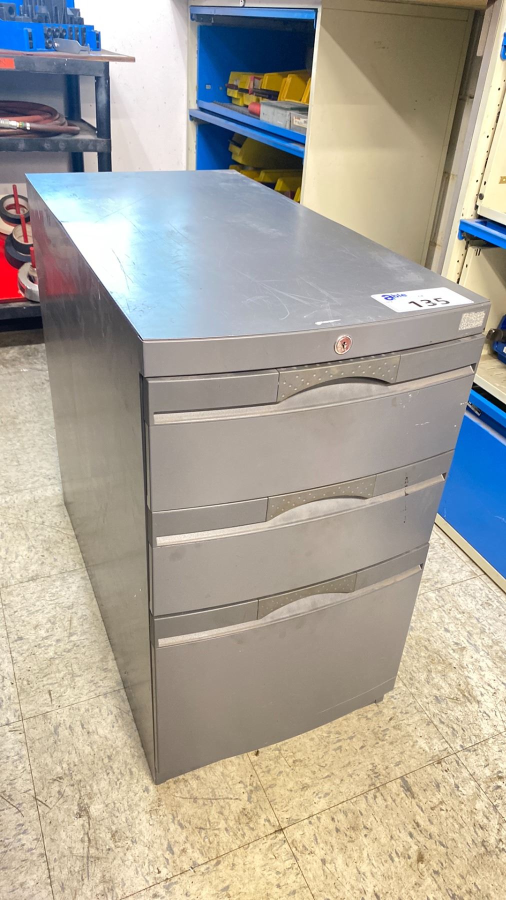 ROLLING GREY METAL 3 DRAWER STORAGE CABINET WITH CONTENTS 15 1/2"L X 29"W X 28"H
