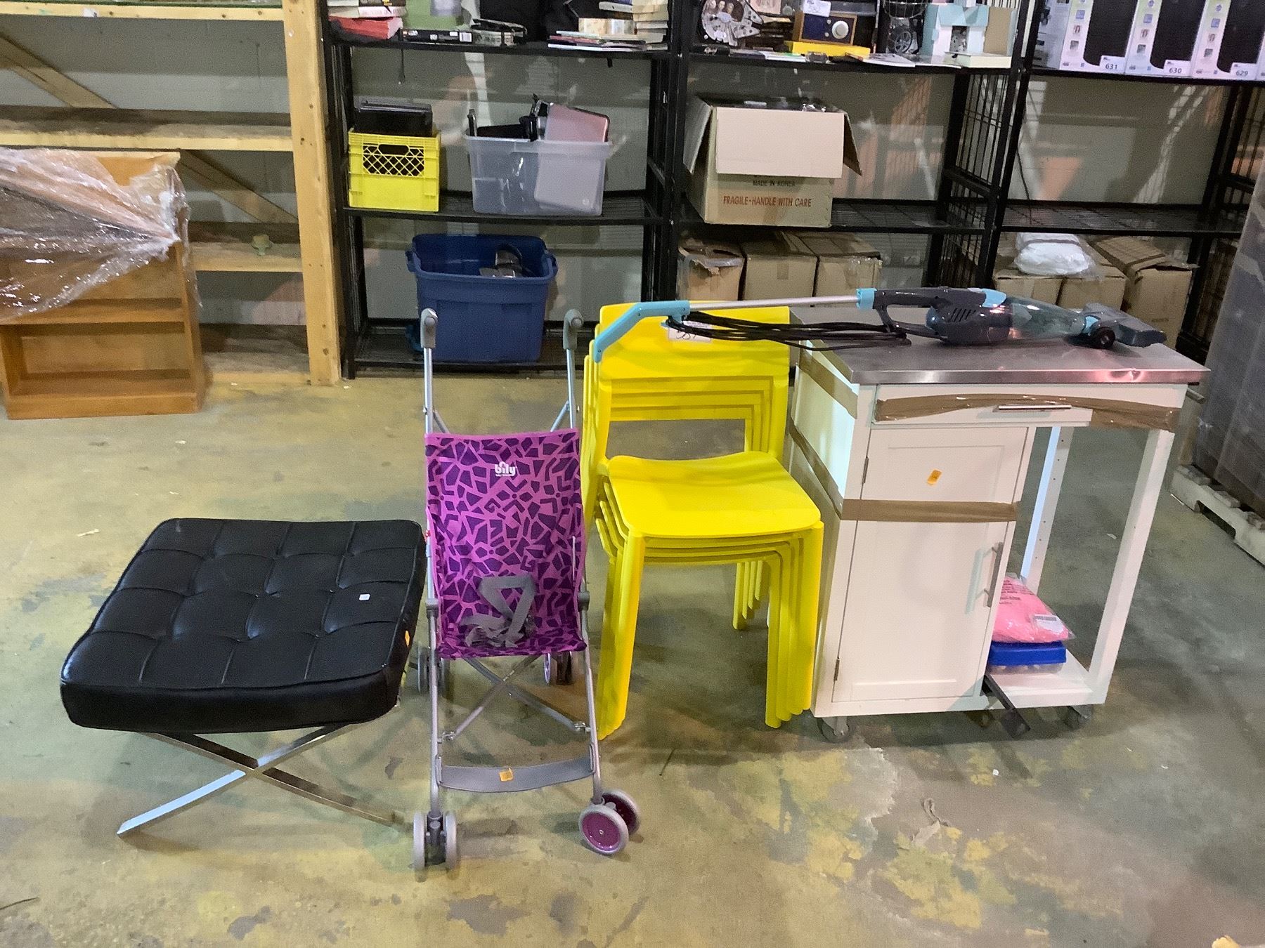ROLLING KITCHEN ISLAND, 4 MATCHING CHAIRS, COLLAPSIBLE STROLLER AND OTTOMAN