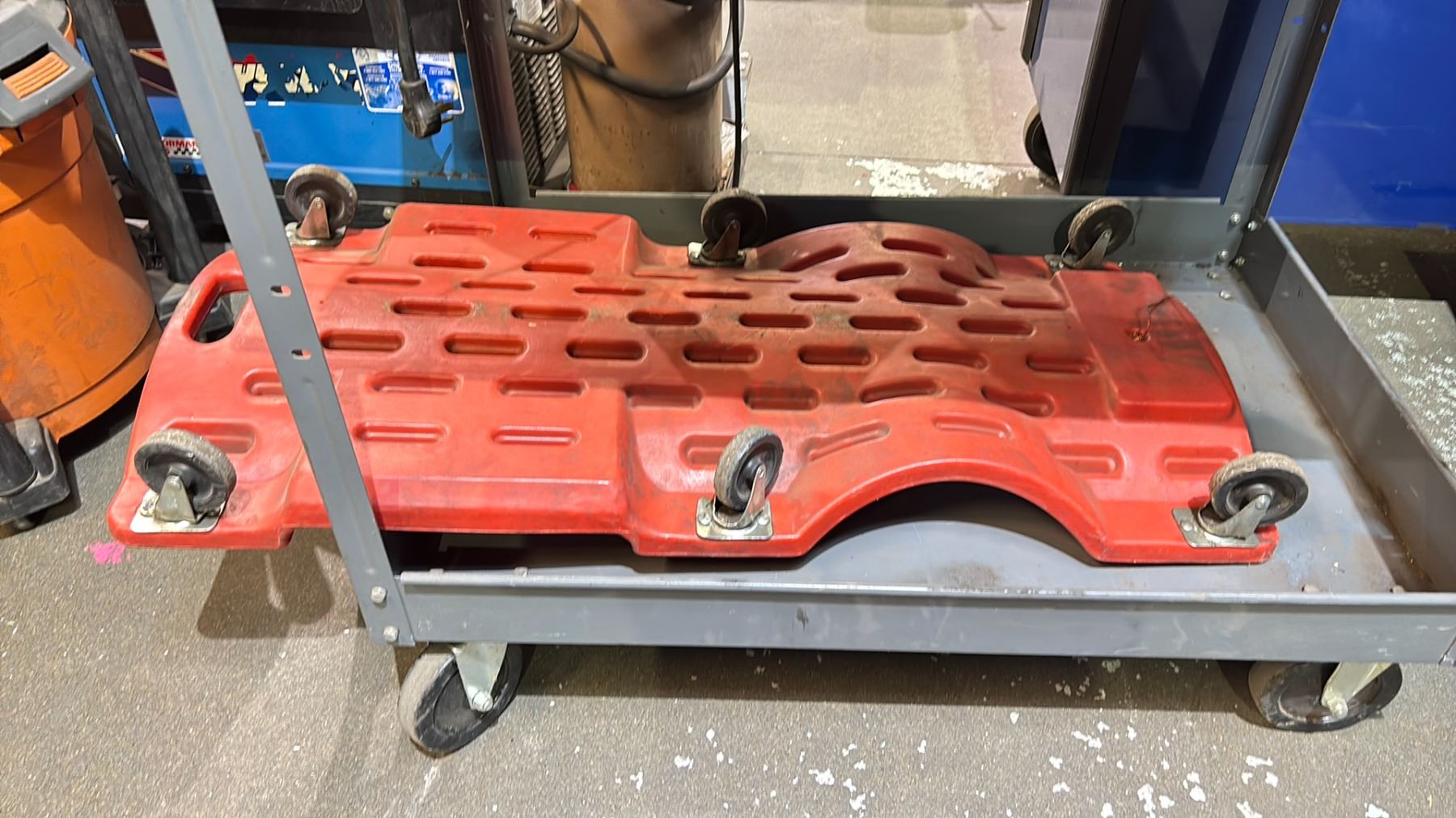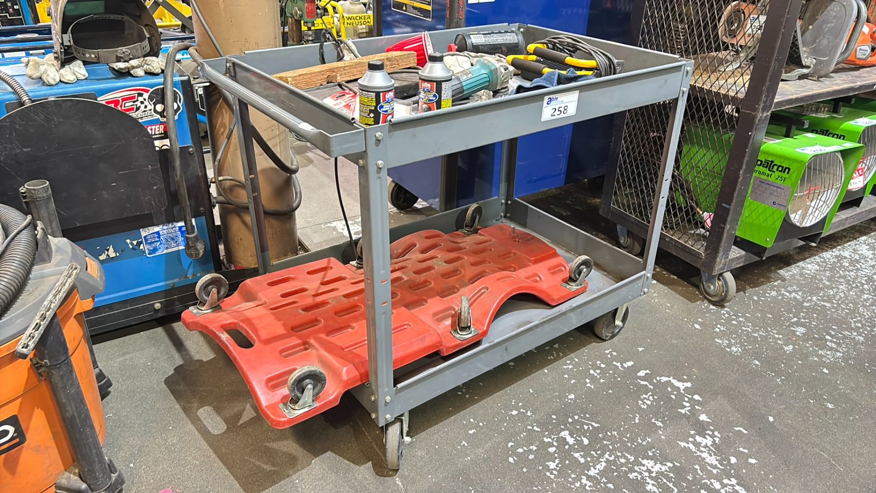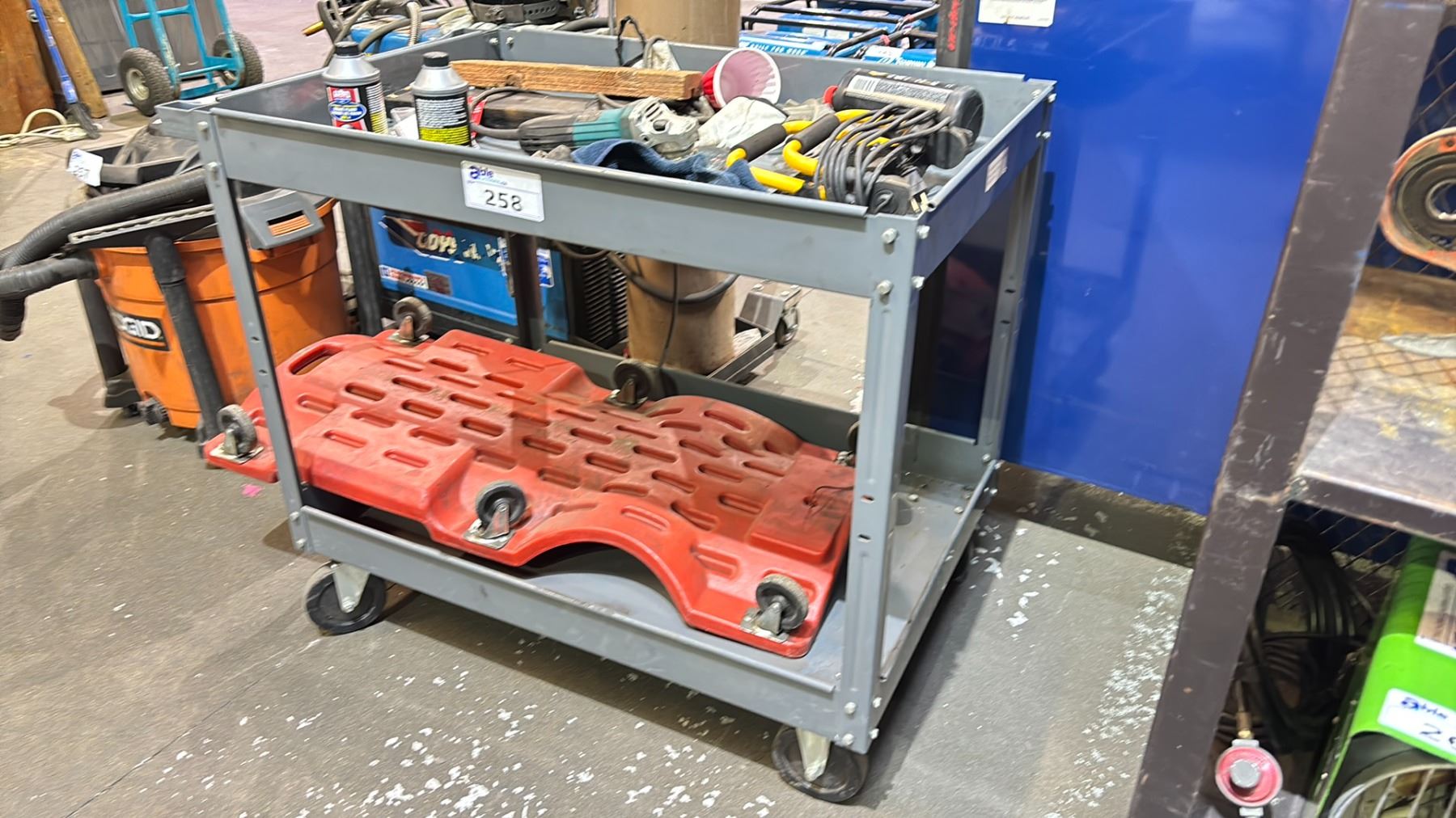 ROLLING METAL CART (APPROX. 39" W X 32" T X 25" D) WITH TOOLS & CREEPER